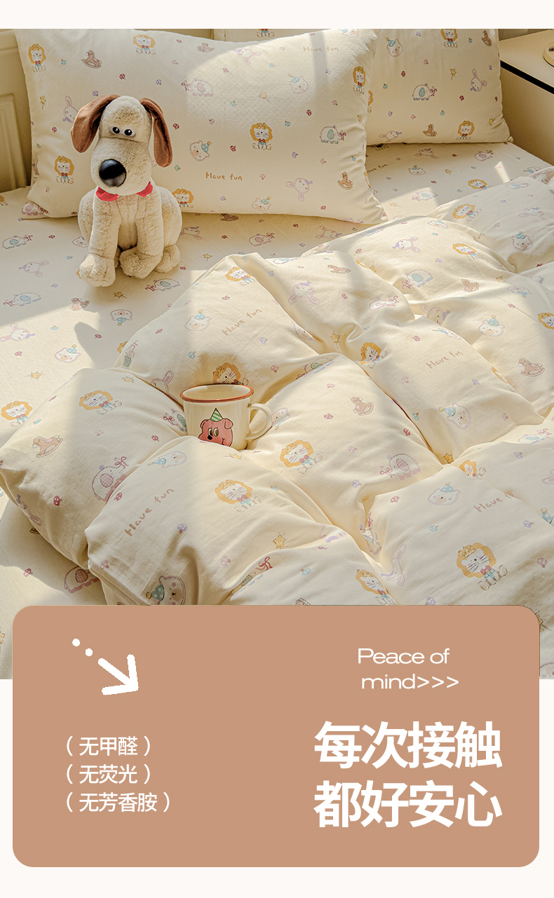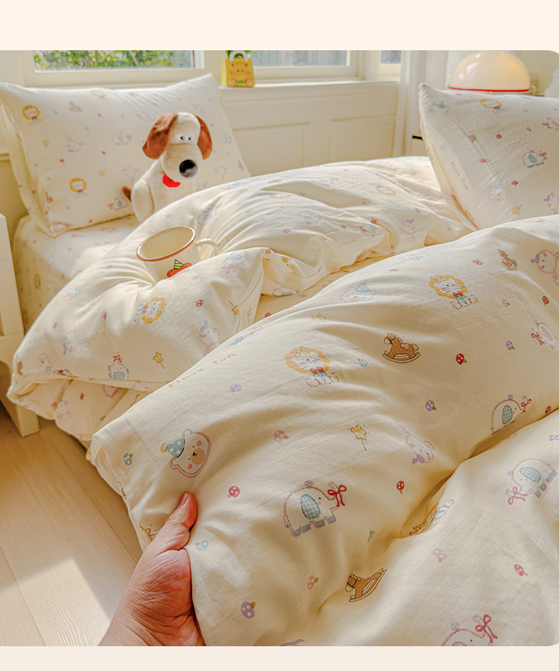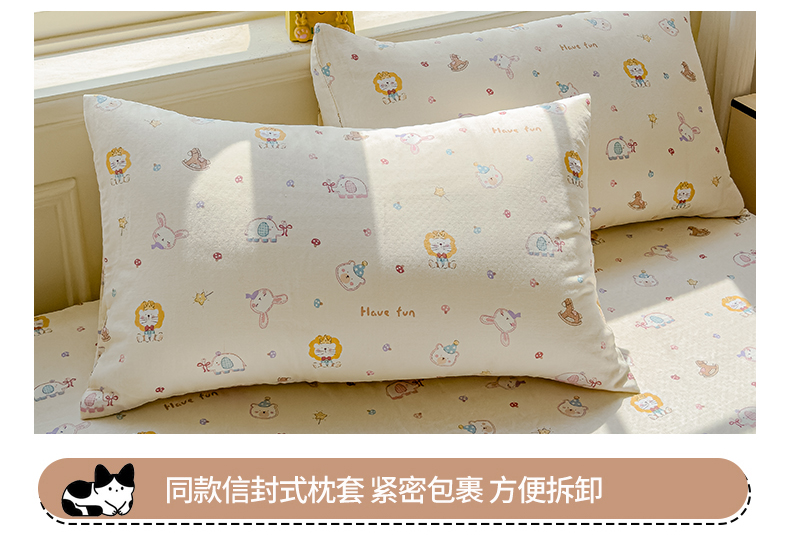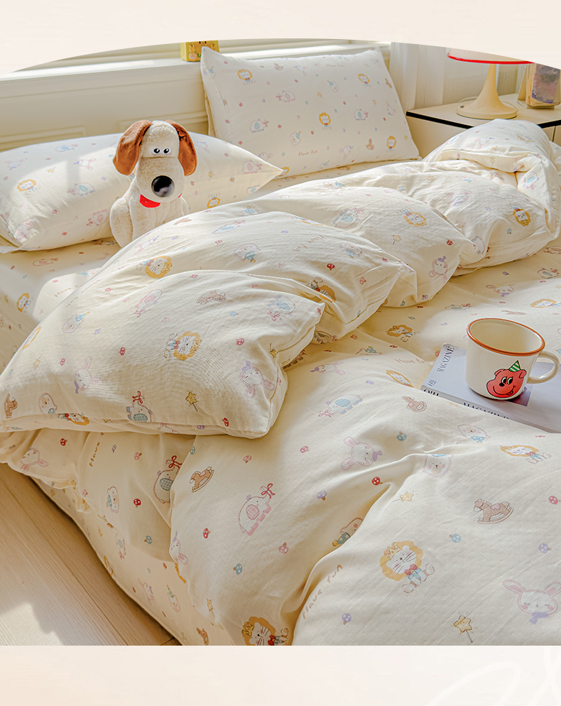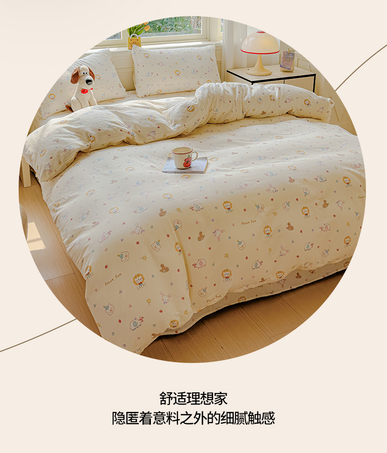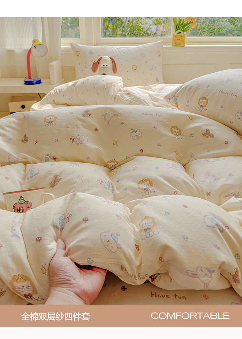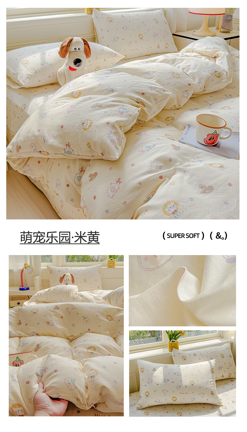 当前位置: 91家纺网 > 商品网购 > 床品套件 > 四件套 > 双层纱四件套 > 感遇家纺 2026春夏新款双层纱全棉纯棉系列四件套-第一批 萌宠乐园·米黄