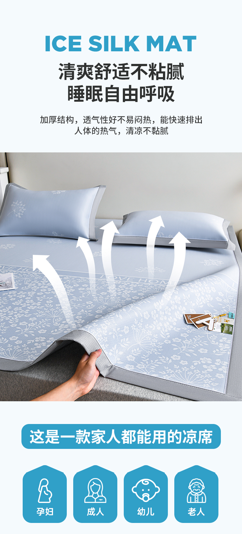 (总)小牛席业 2026春夏新款【实拍风格】PE凉感小碎花提花冰丝席凉席席子(床笠款),灰色,粉色,蓝色,抹茶,香槟