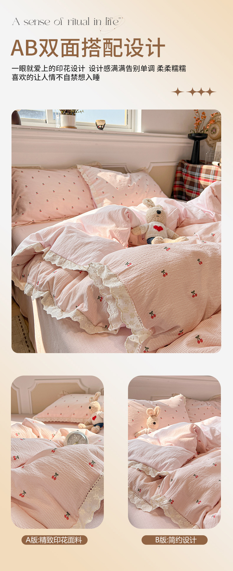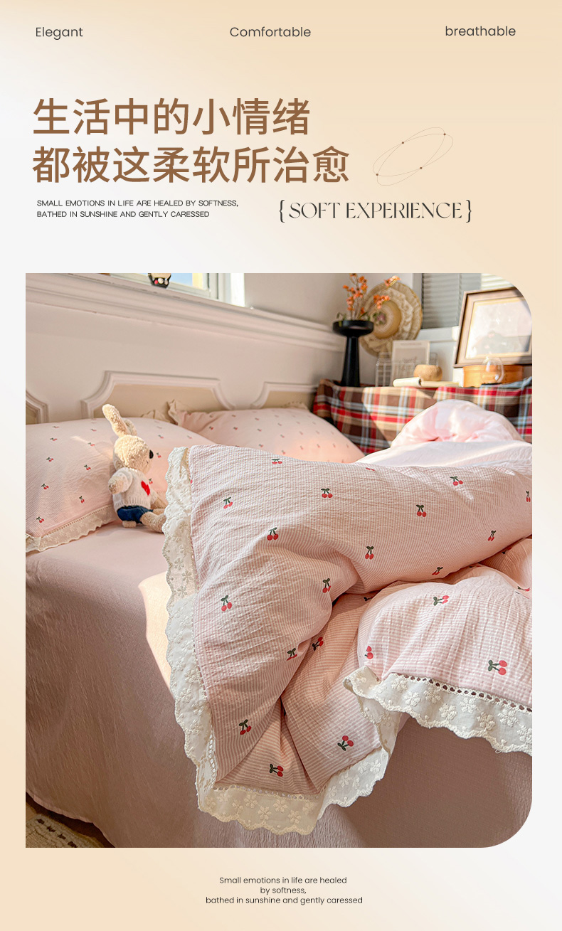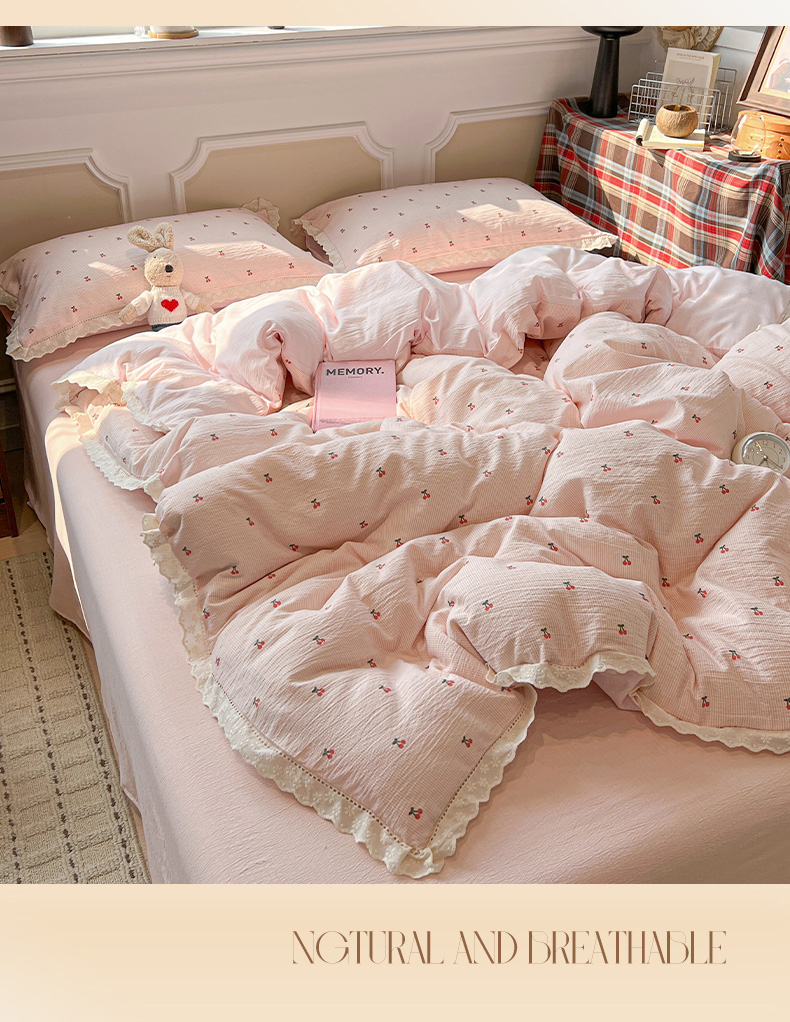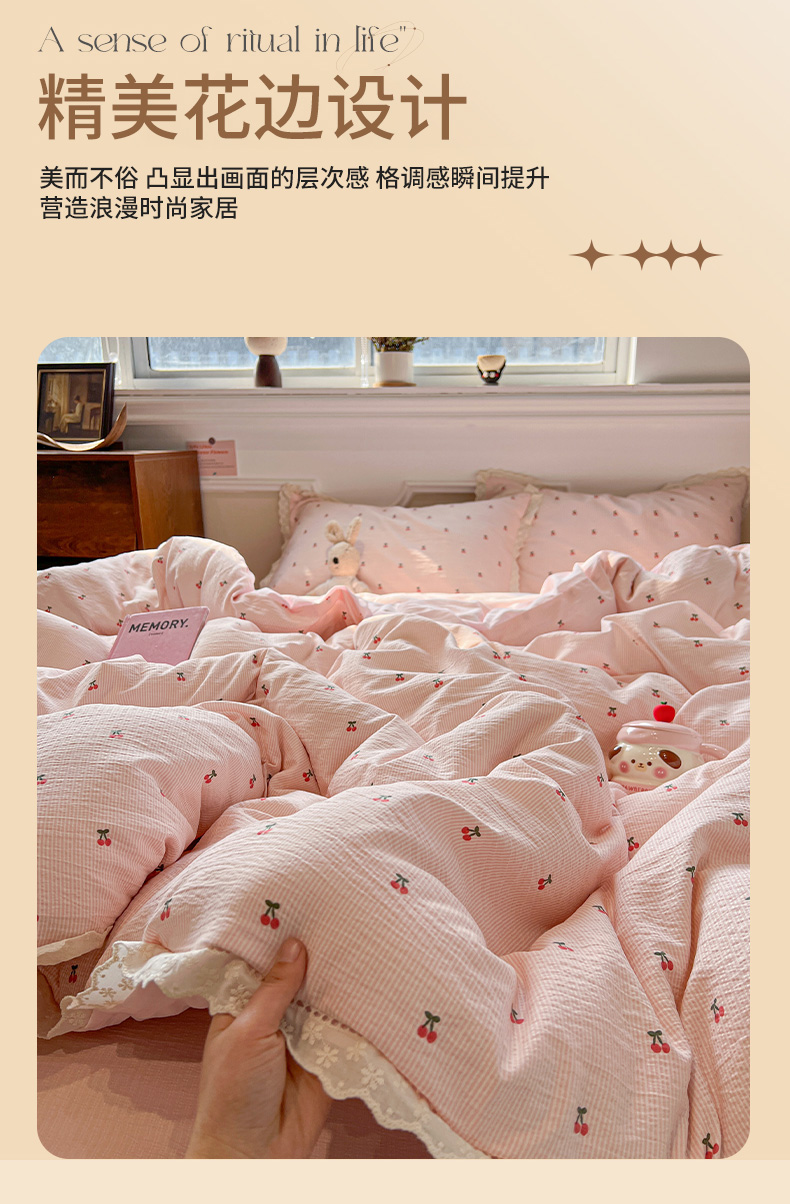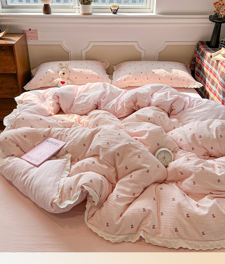 • 91家纺网 家纺一手货源 找家纺 繁花家居 2026镂空花边系列夏被夏凉被空调被高克重木棉泡芙棉软糯亲肤四件套学生三件套 樱遇温柔-粉