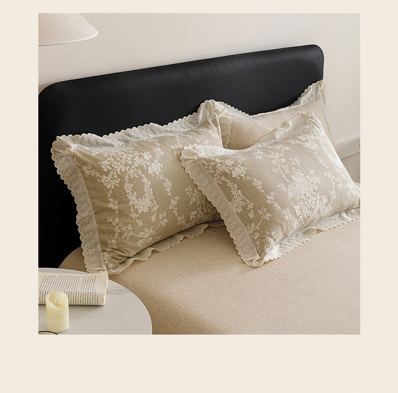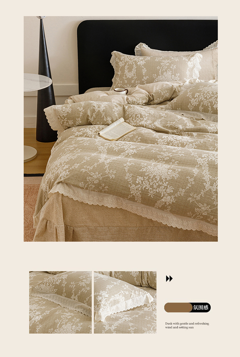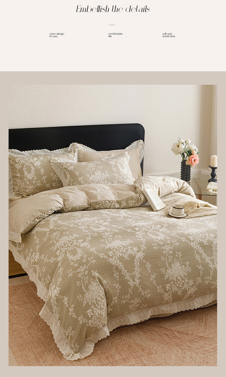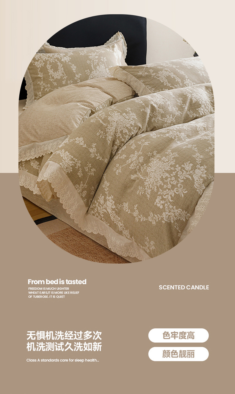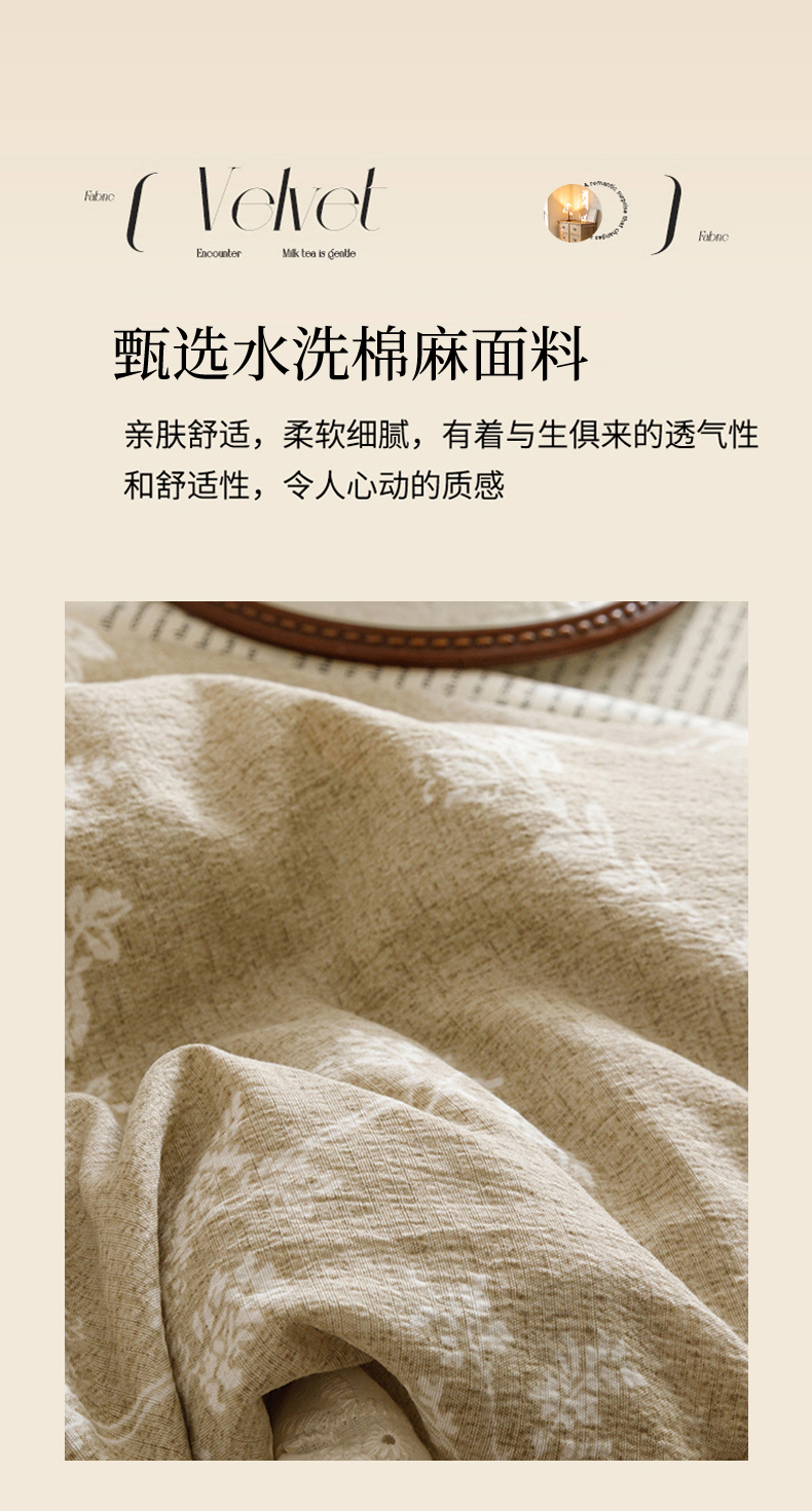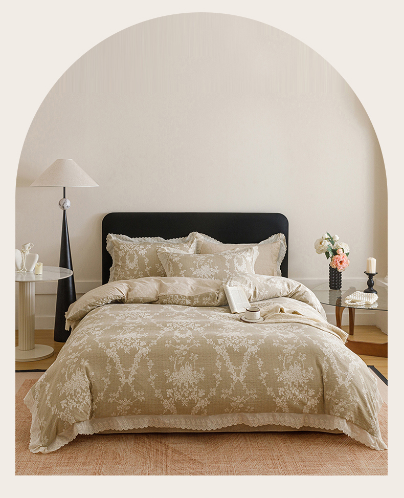 商品名称:悦然毛巾被 2026春夏新款加厚原麻水洗复古风四件套亚麻提花花边四件套 花梦缘