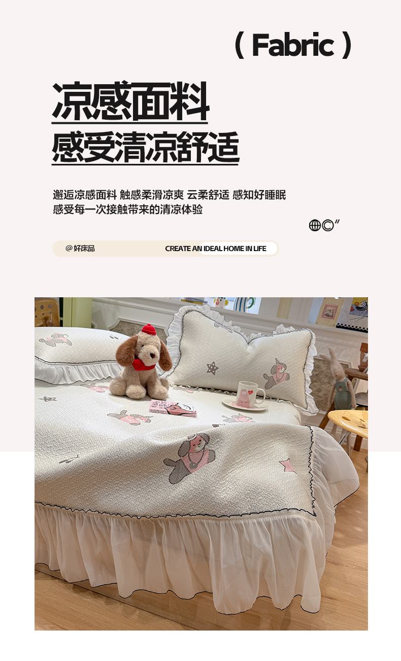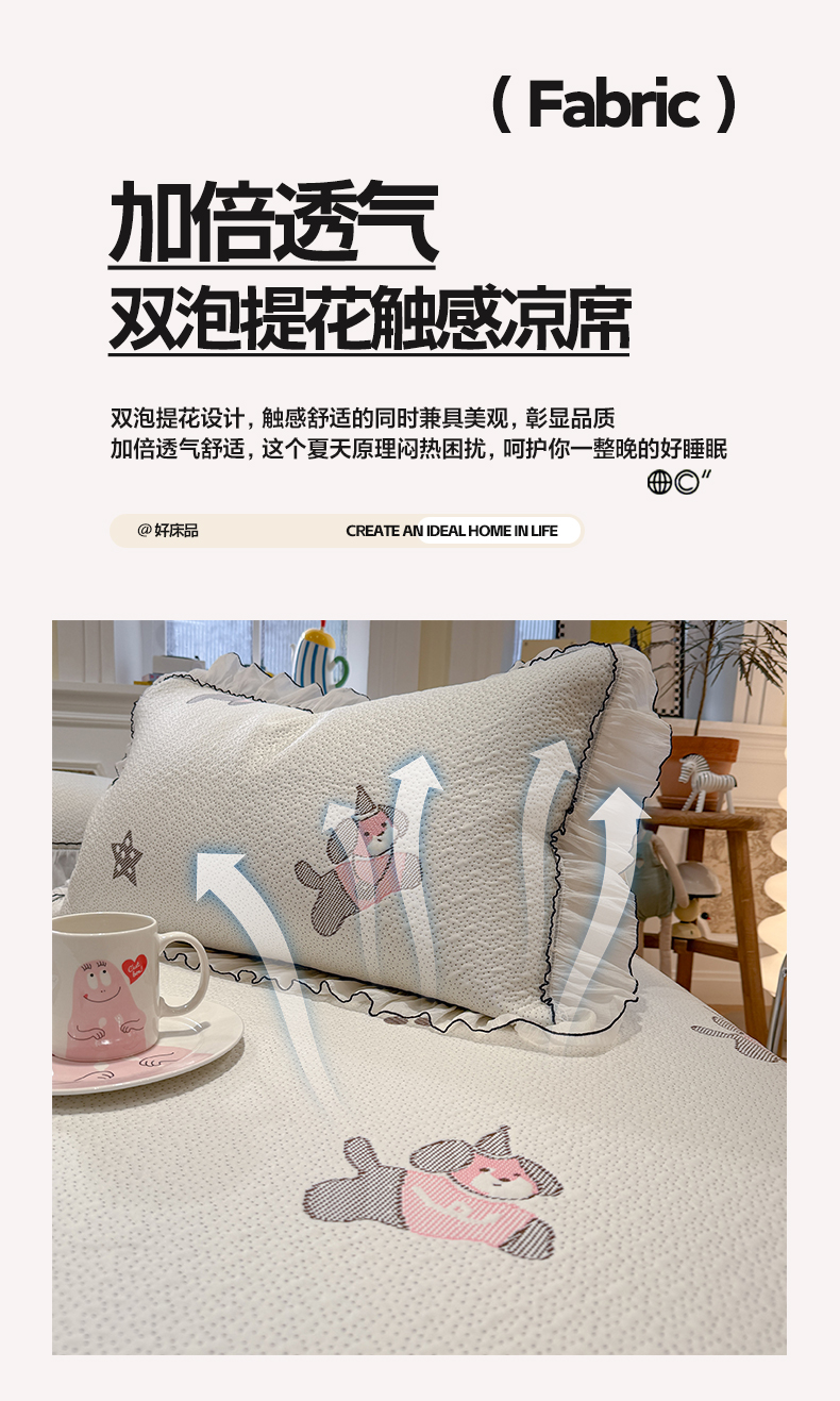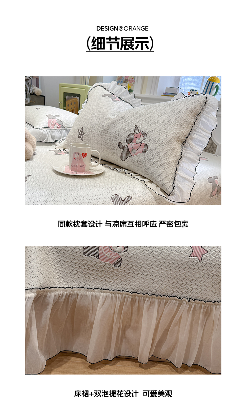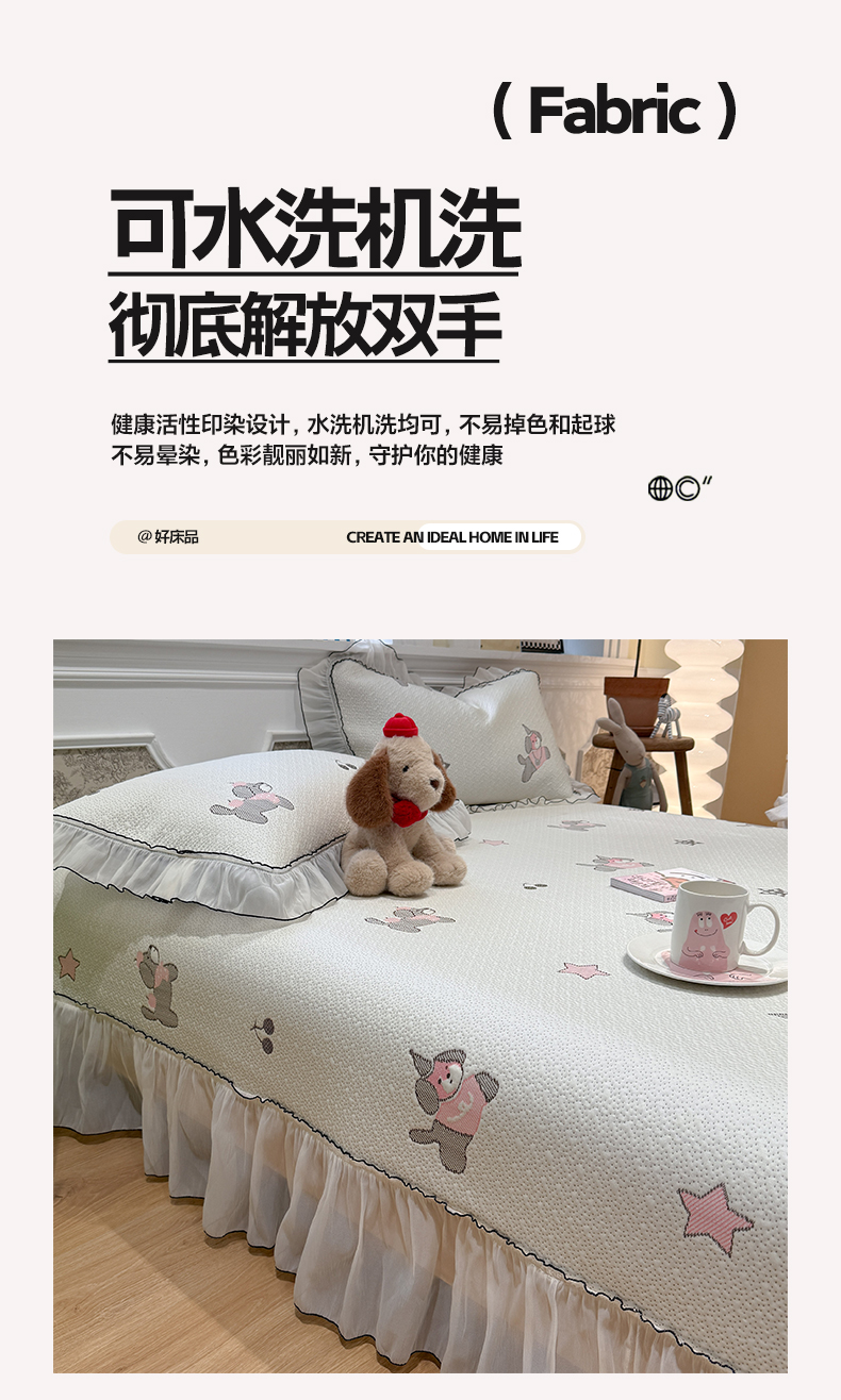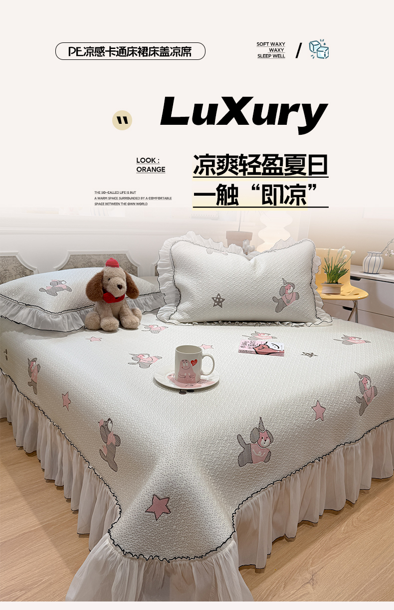 (总)雅居纺家纺 2026新款PE凉感卡通床裙床盖凉席韩版花边加厚三明治底PE凉感席,粉色猫咪家族,粉色星星腊肠狗,萌萌苹安果,汪星人,夏日苹果狗,幸运酷熊