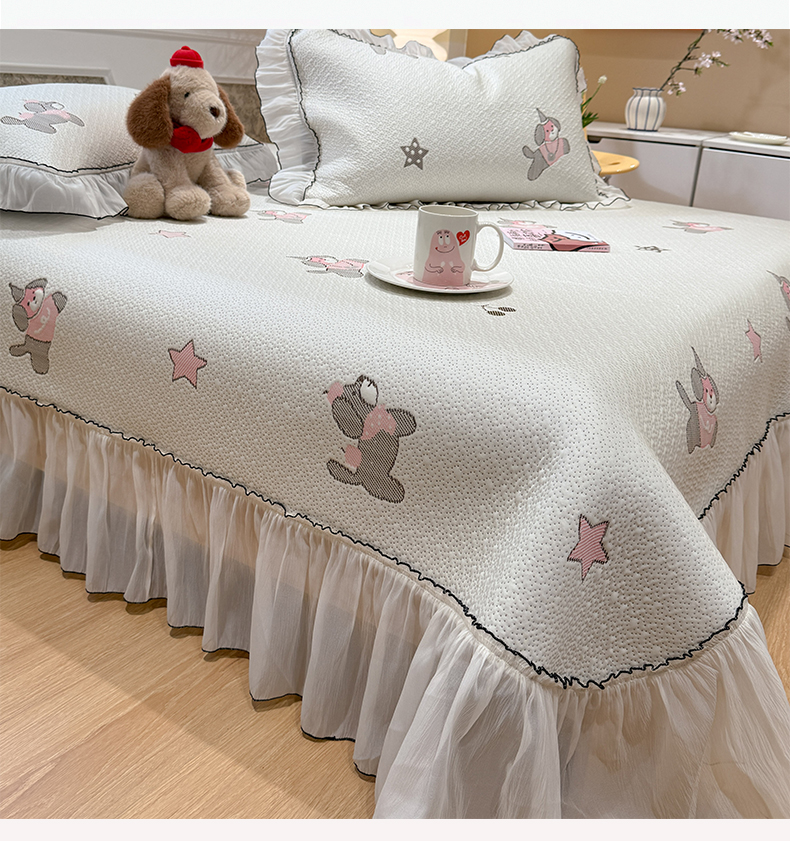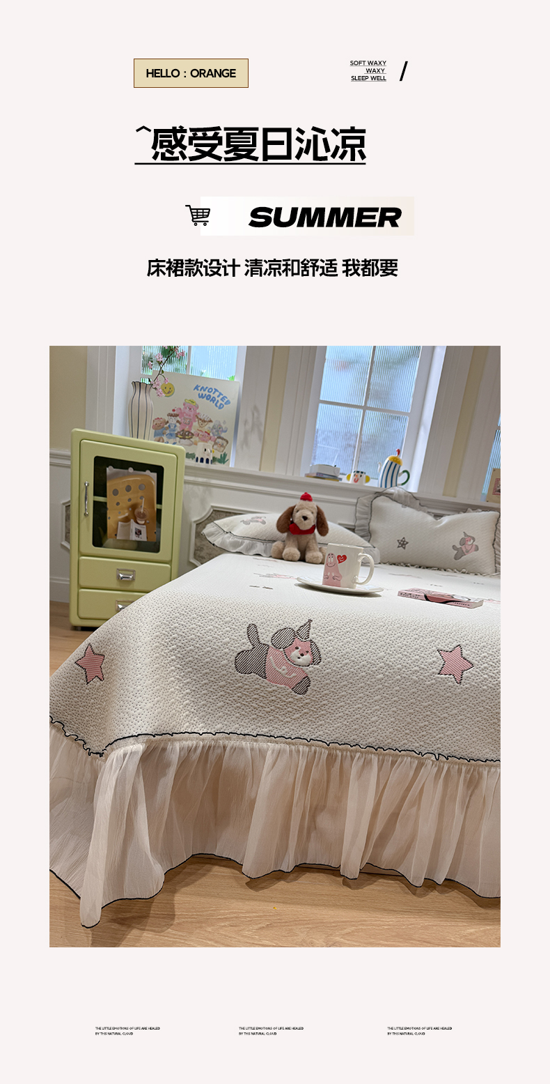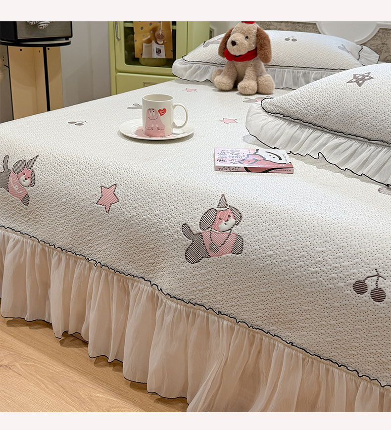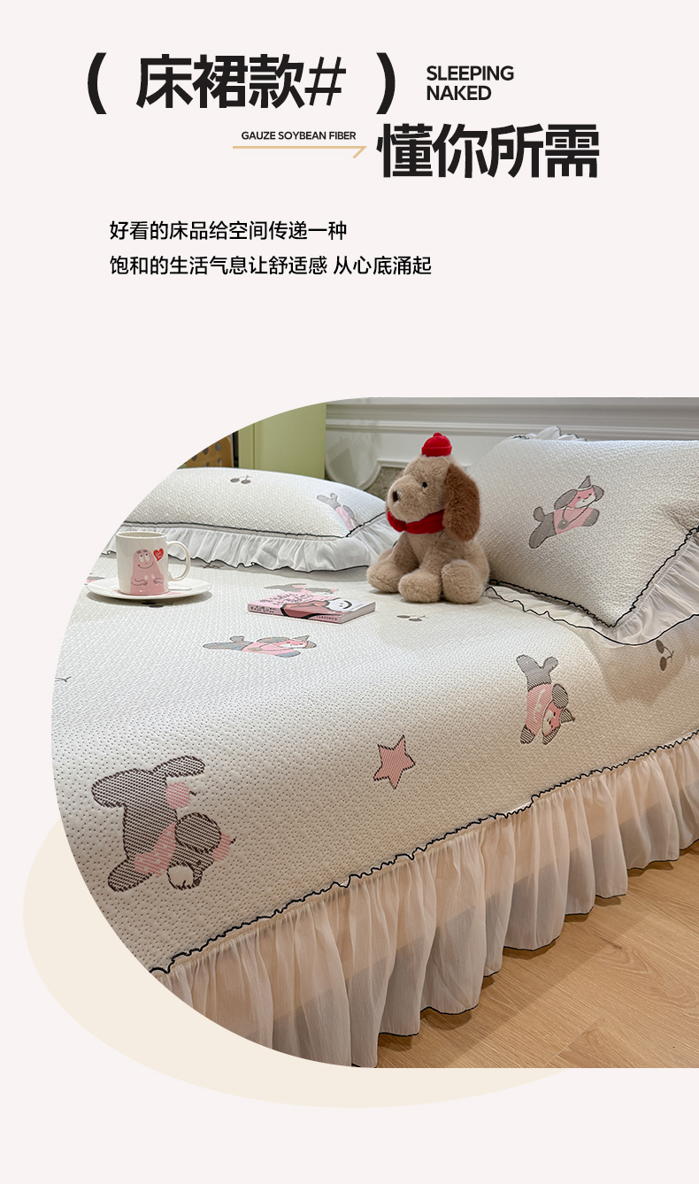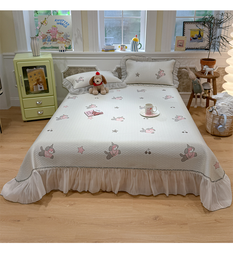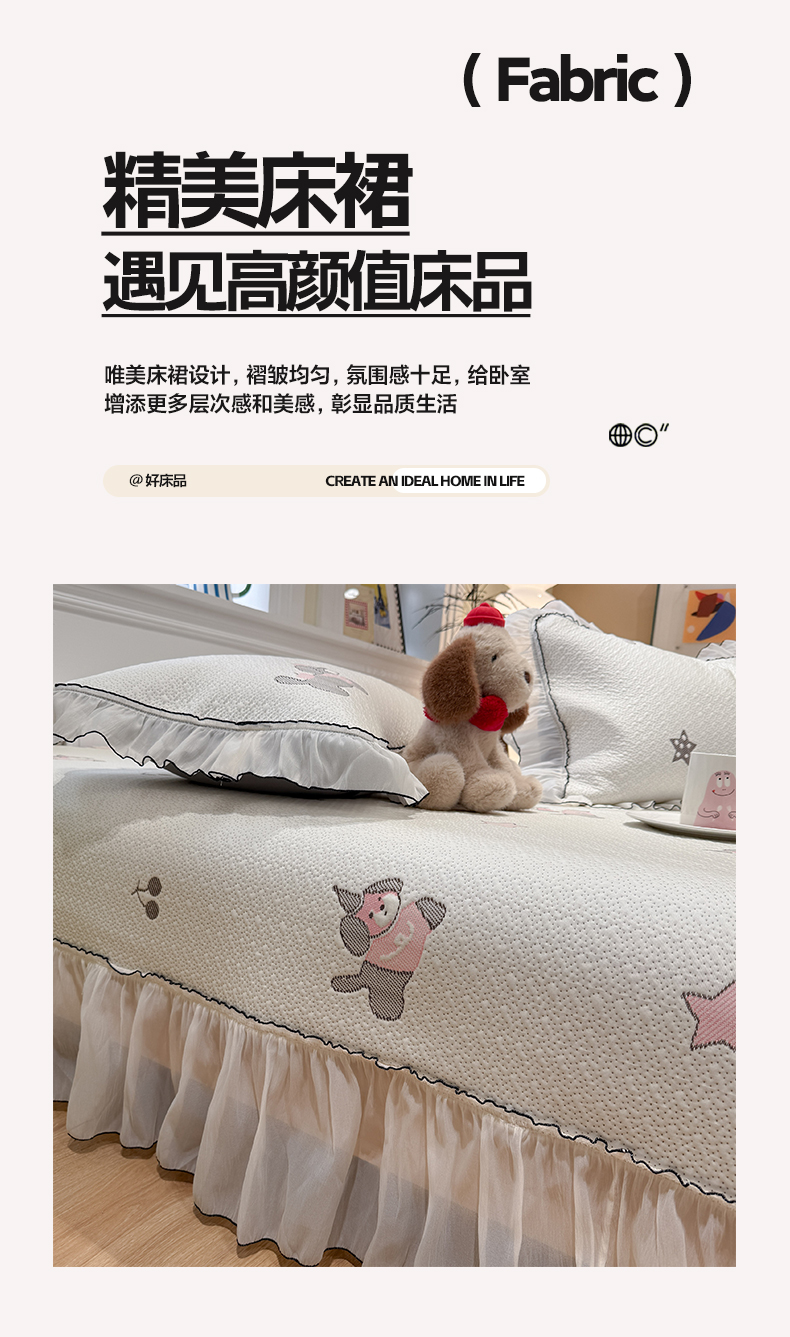 (总)雅居纺家纺 2026新款PE凉感卡通床裙床盖凉席韩版花边加厚三明治底PE凉感席,粉色猫咪家族,粉色星星腊肠狗,萌萌苹安果,汪星人,夏日苹果狗,幸运酷熊