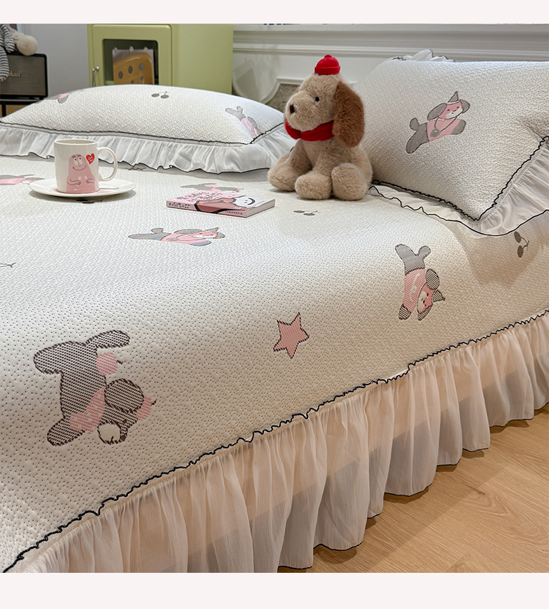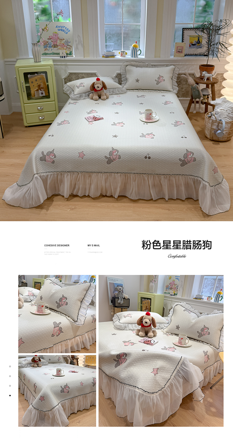 商品名称:雅居纺家纺 2026新款PE凉感卡通床裙床盖凉席韩版花边加厚三明治底PE凉感席 粉色星星腊肠狗