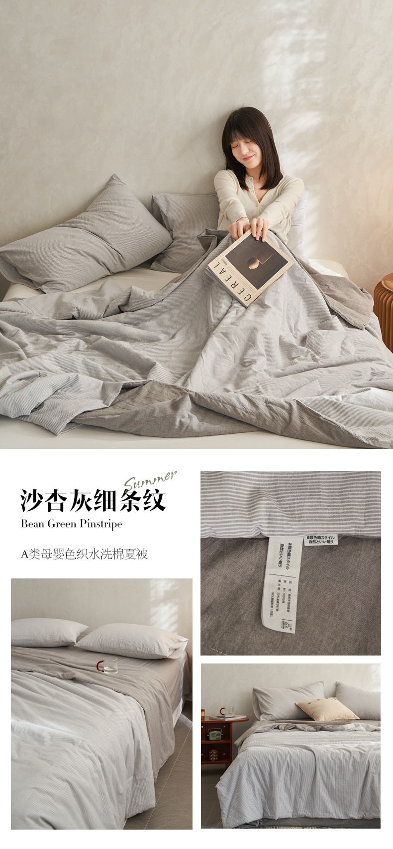 商品名称:千朵森 2026新款A类全棉色织水洗棉夏被夏被四件套 沙杏灰细条纹
