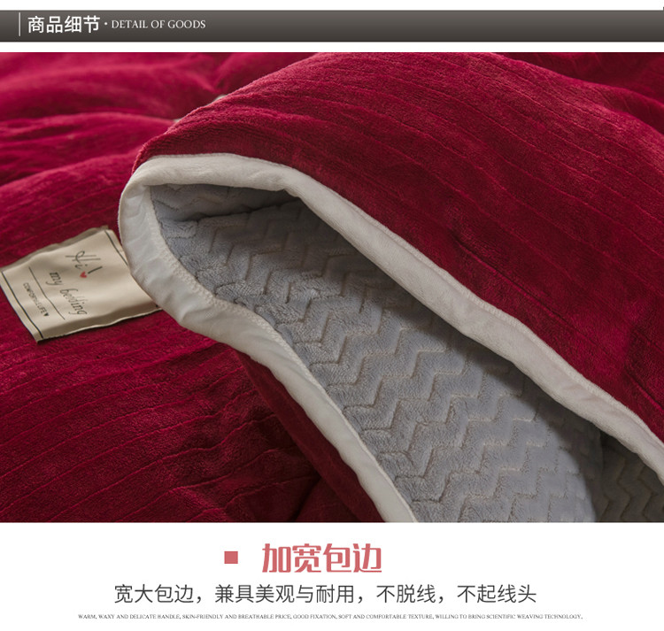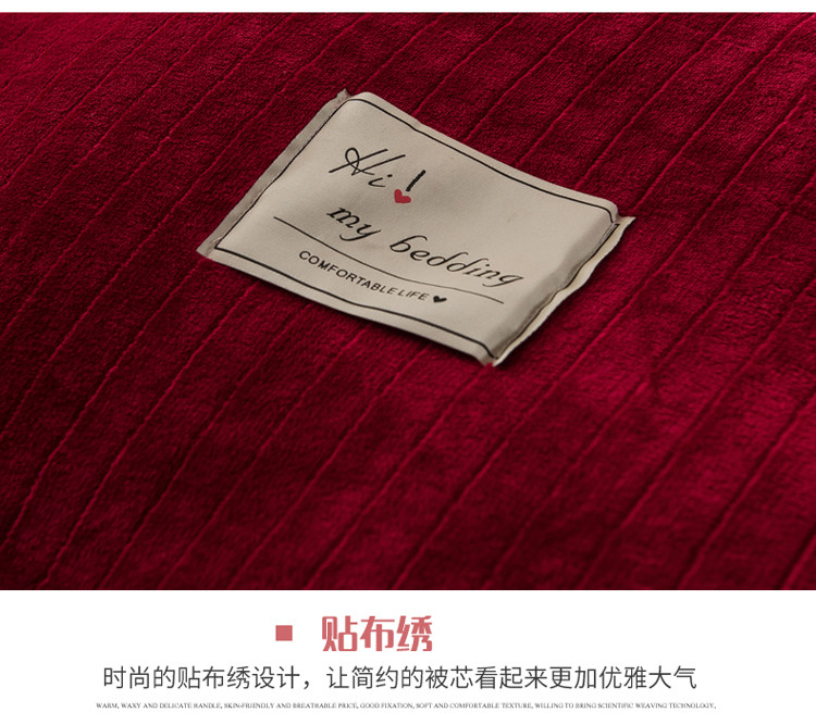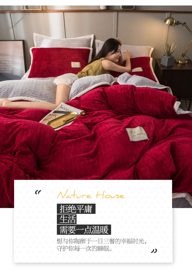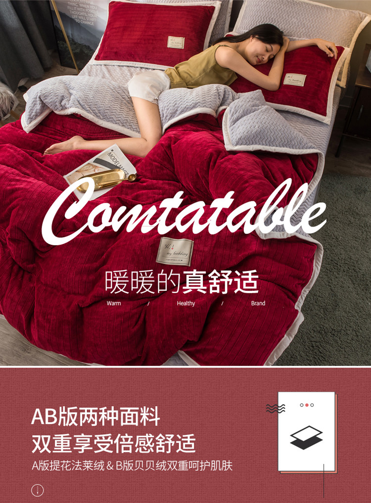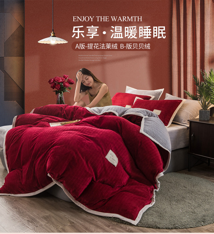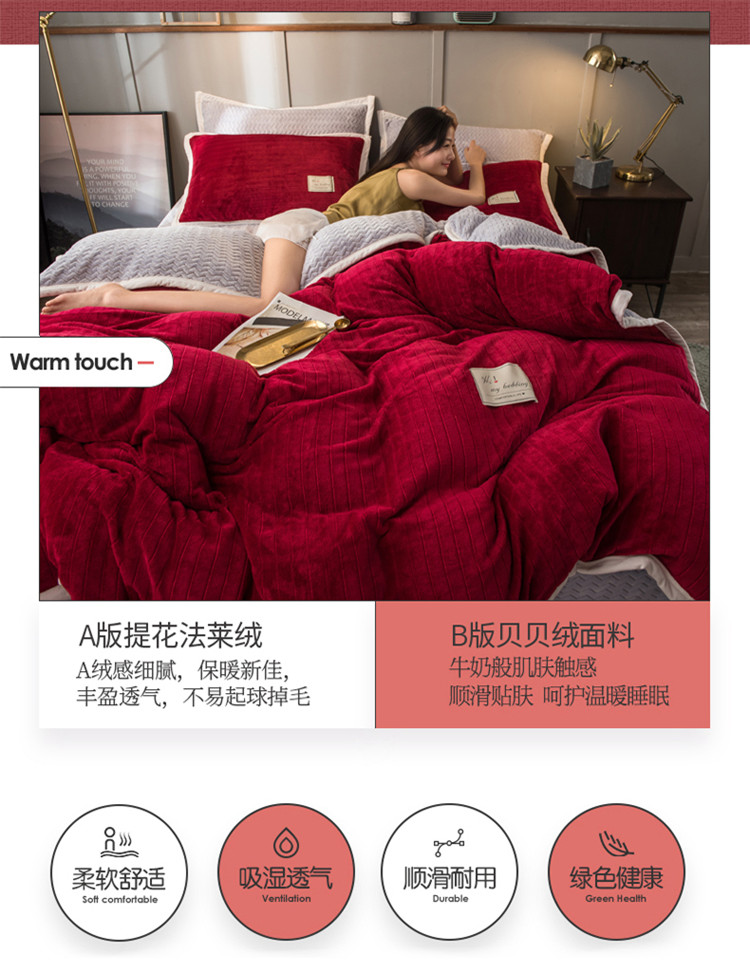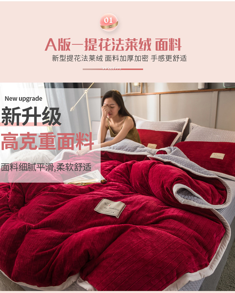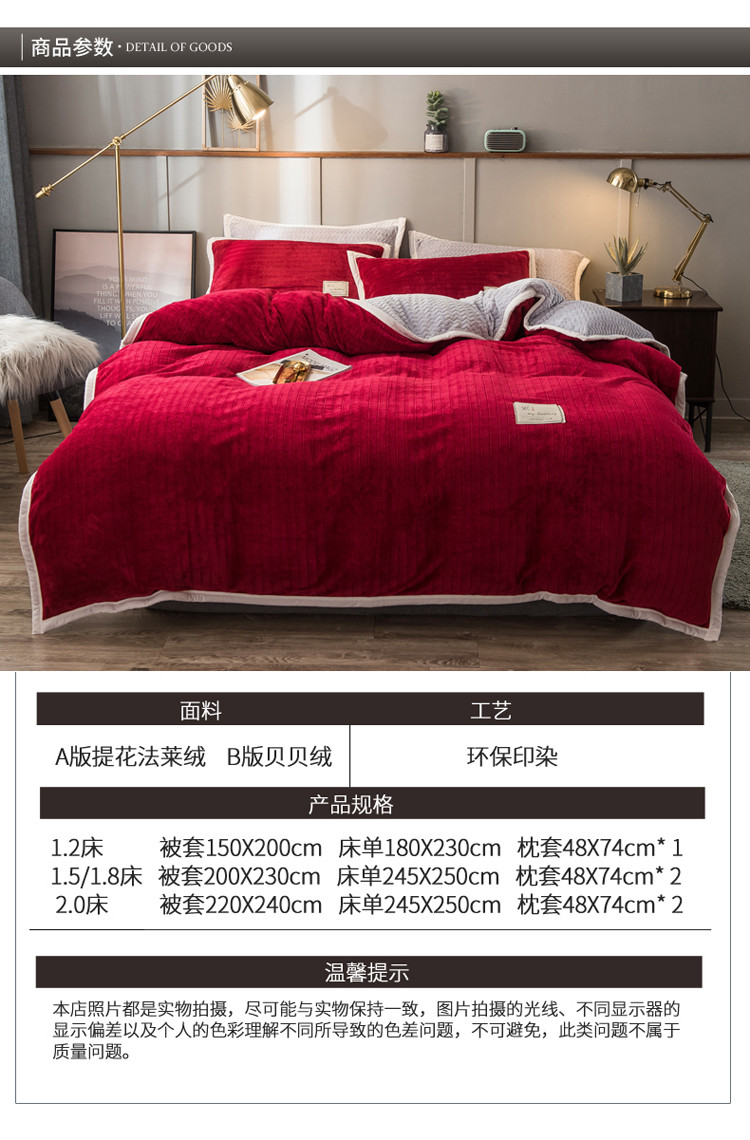 商品名称:欧冠 2019提花法莱绒加贝贝绒加厚四件套 喜庆红灰