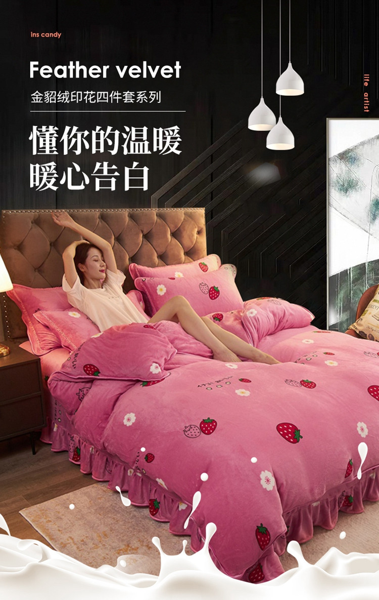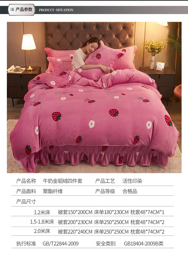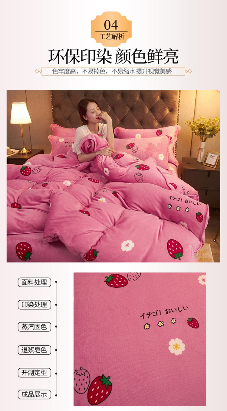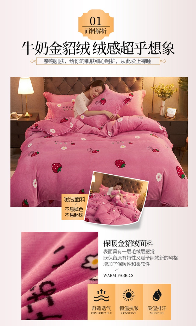 商品名称:爱洛牛奶绒宝宝绒水晶绒法莱绒金貂绒四件套 草莓甜心