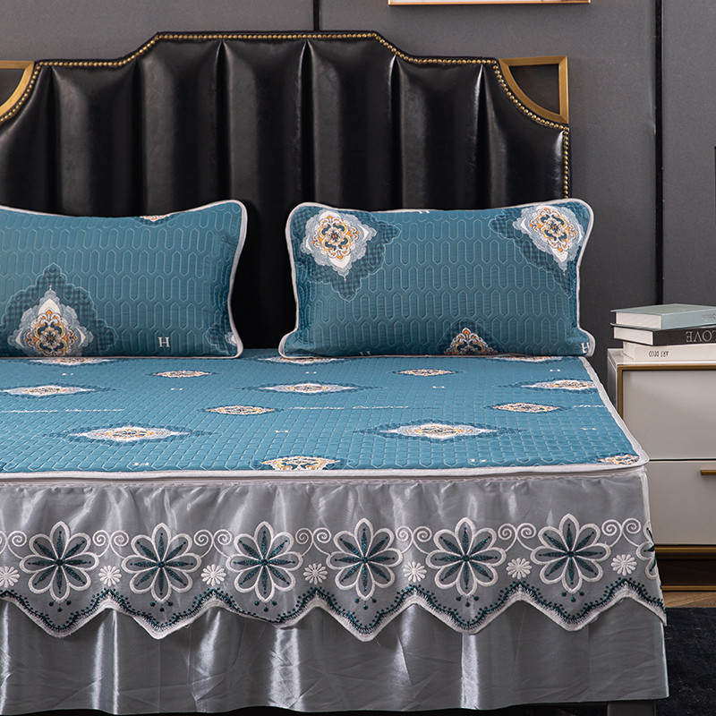 纽缦家纺 2021新款凉感丝乳胶凉席可拆卸床裙款三件套 英伦风情(兰)