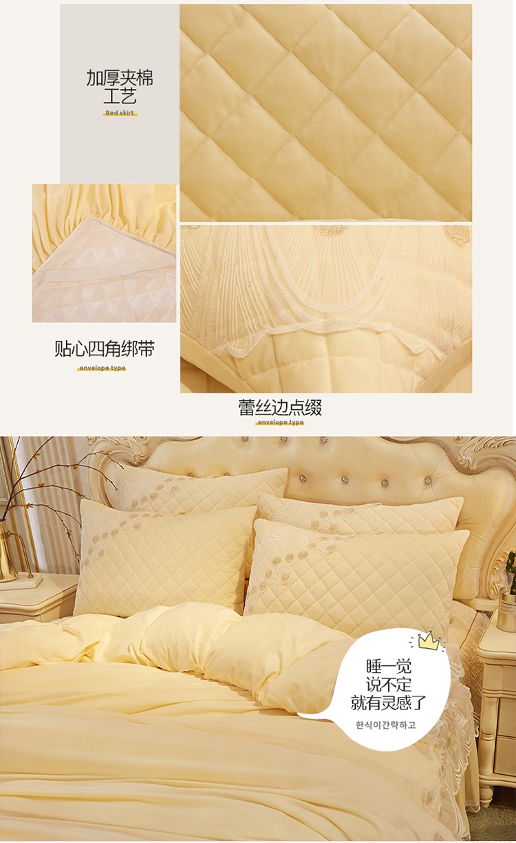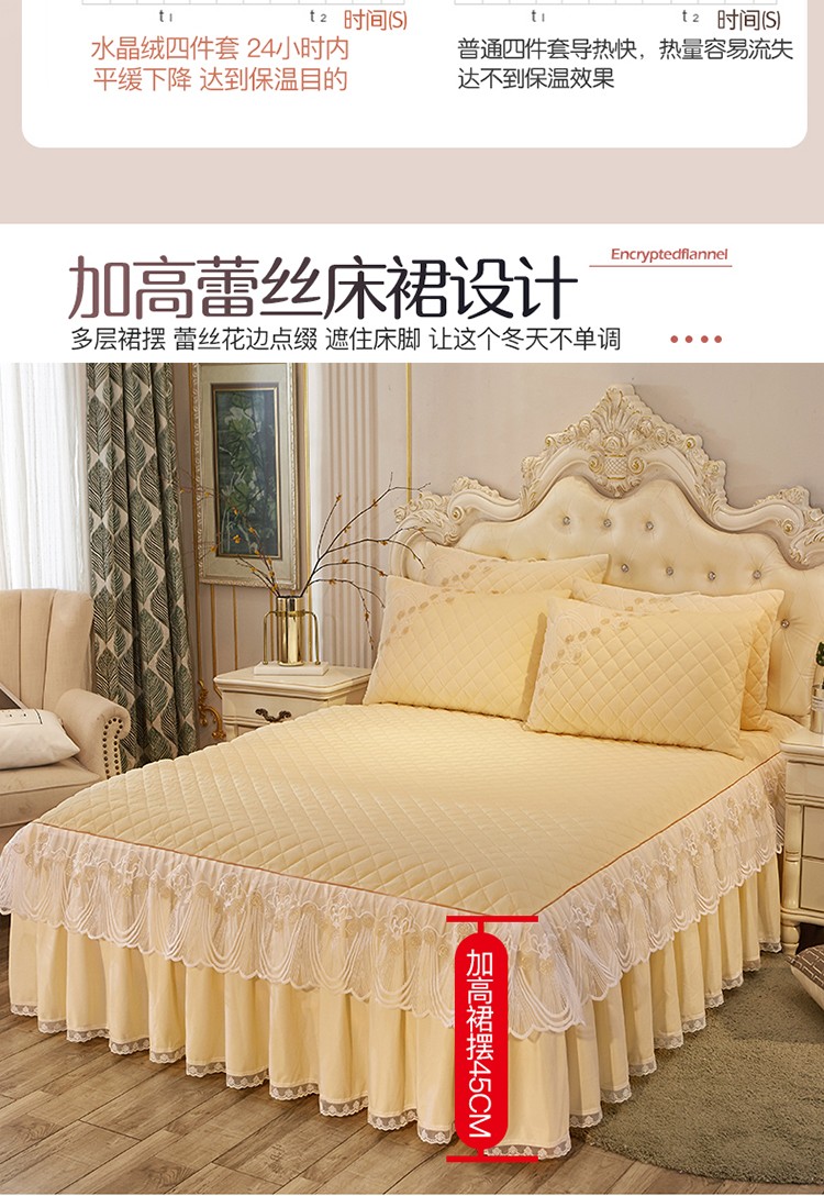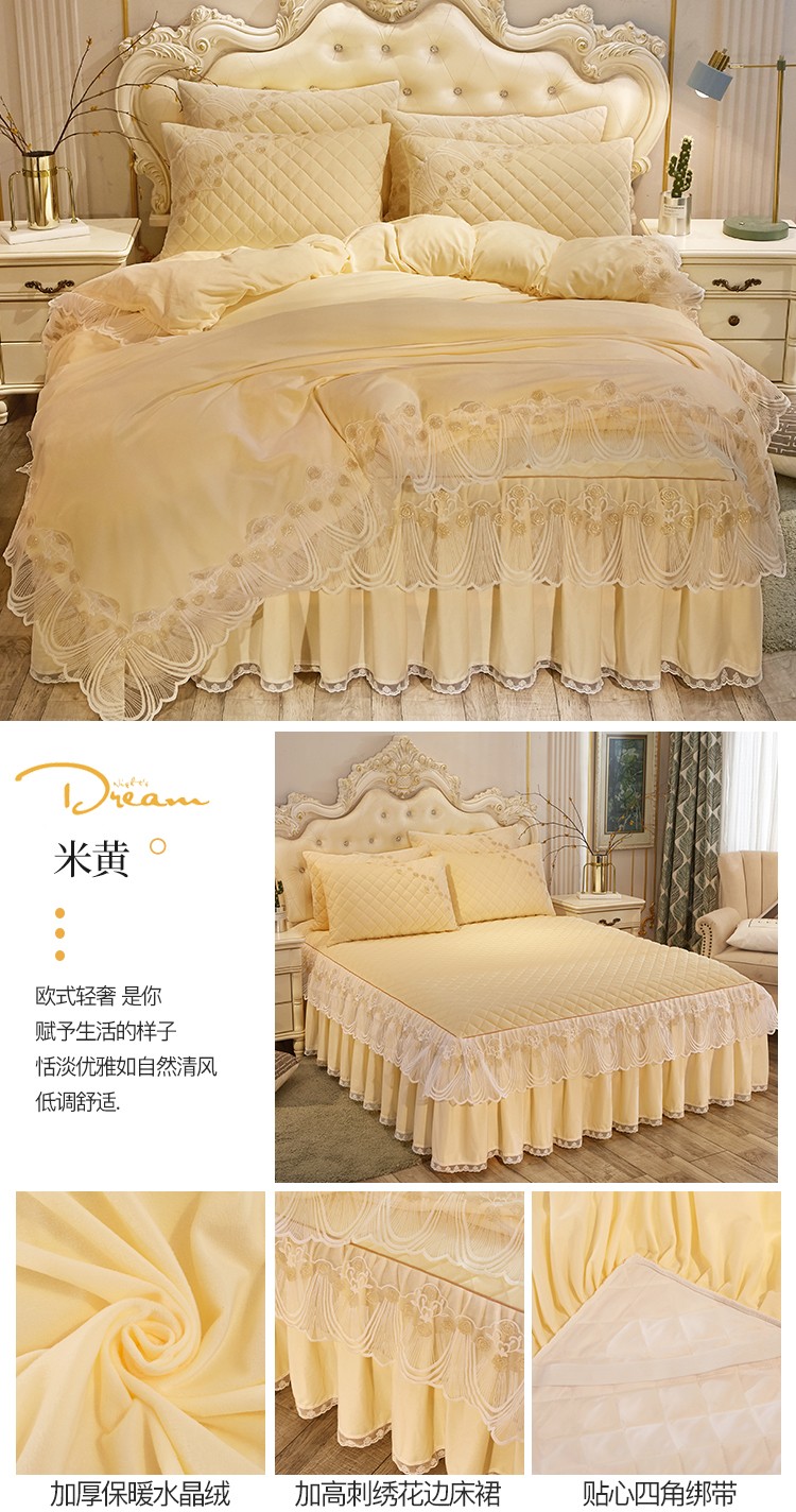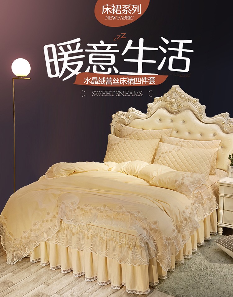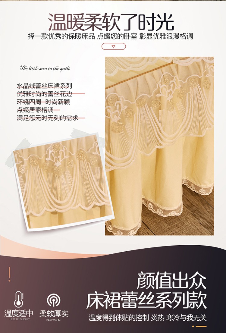 商品名称:网红馆 2025新款幸福花开水晶绒蕾丝床裙四件套 米黄