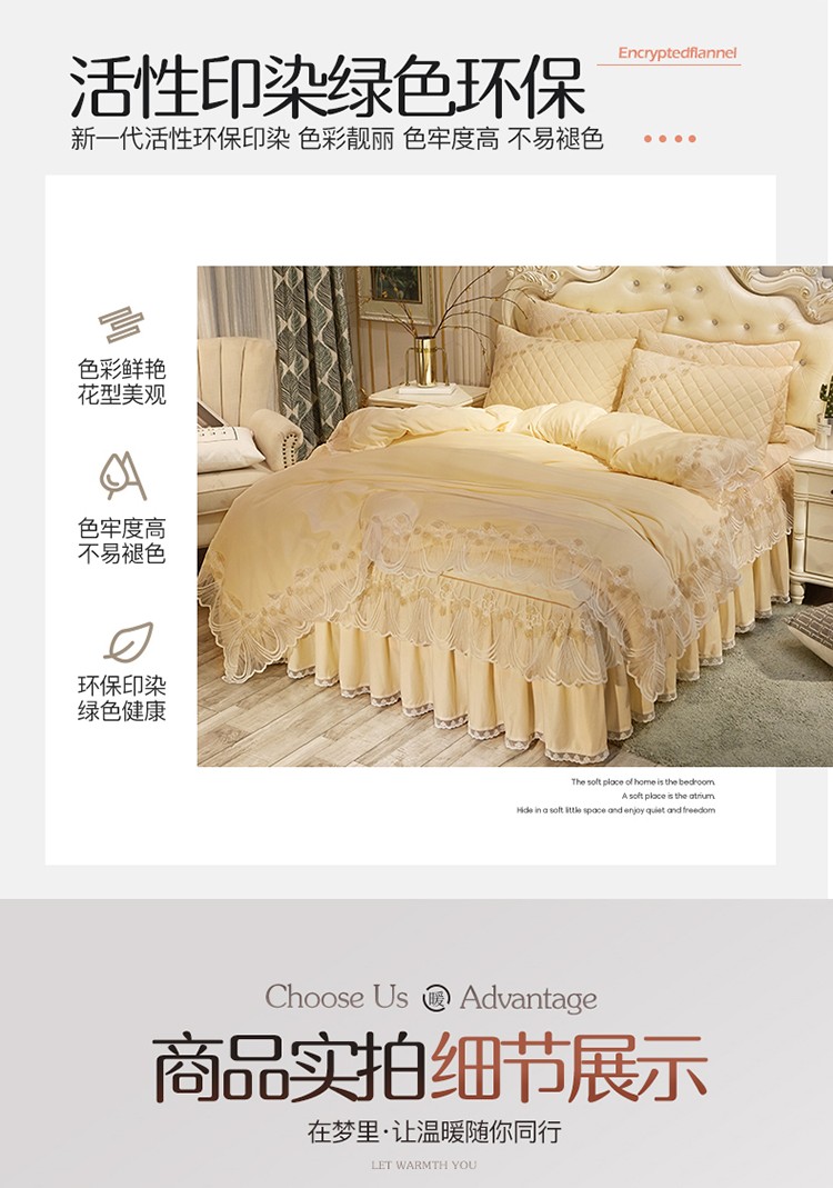 网红馆 2025新款幸福花开水晶绒蕾丝床裙四件套 米黄