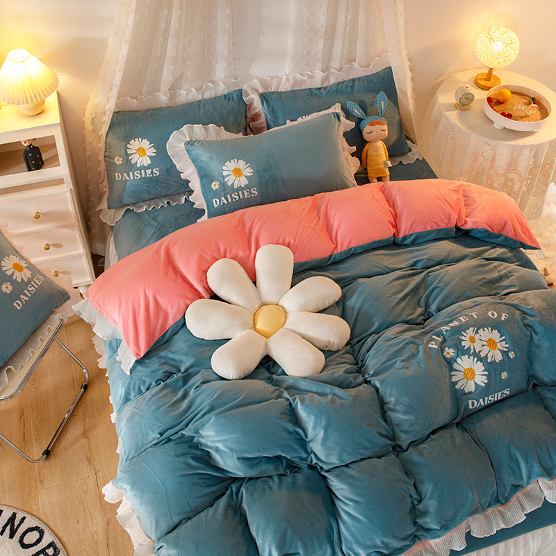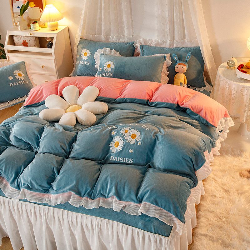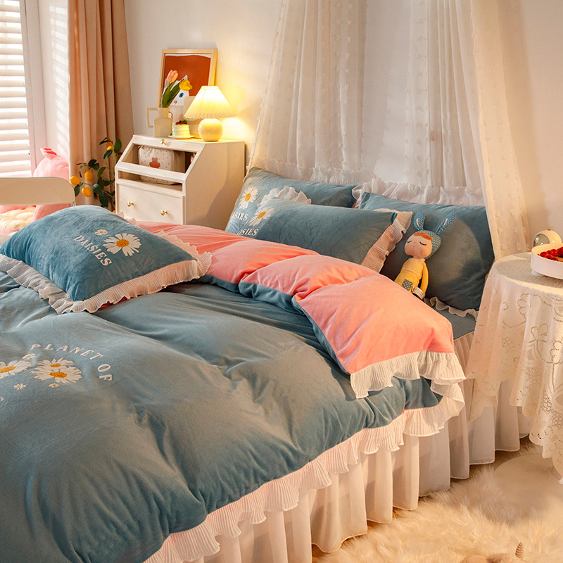 纽缦 2021新款韩版水晶绒床裙四件套 雏菊-蓝灰粉