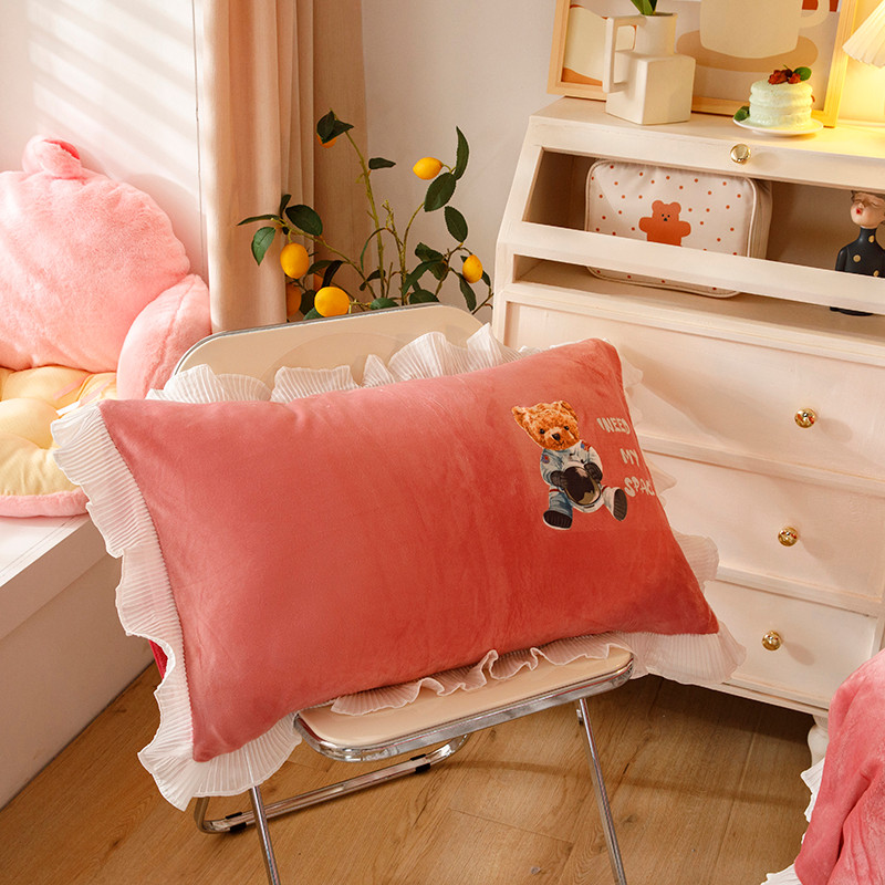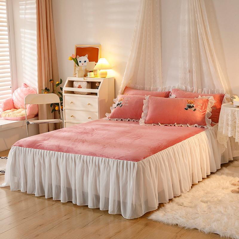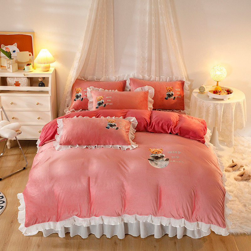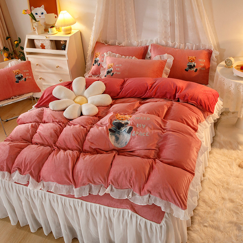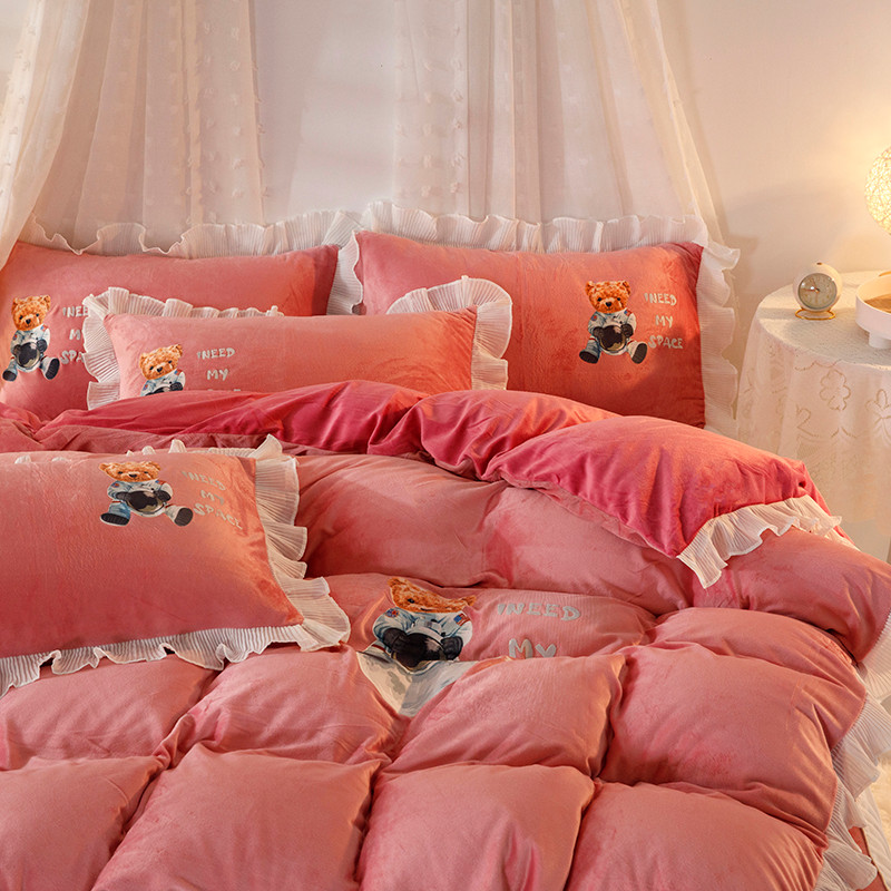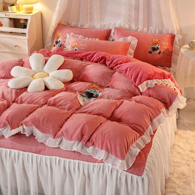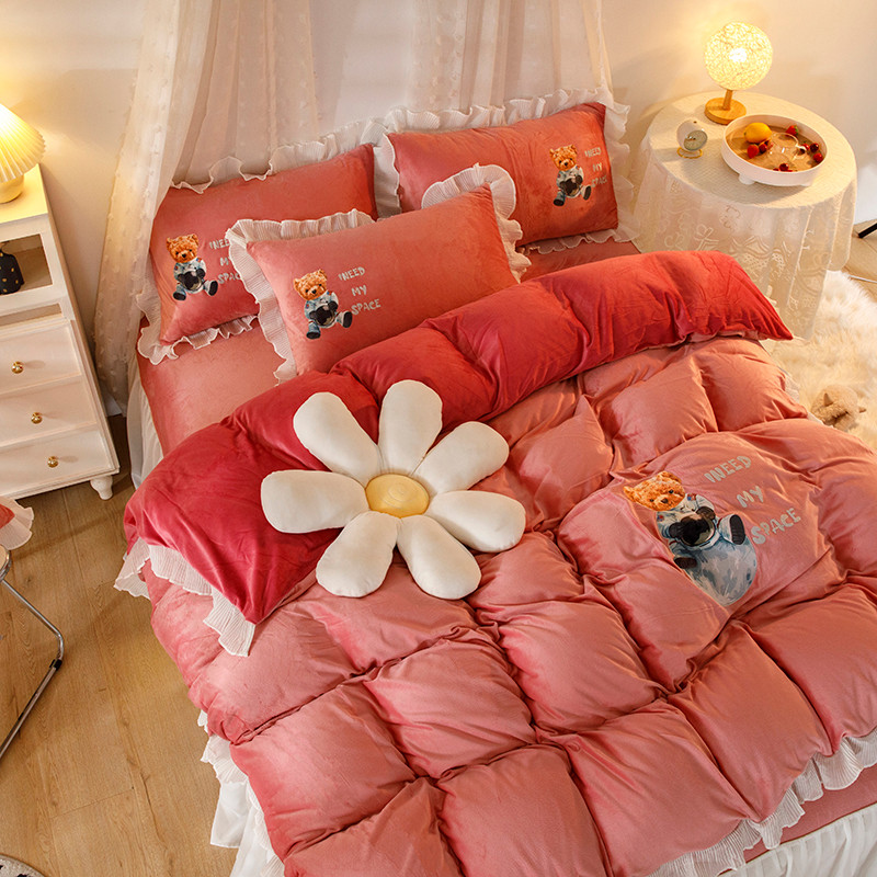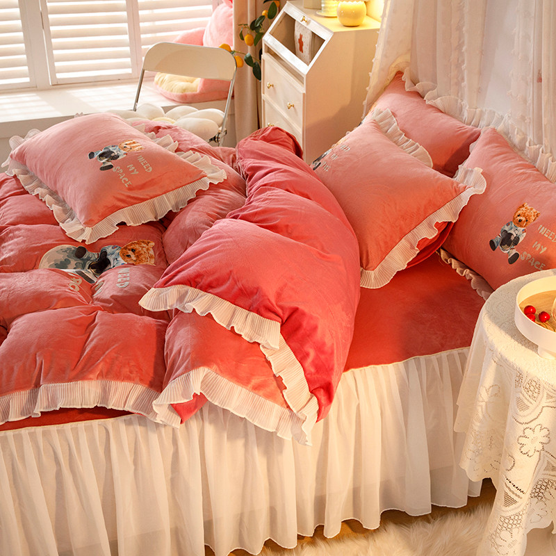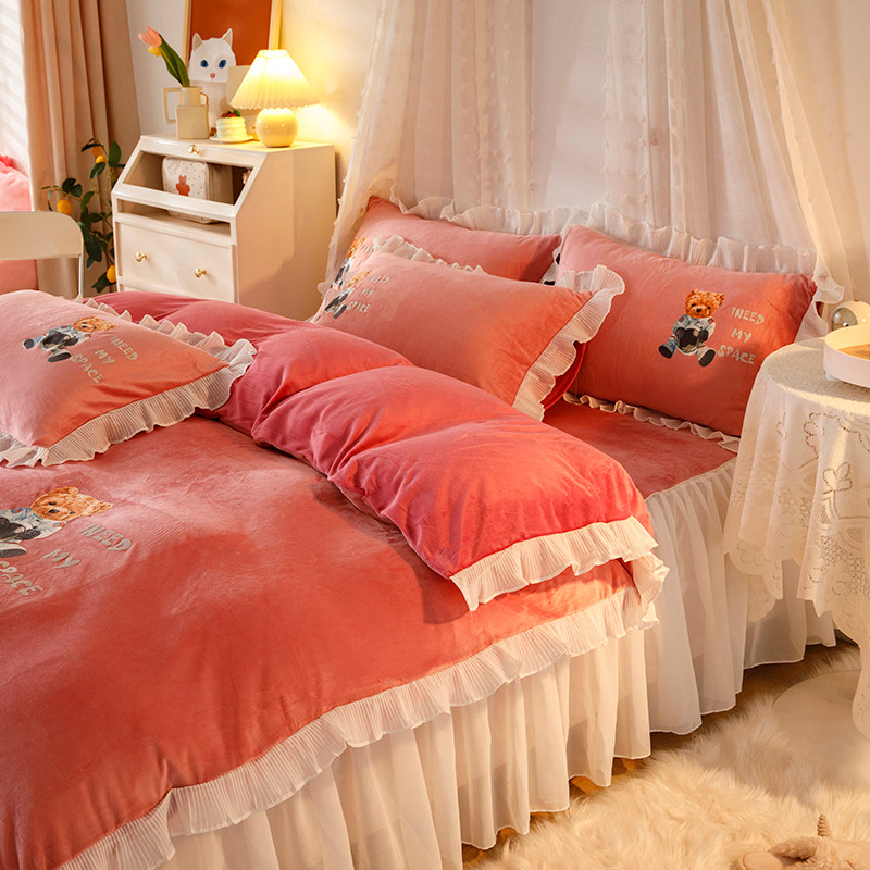 商品名称:纽缦 2021新款韩版水晶绒床裙四件套 萌熊-深浅豆沙