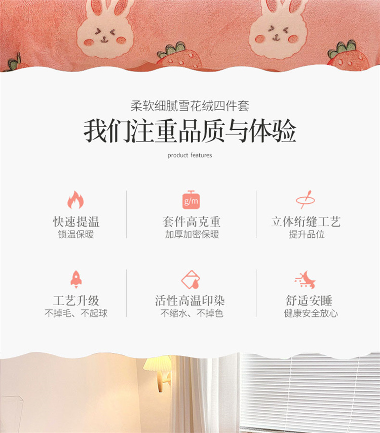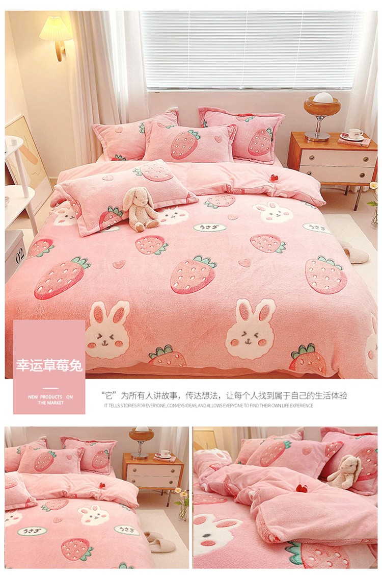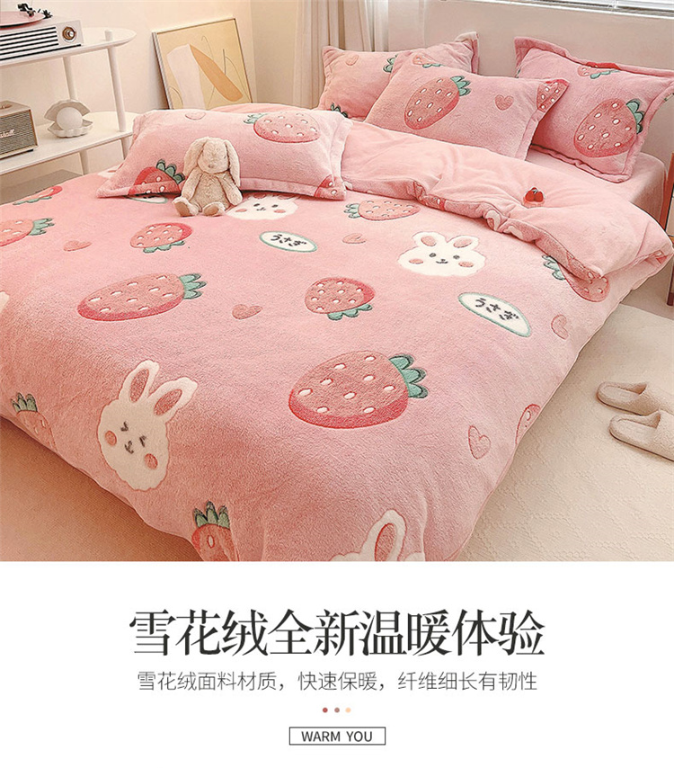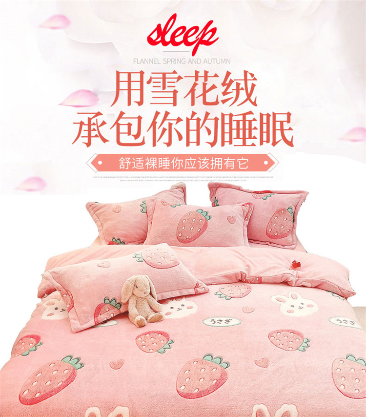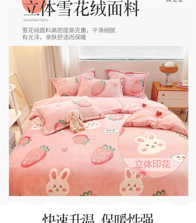 当前位置: 91家纺网 > 商品网购 > 床品套件 > 四件套 > 磨绒四件套 > 川悦生活 2021新款立体雪花绒四件套直播供货 幸运草莓兔
