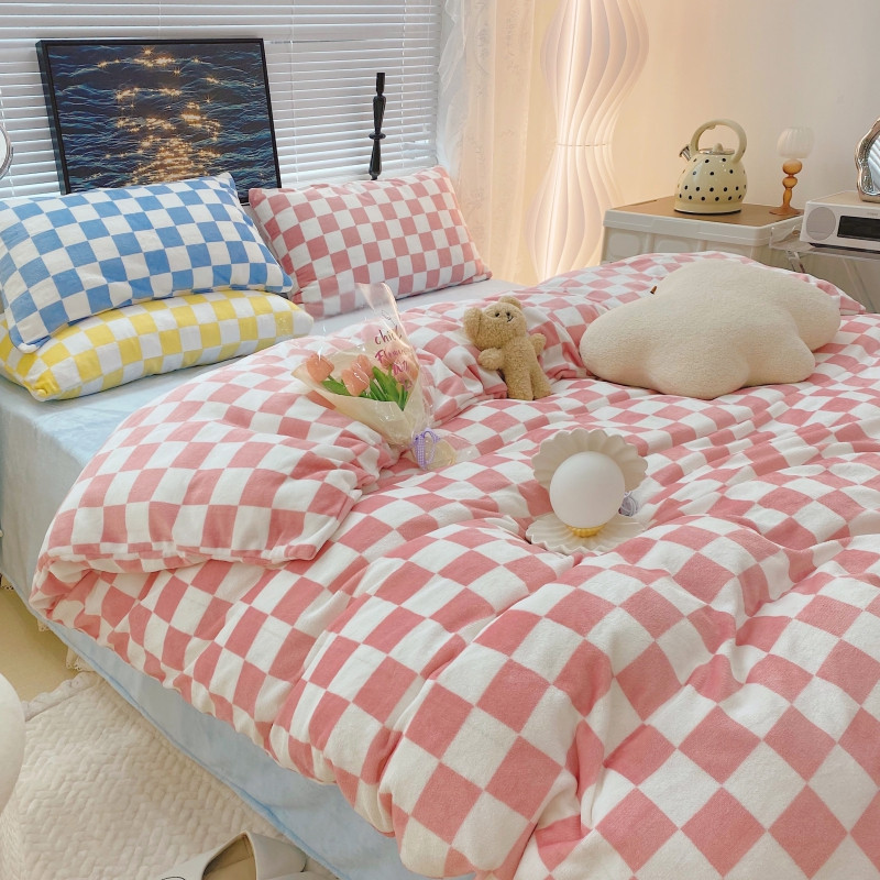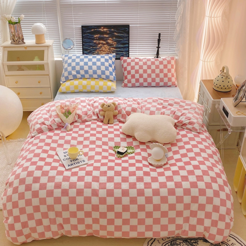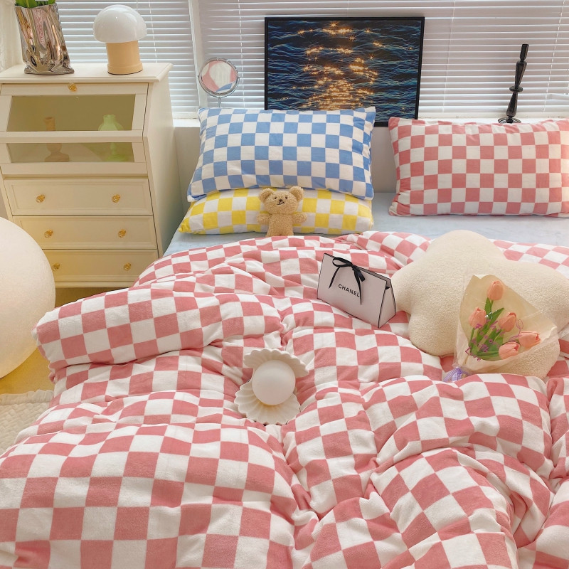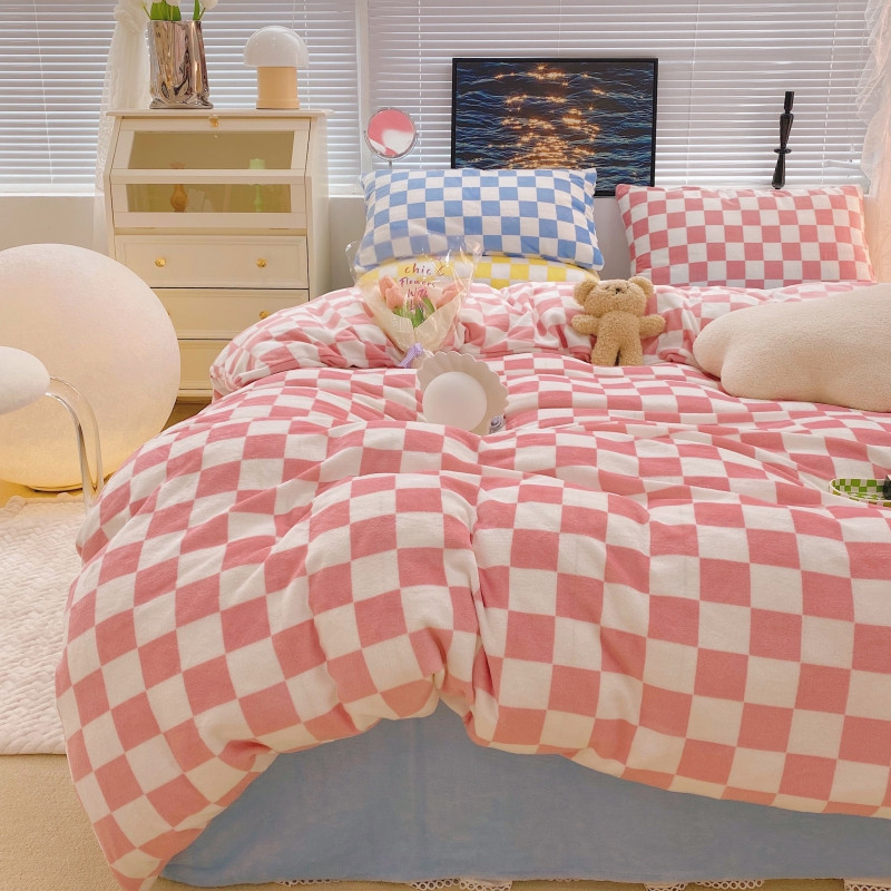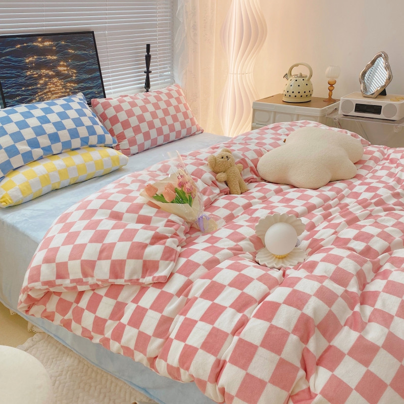 顾里家纺 2021新款韩系撞色棋盘格高克重牛奶绒四件套 海盐蜜桃