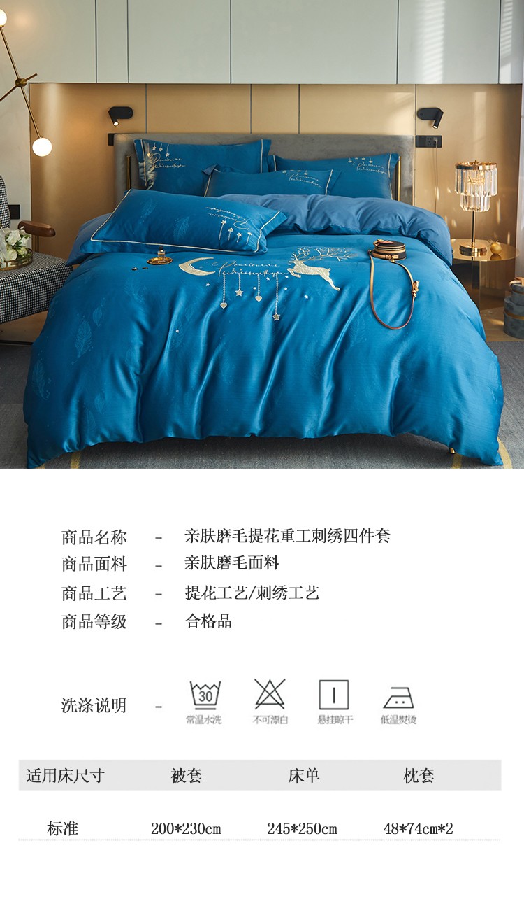 商品名称:凡客 2022新款磨毛提花重工刺绣小鹿四件套 小鹿森林-蓝