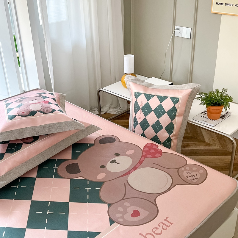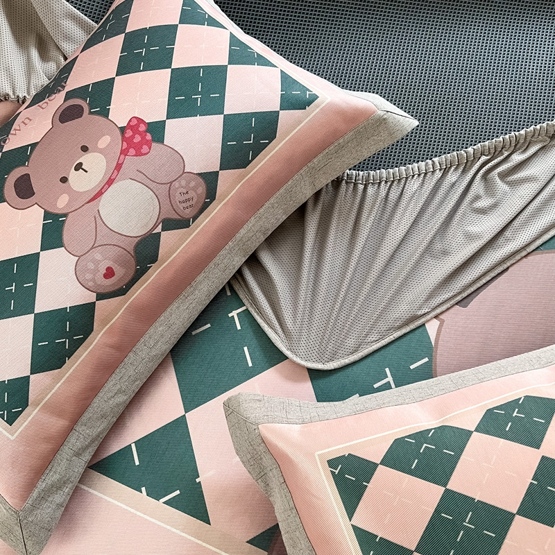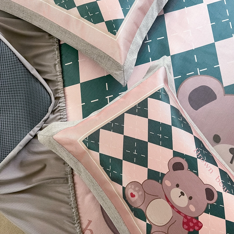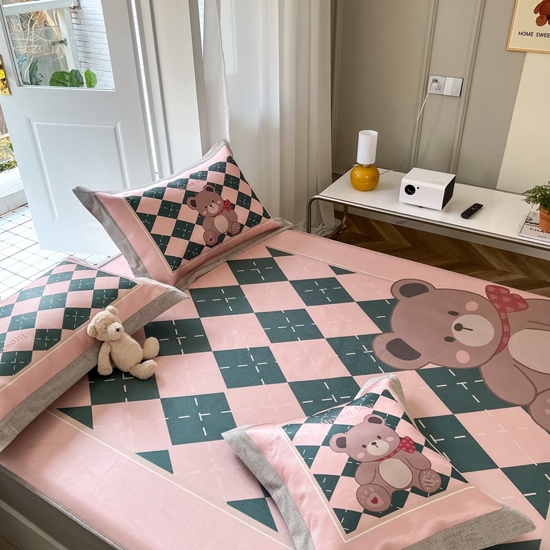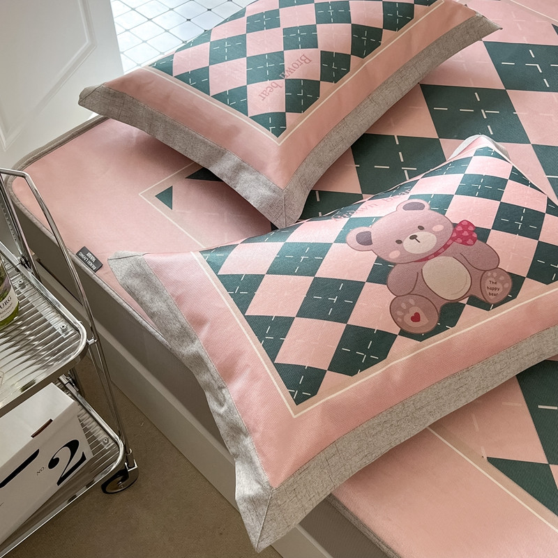 本希 2022高端数码印花水洗冰丝席床笠款-法式简约粉格小熊