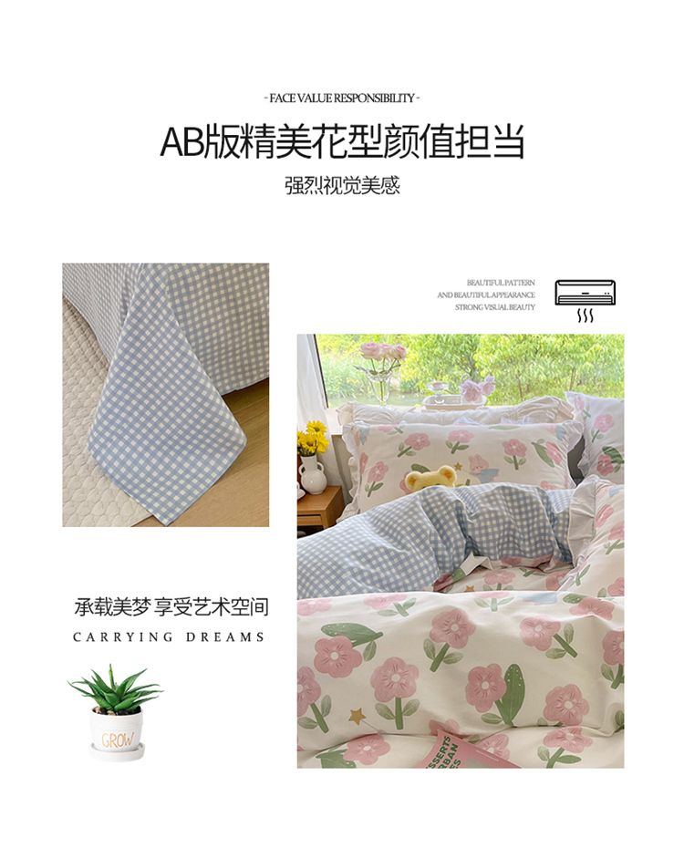 (总)桃子家居 2026新款A类韩版花边纯棉色织提花格子撞色奶油四件套,棉花边提花-蓝黄格,棉花边提花-幻境蓝格,棉花边提花-米咖格,棉花边提花-璎珞粉格