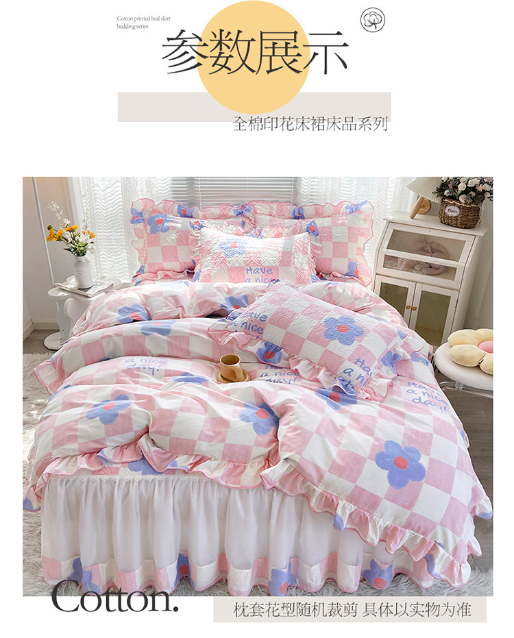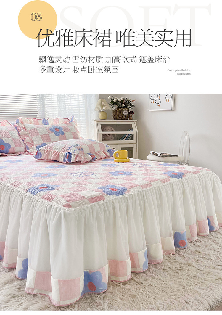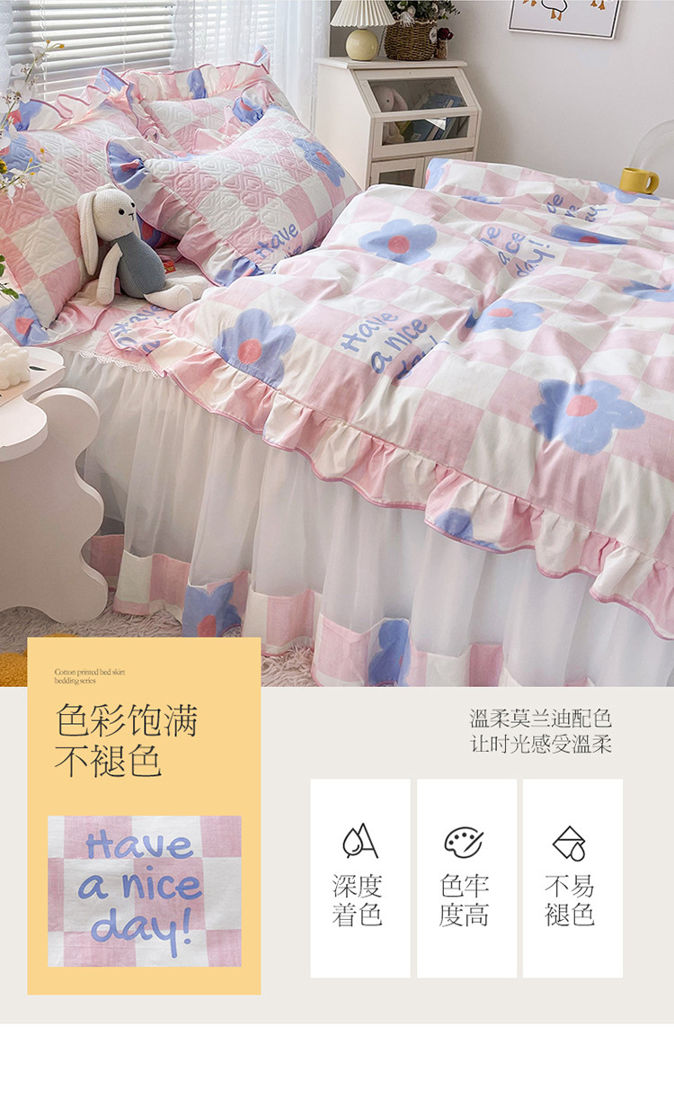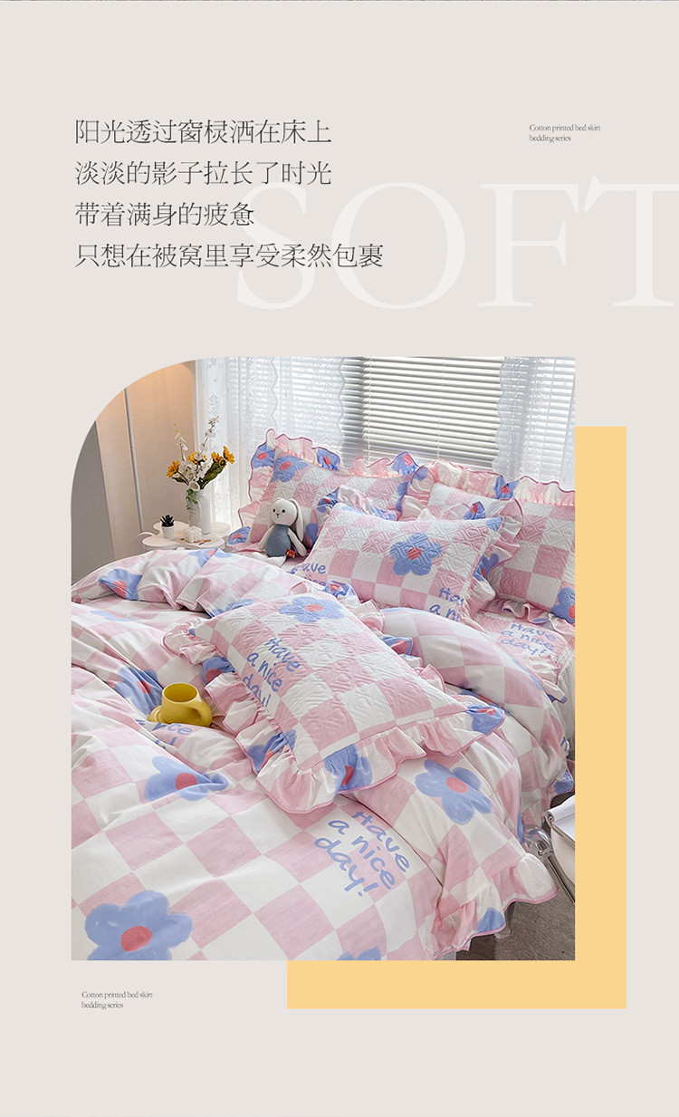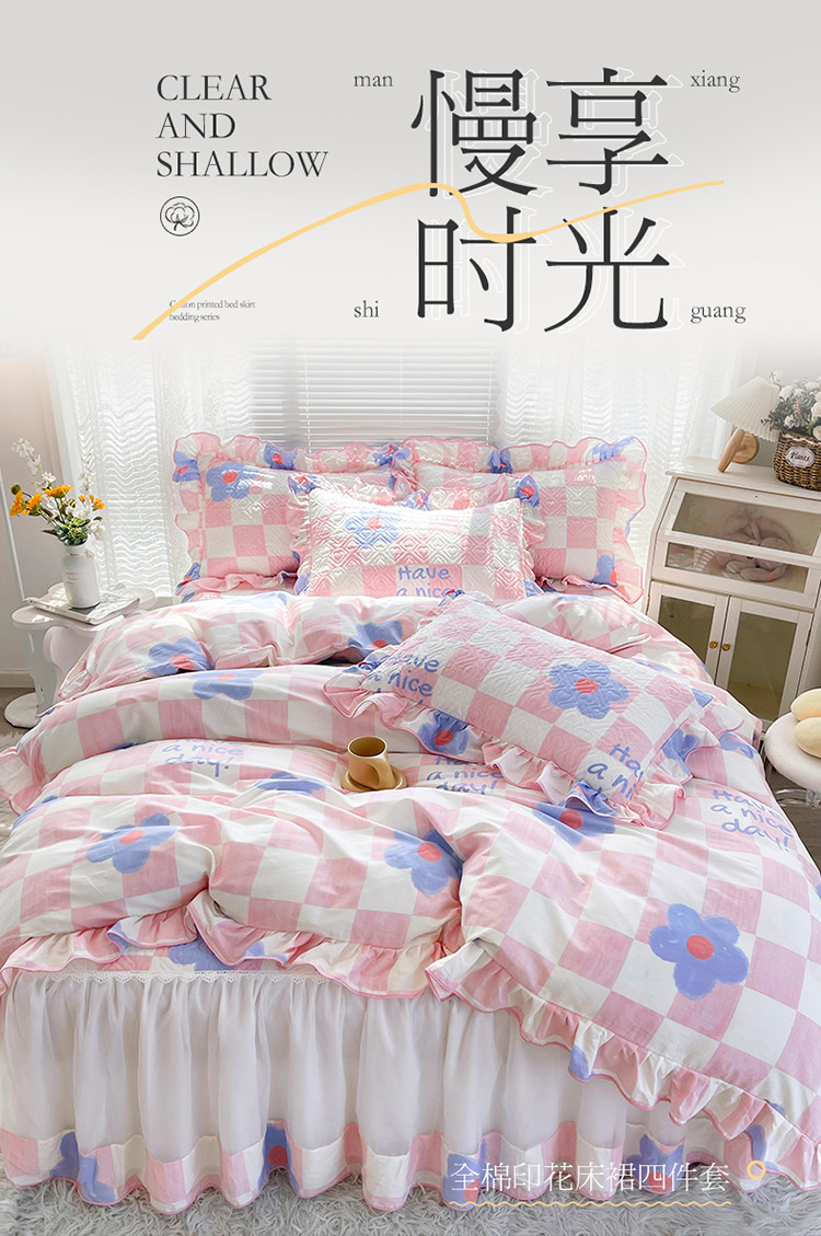 当前位置: 91家纺网 > 商品网购 > 床品套件 > 四件套 > 全棉普通四件套 > 宜凡 2022新款全棉印花夹棉双层裙边床裙款四件套 浅浅格调