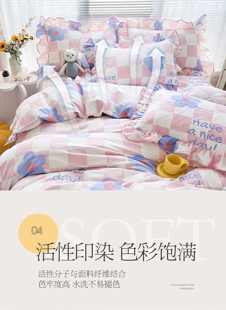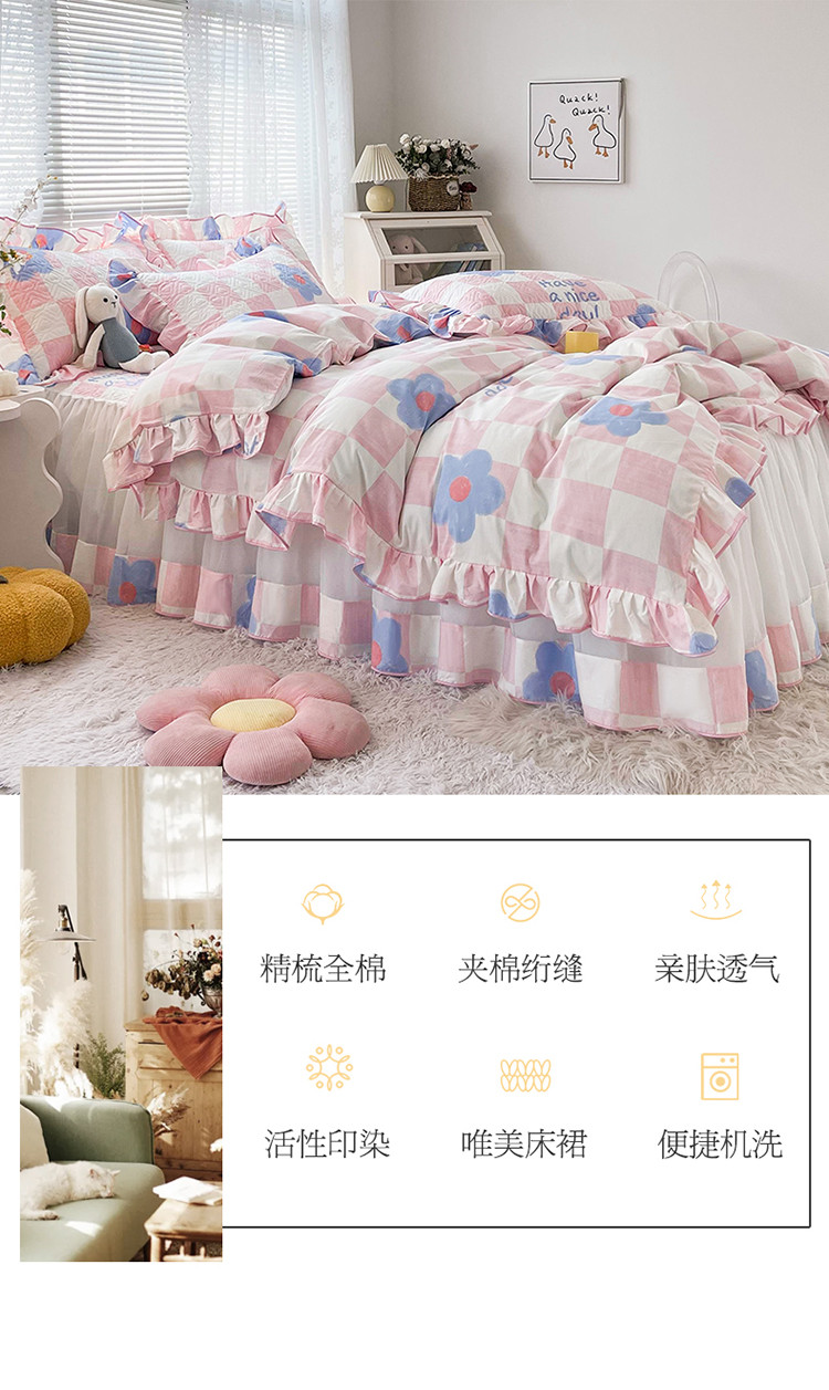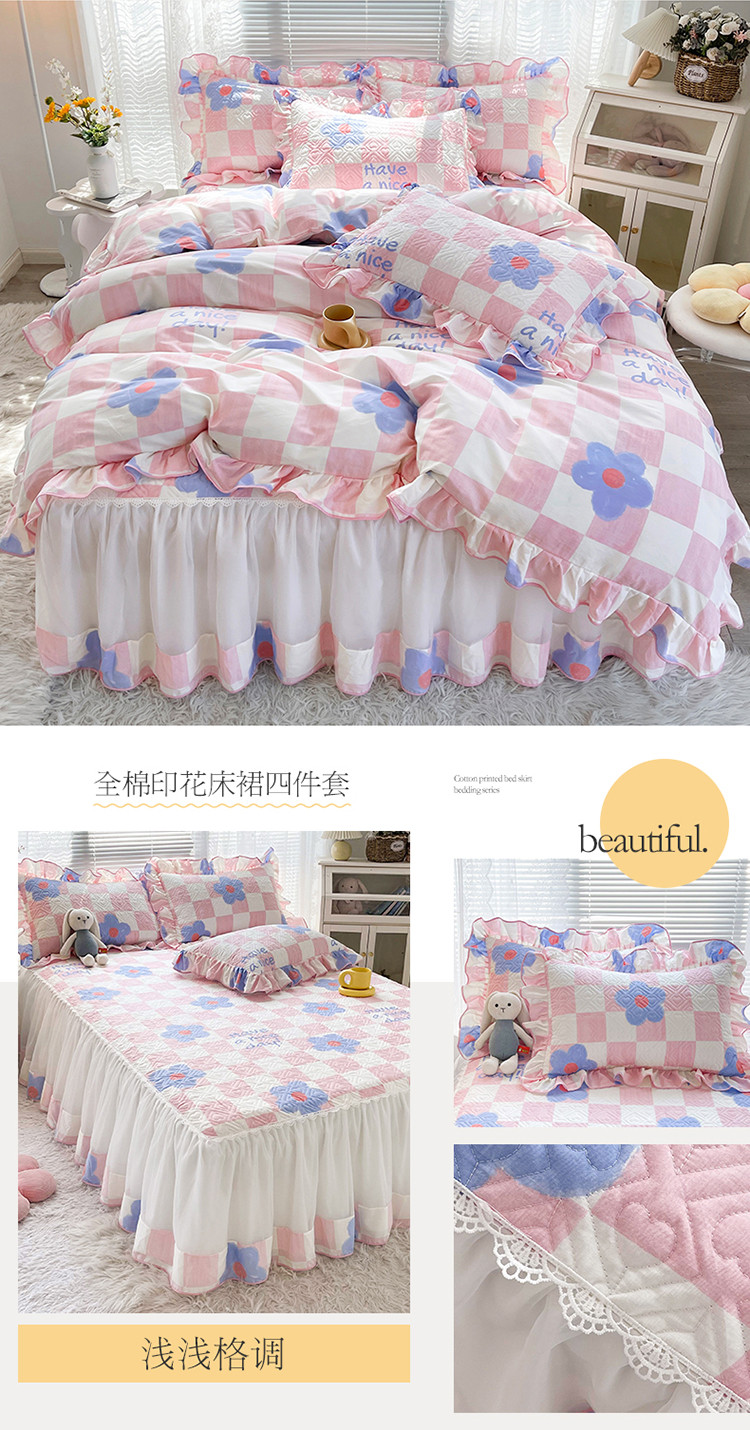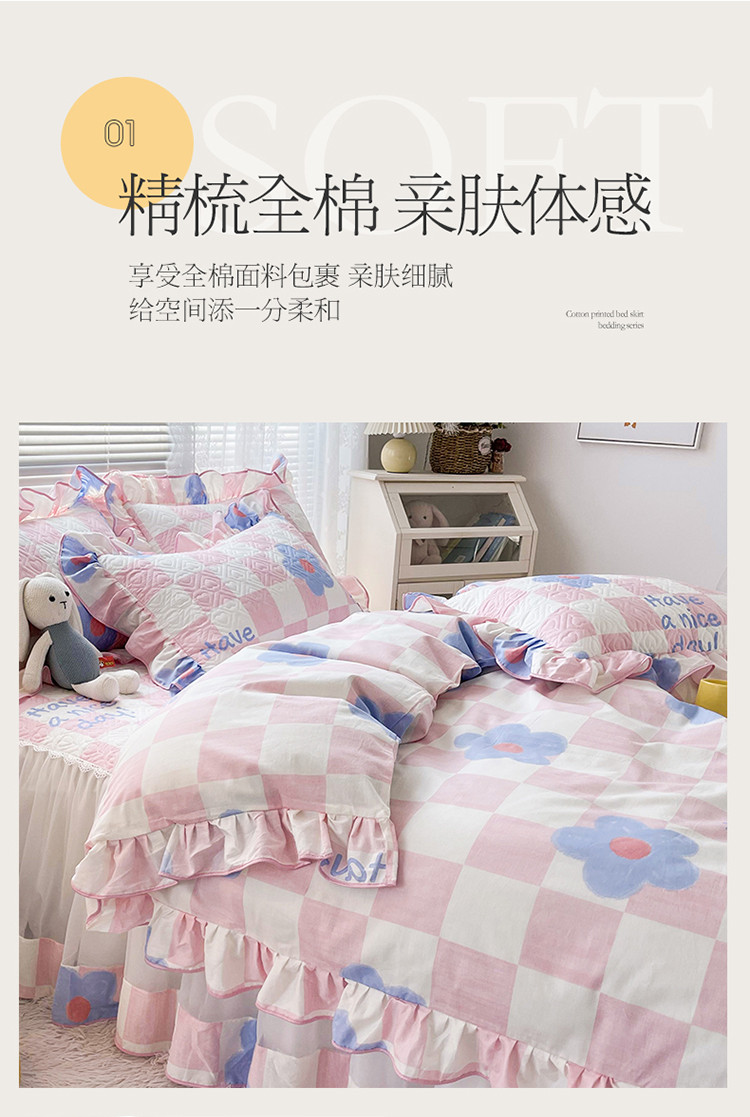 当前位置: 91家纺网 > 商品网购 > 床品套件 > 四件套 > 全棉普通四件套 > 宜凡 2022新款全棉印花夹棉双层裙边床裙款四件套 浅浅格调