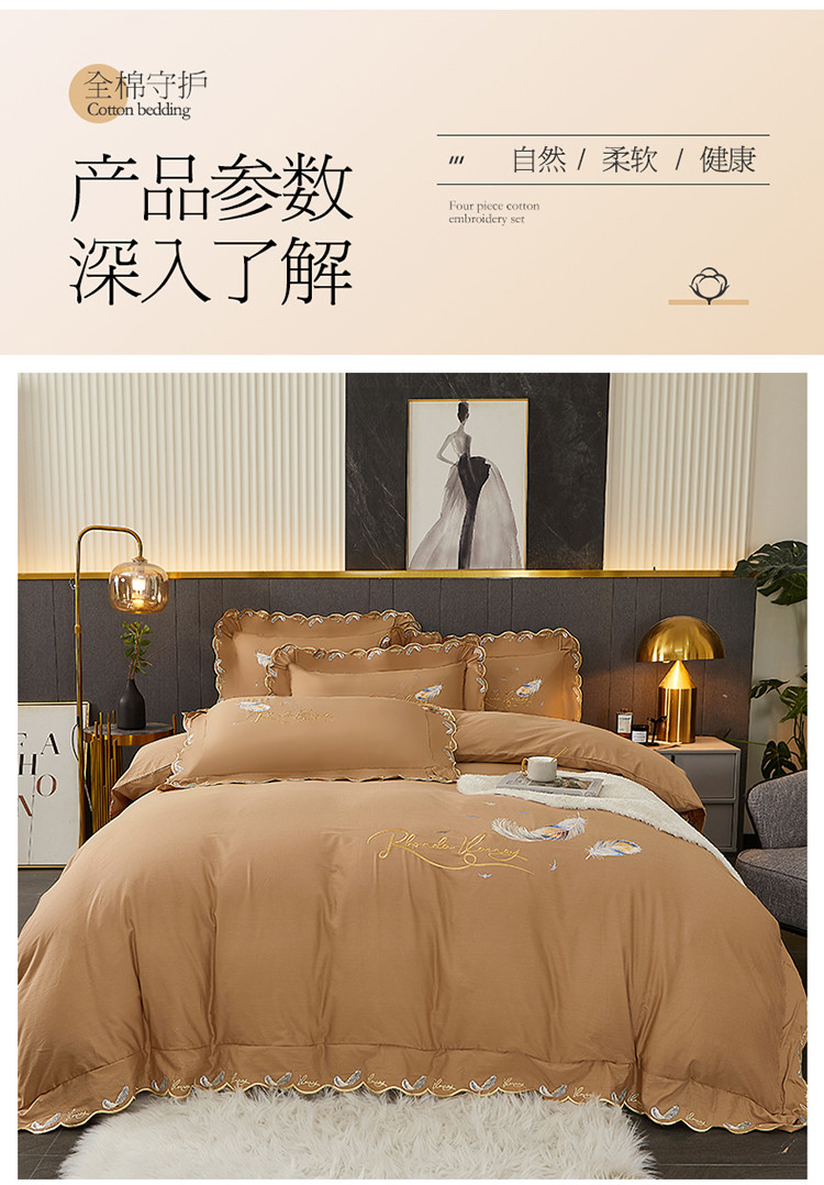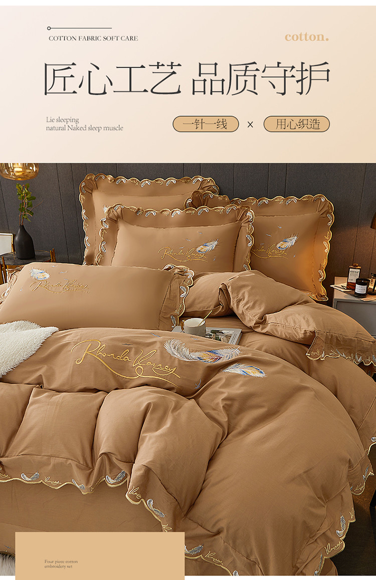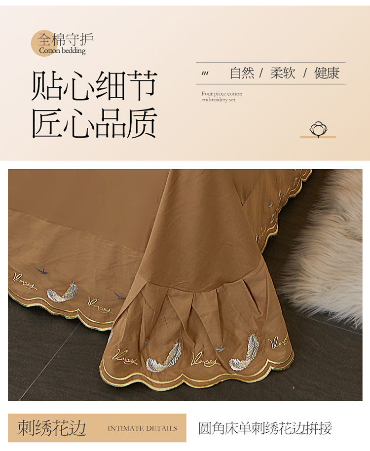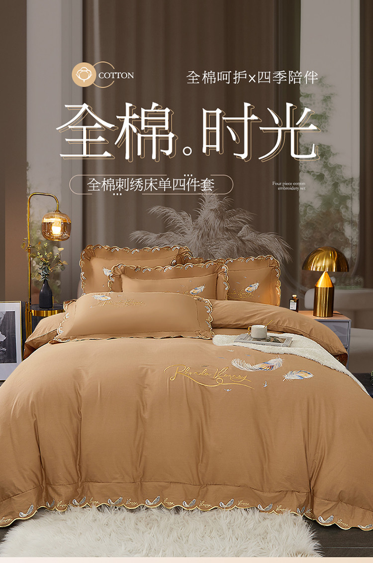 宜凡 2022新款全棉刺绣床单款四件套 芳羽-咖啡