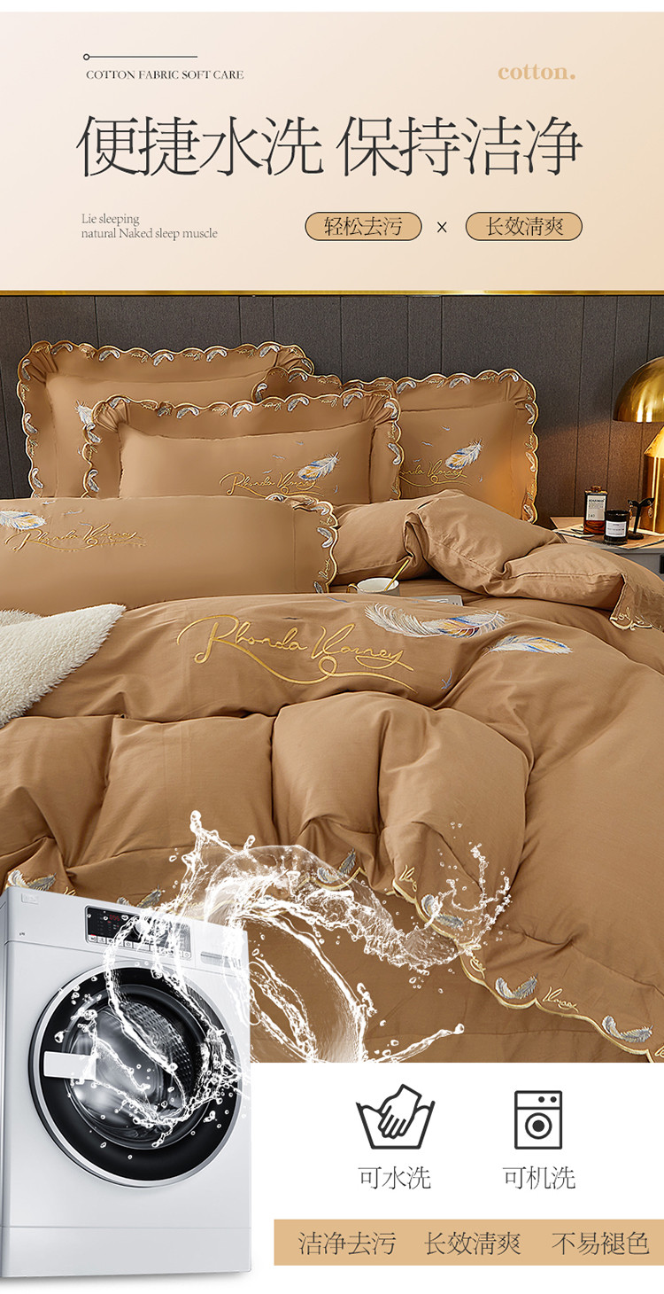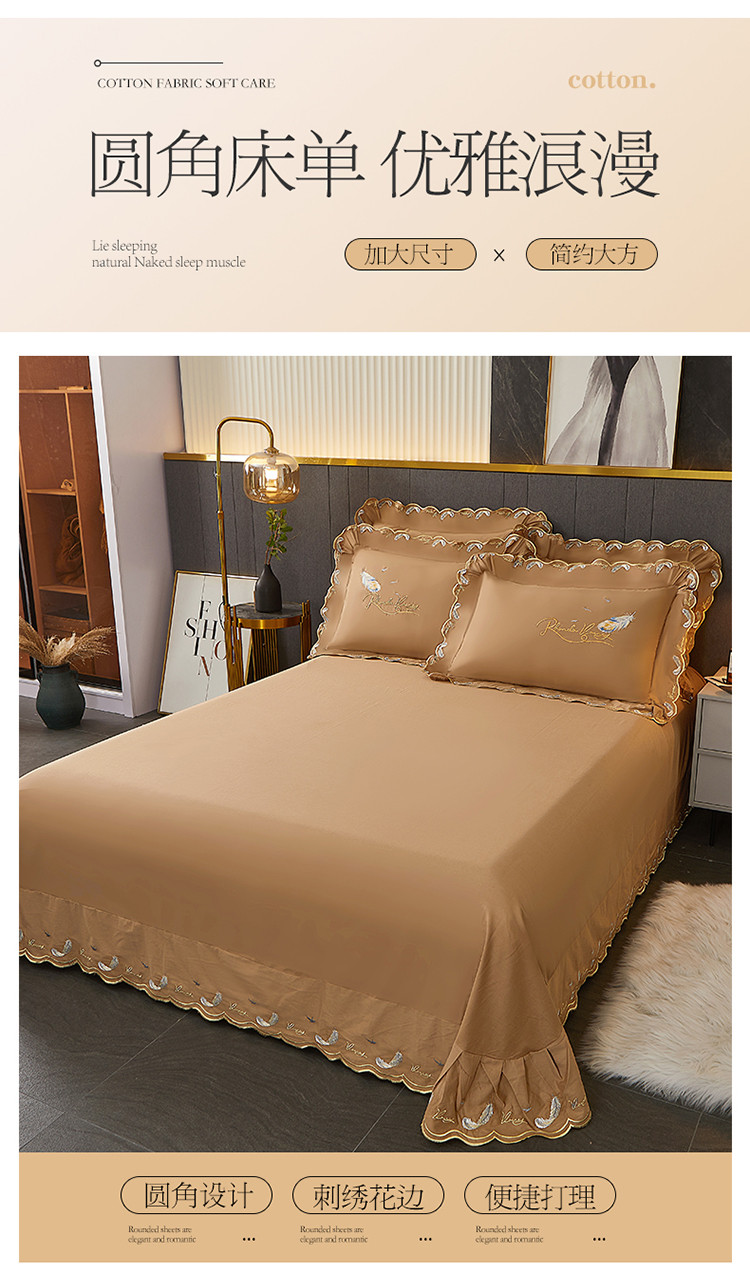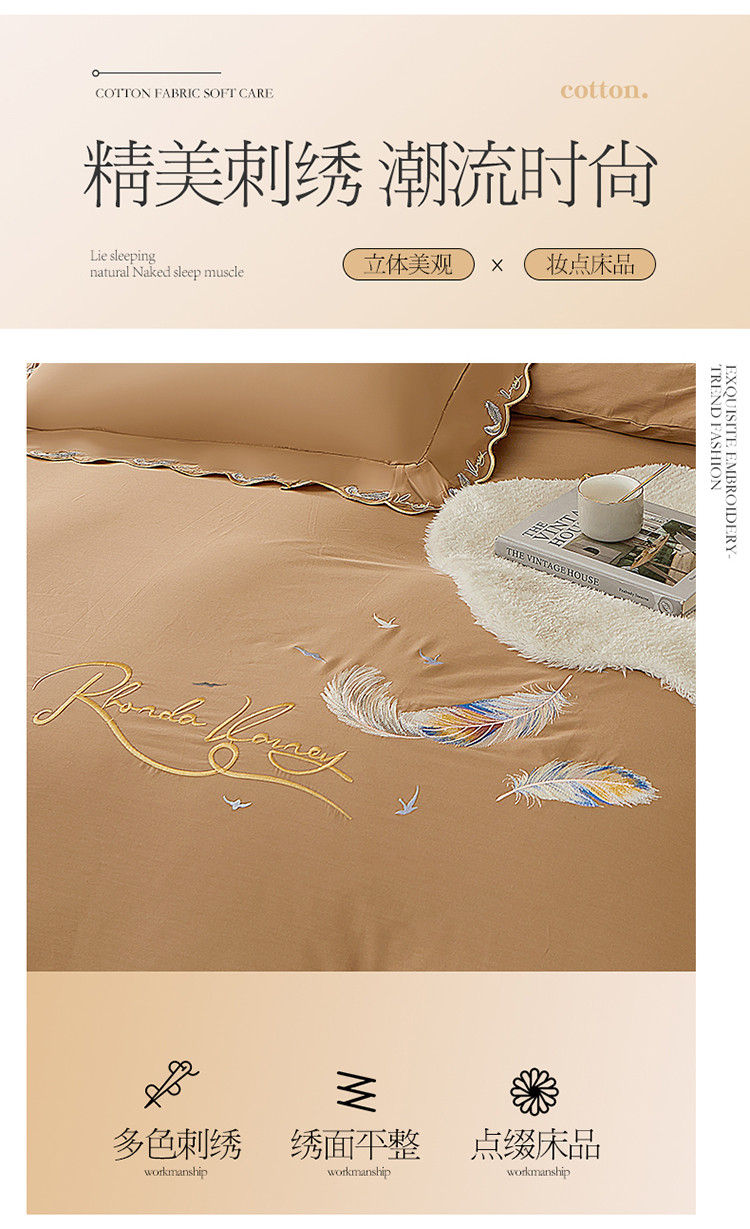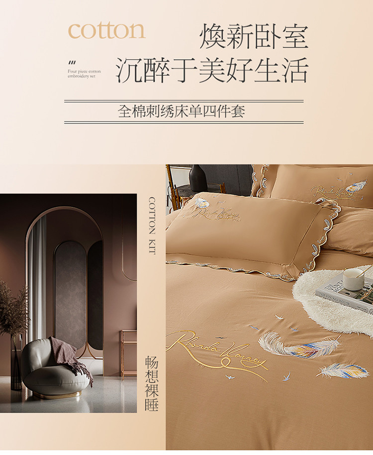 宜凡 2022新款全棉刺绣床单款四件套 芳羽-咖啡