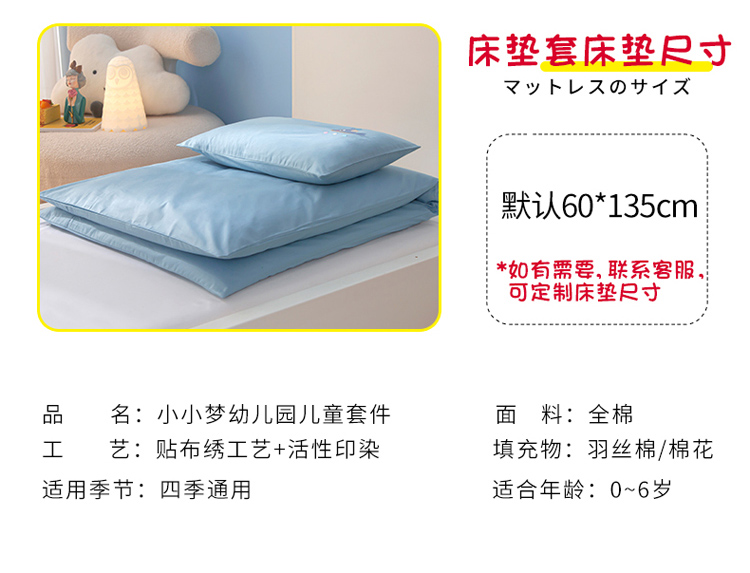 被子120*150,床垫60*135,枕头30*50