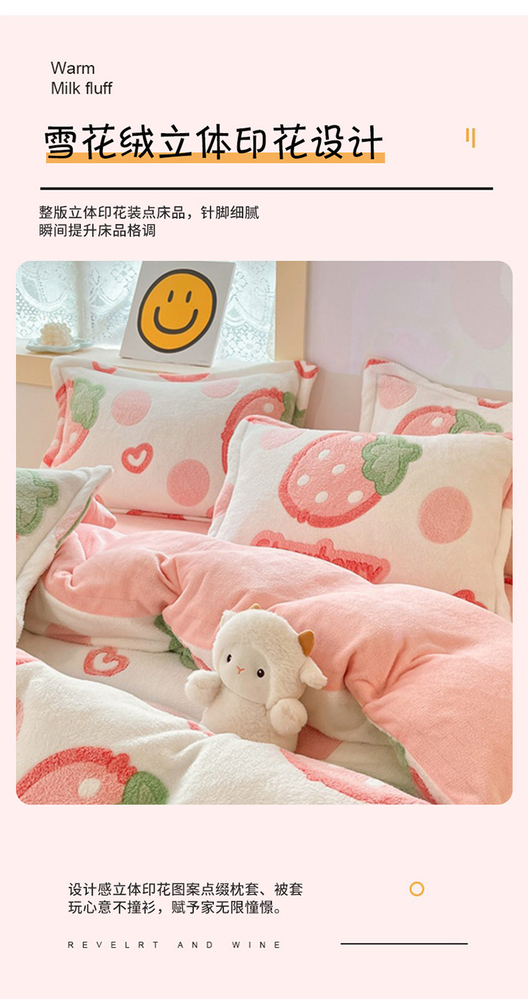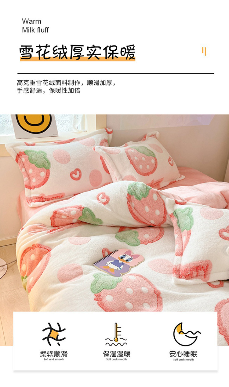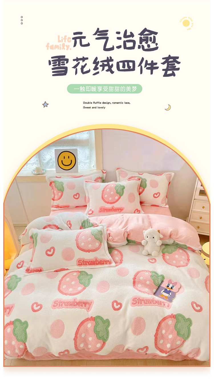 当前位置: 91家纺网 > 商品网购 > 床品套件 > 四件套 > 普通磨毛四件套 > 川悦生活 2024新款立体雪花绒卡通四件套牛奶绒四件套 啵啵草莓