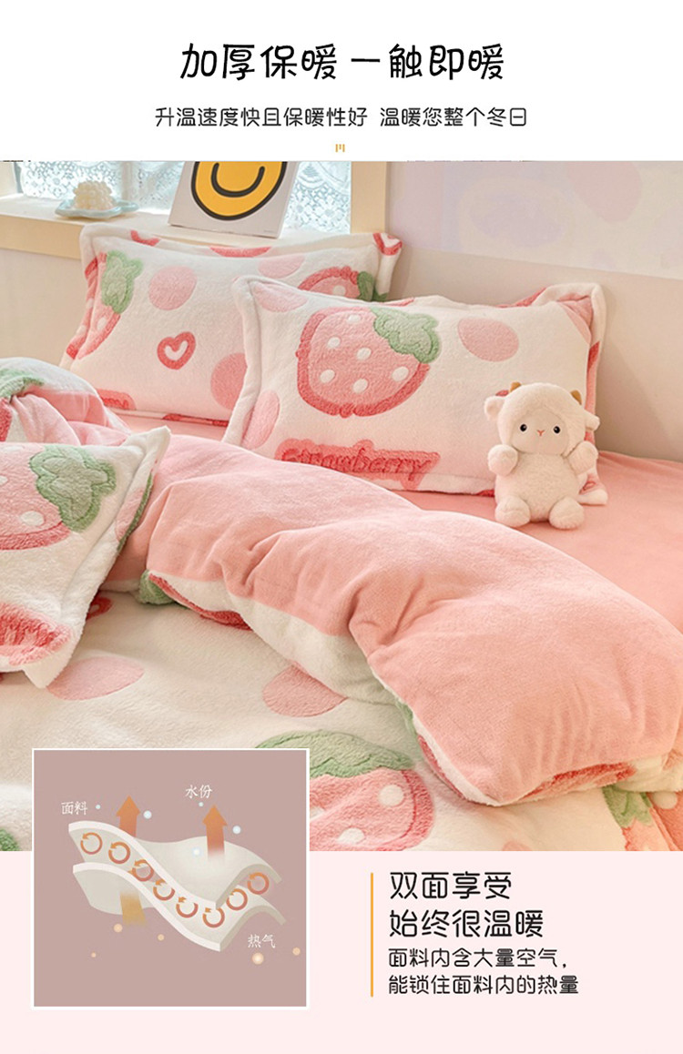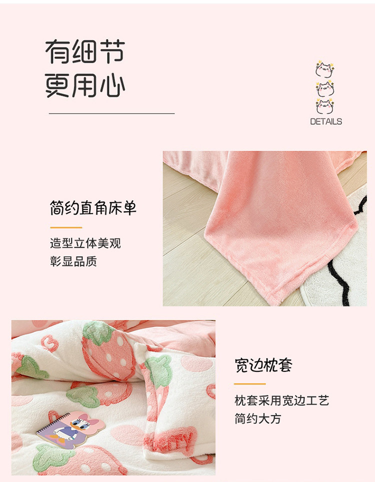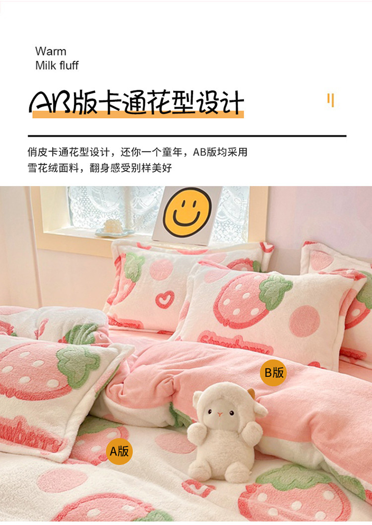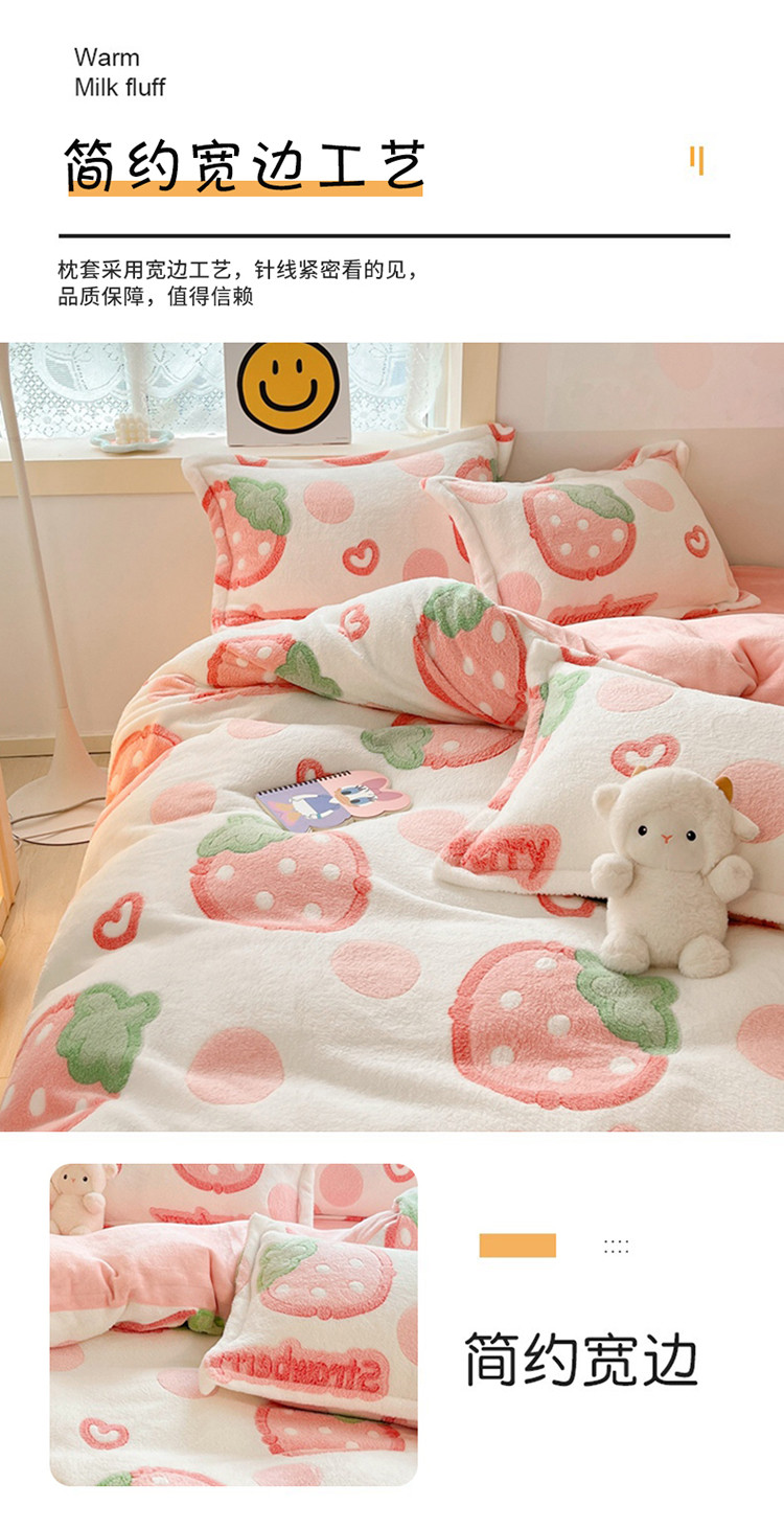 当前位置: 91家纺网 > 商品网购 > 床品套件 > 四件套 > 普通磨毛四件套 > 川悦生活 2024新款立体雪花绒卡通四件套牛奶绒四件套 啵啵草莓