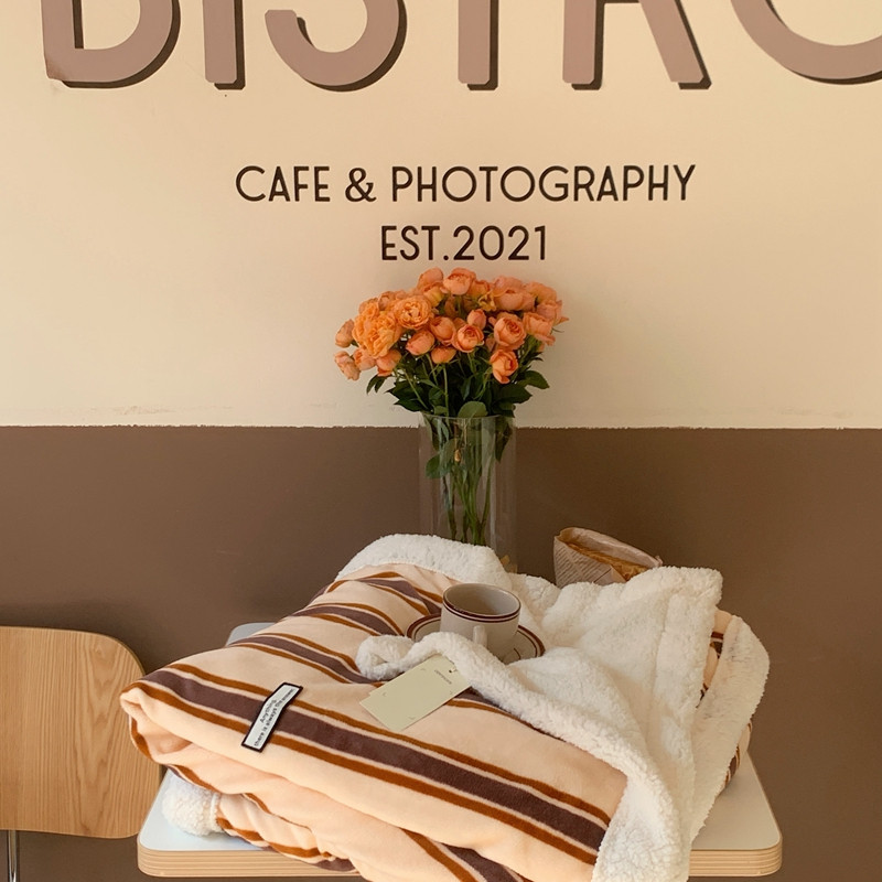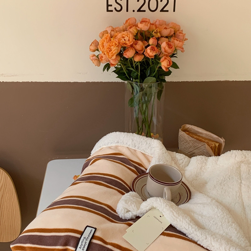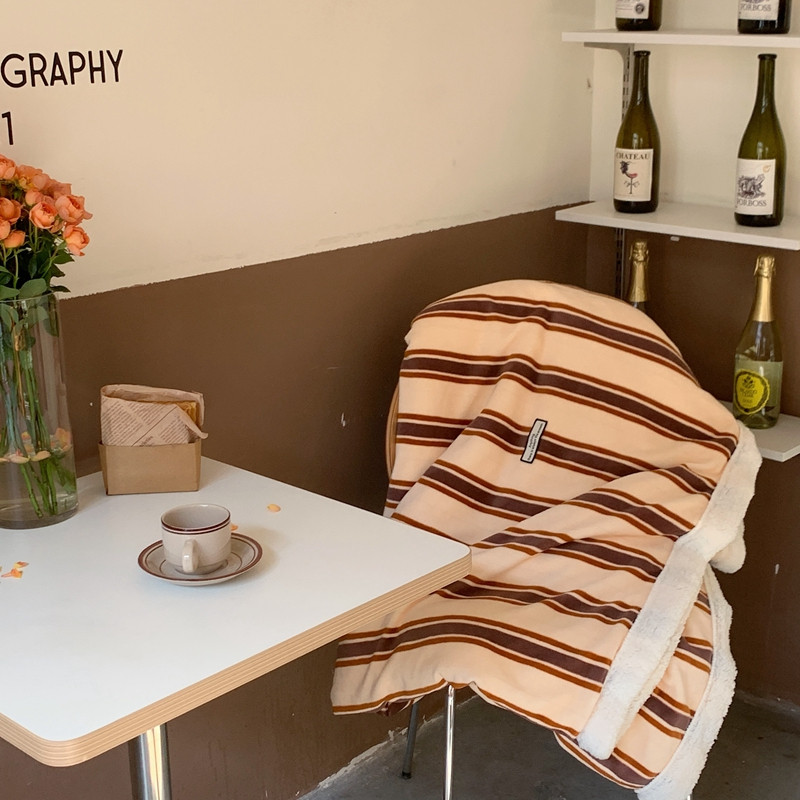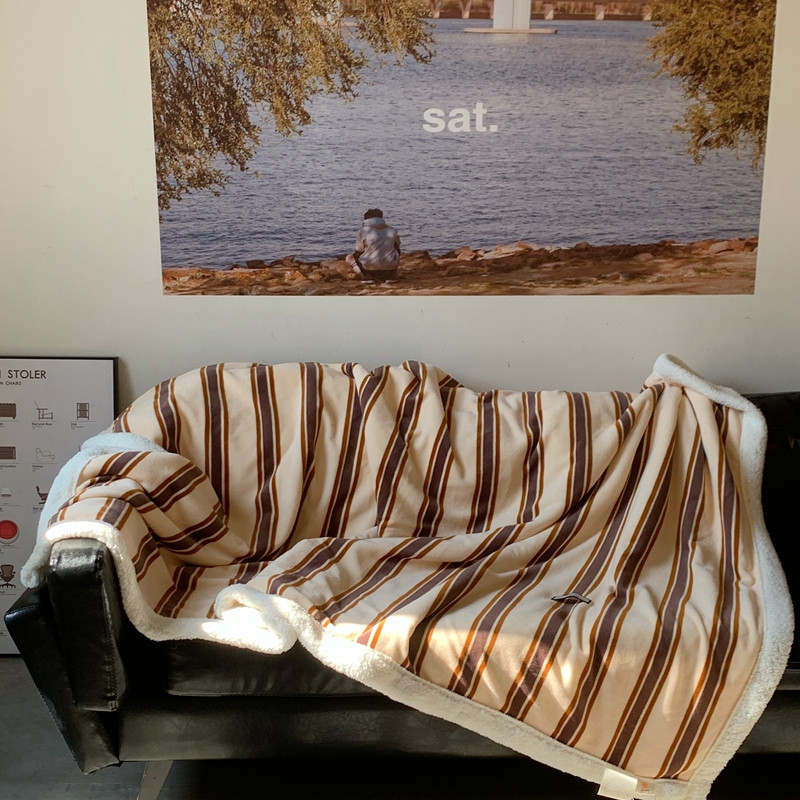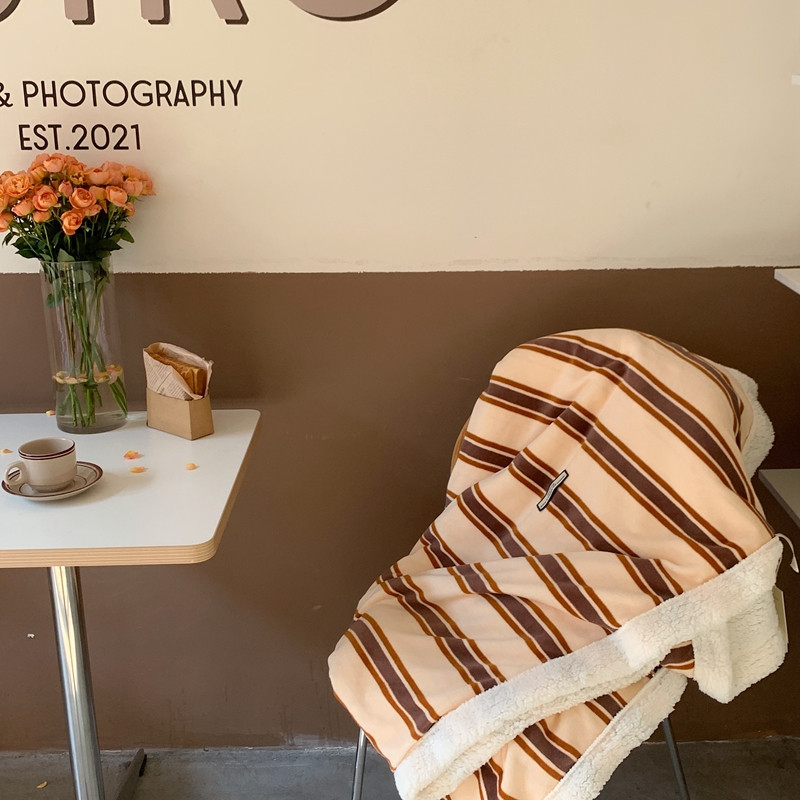 桃喜 2022新款230g牛奶绒羊羔绒条纹毛毯 燕麦奶咖