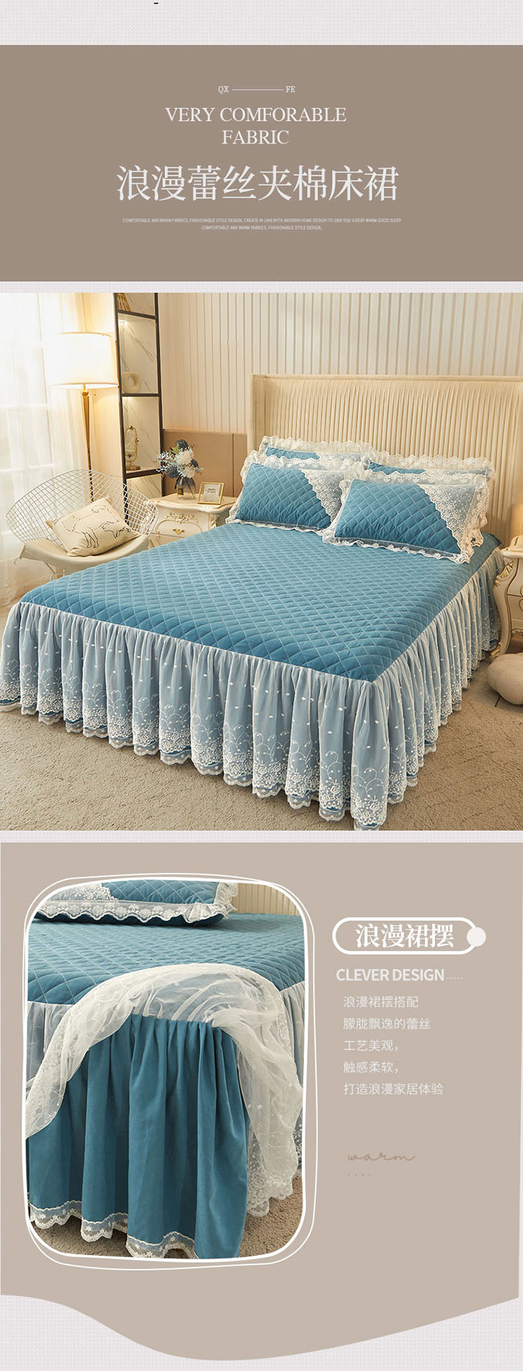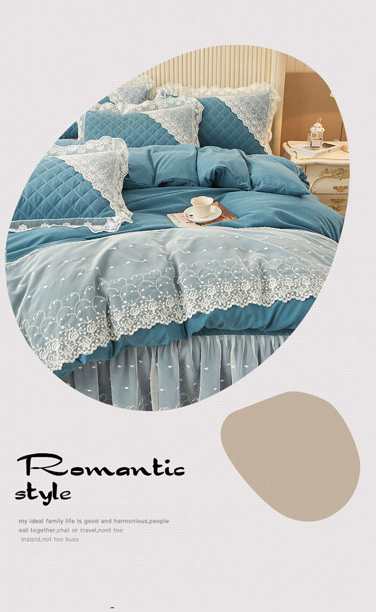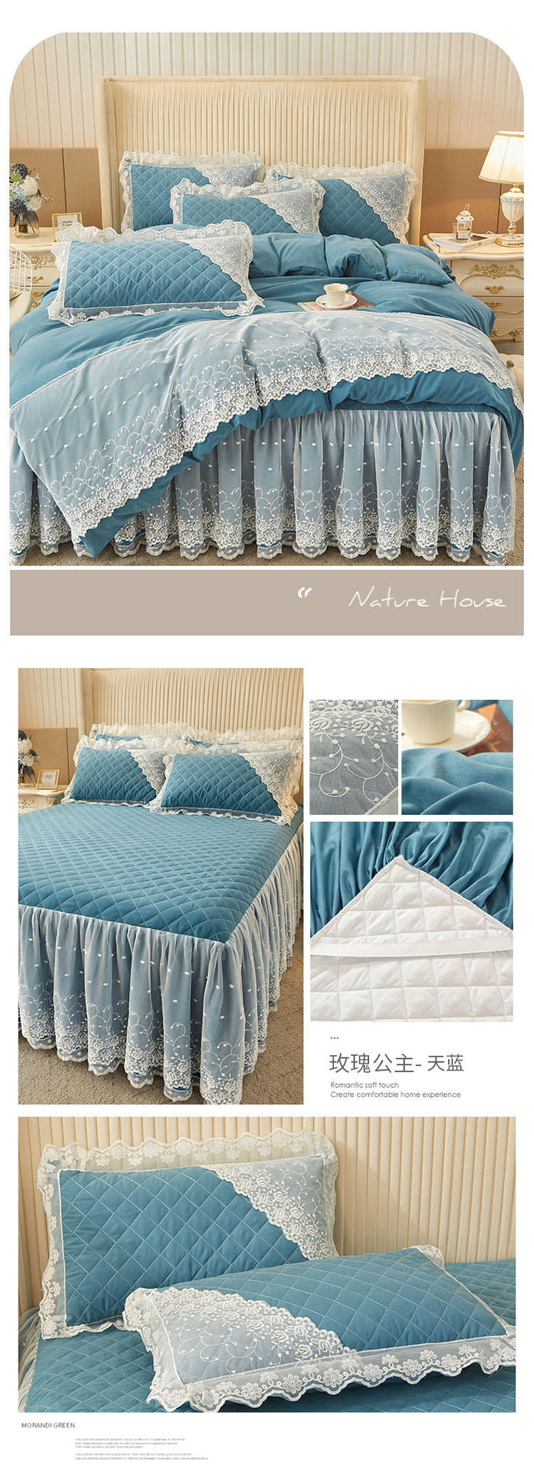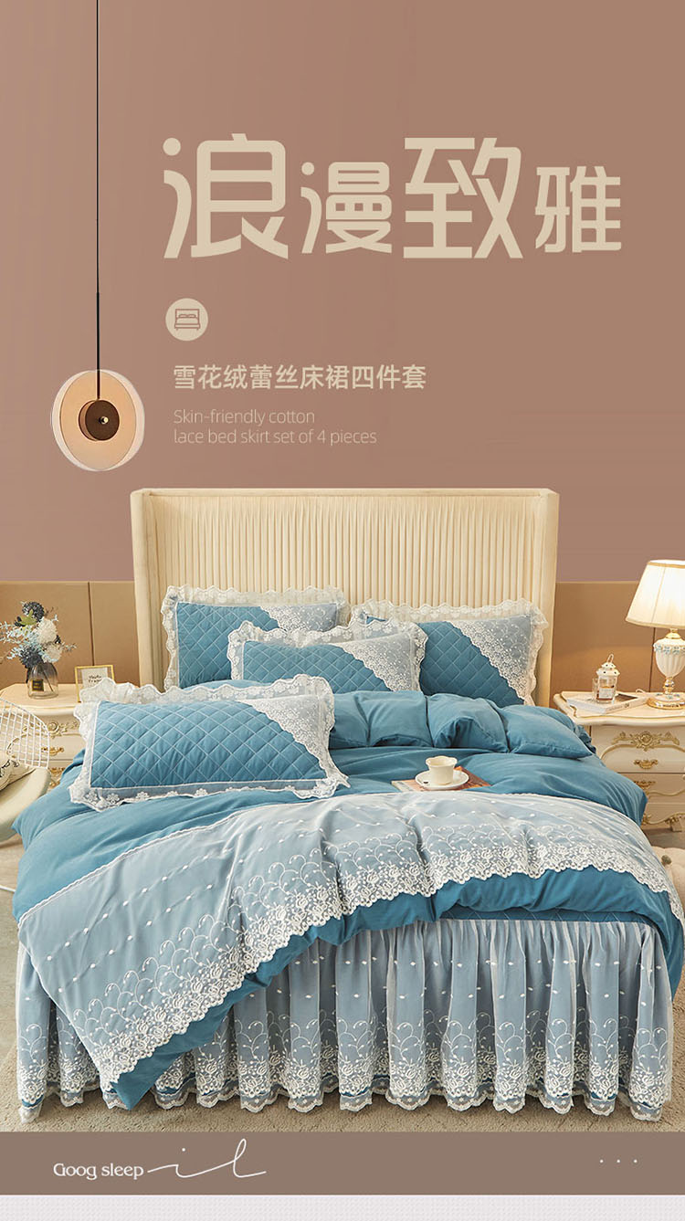 当前位置: 91家纺网 > 商品网购 > 床品套件 > 四件套 > 磨绒四件套 > 恋尚 2023新款纯色雪花绒夹棉蕾丝床裙四件套(四季款) 玫瑰公主-天蓝