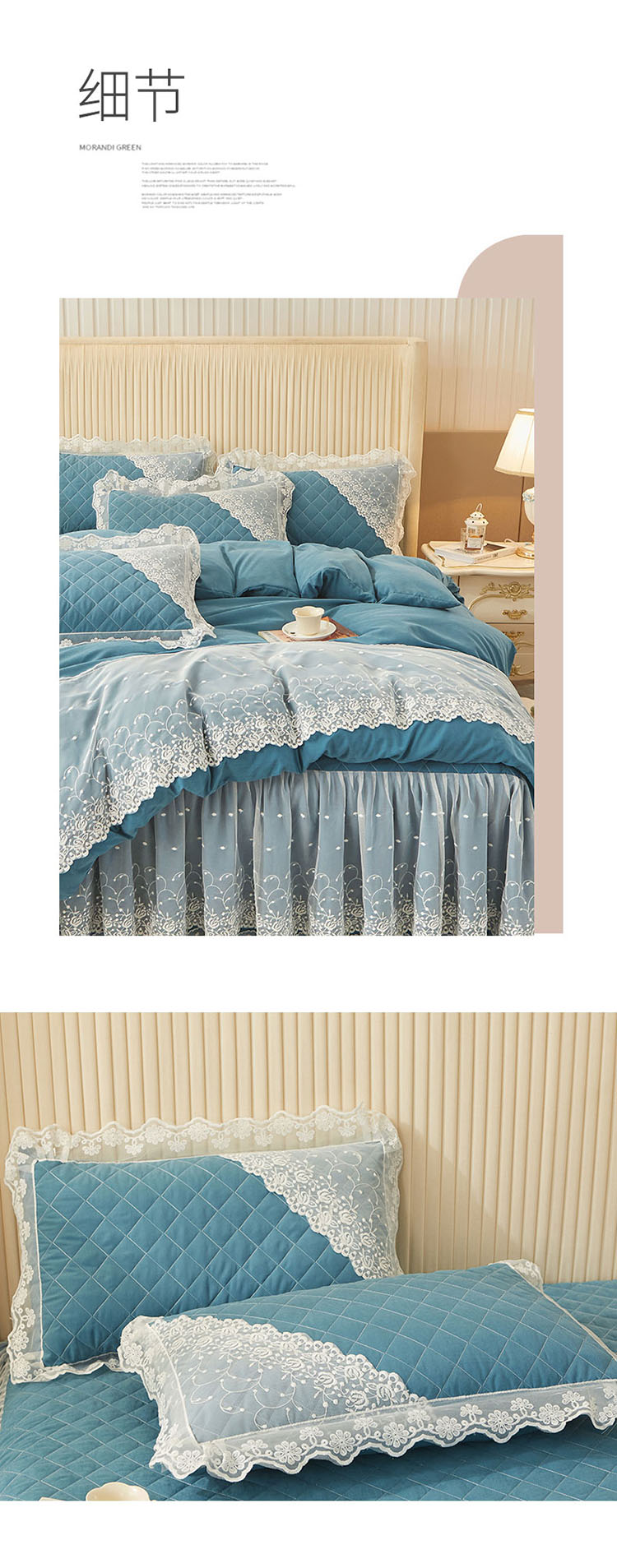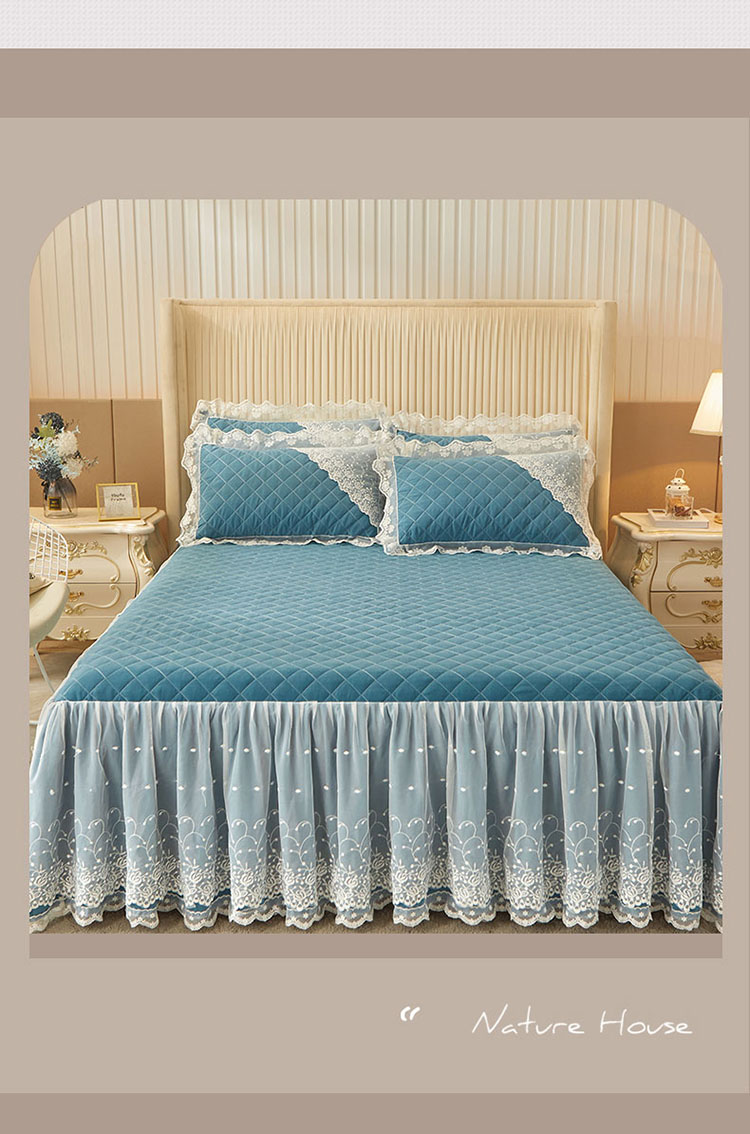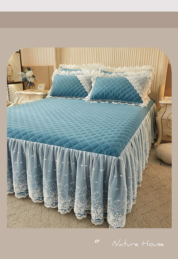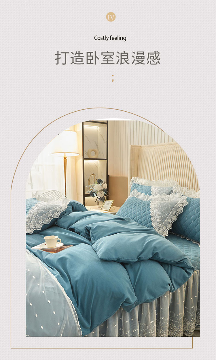 当前位置: 91家纺网 > 商品网购 > 床品套件 > 四件套 > 磨绒四件套 > 恋尚 2023新款纯色雪花绒夹棉蕾丝床裙四件套(四季款) 玫瑰公主-天蓝