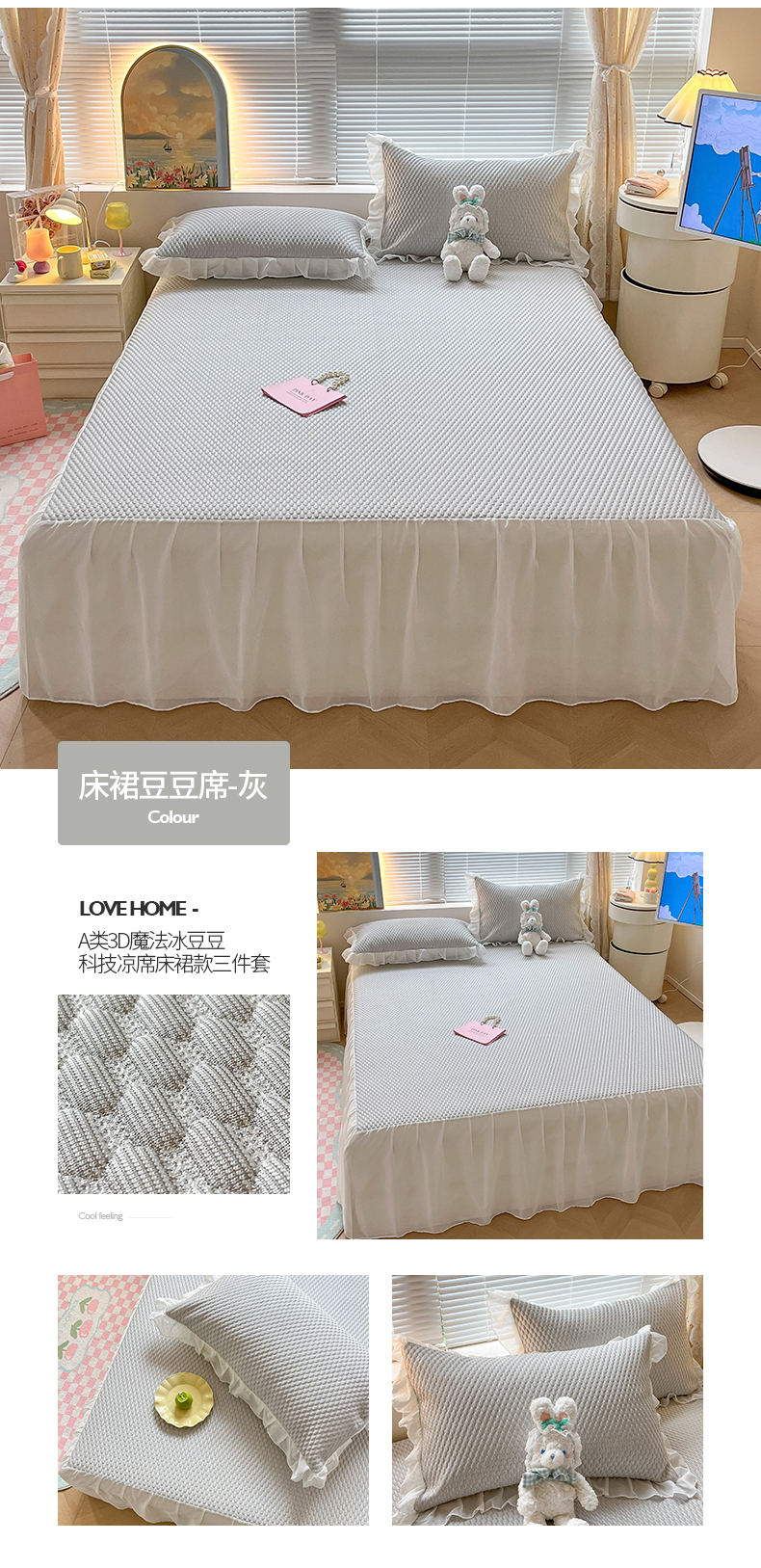 商品名称:2024新款A类3D魔法冰豆豆科技凉席床裙款三件套系列 床裙豆豆席-灰