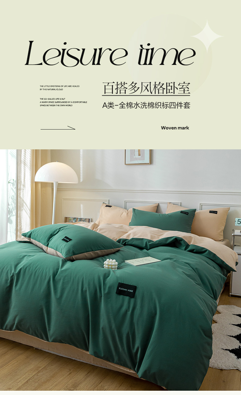 九沐良品 新款全棉水洗棉双拼款四件套学生三件套 简悠-松叶绿