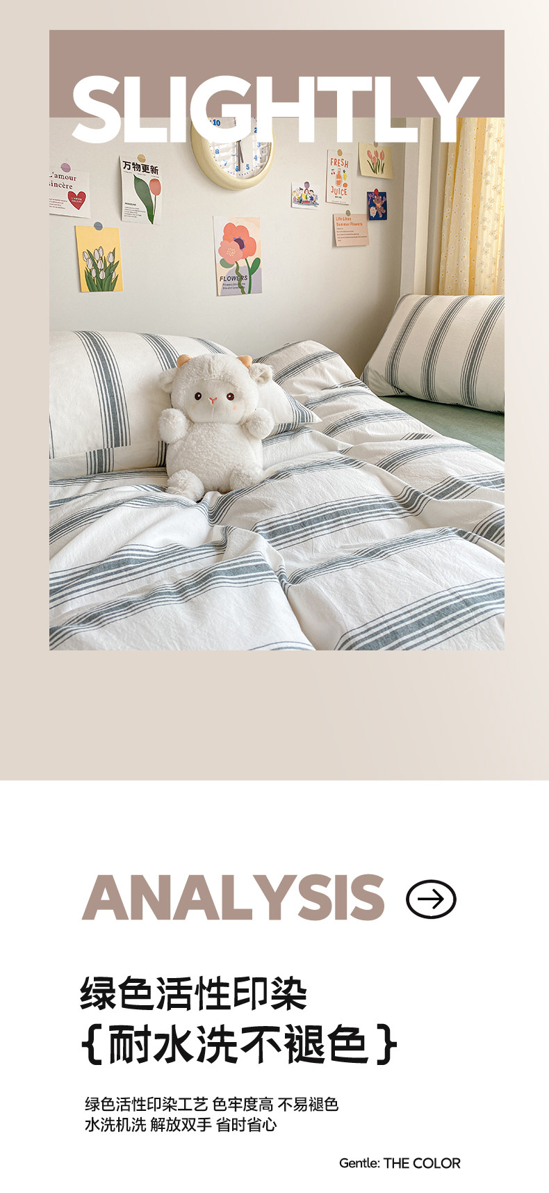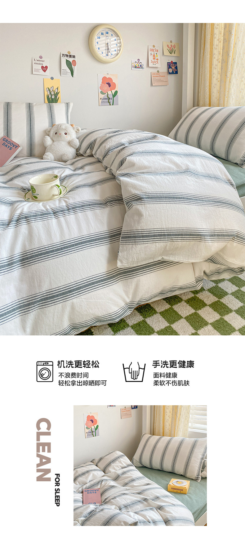 莱茵家居 2024新款色织全棉水洗棉学生床三件套 松小绿