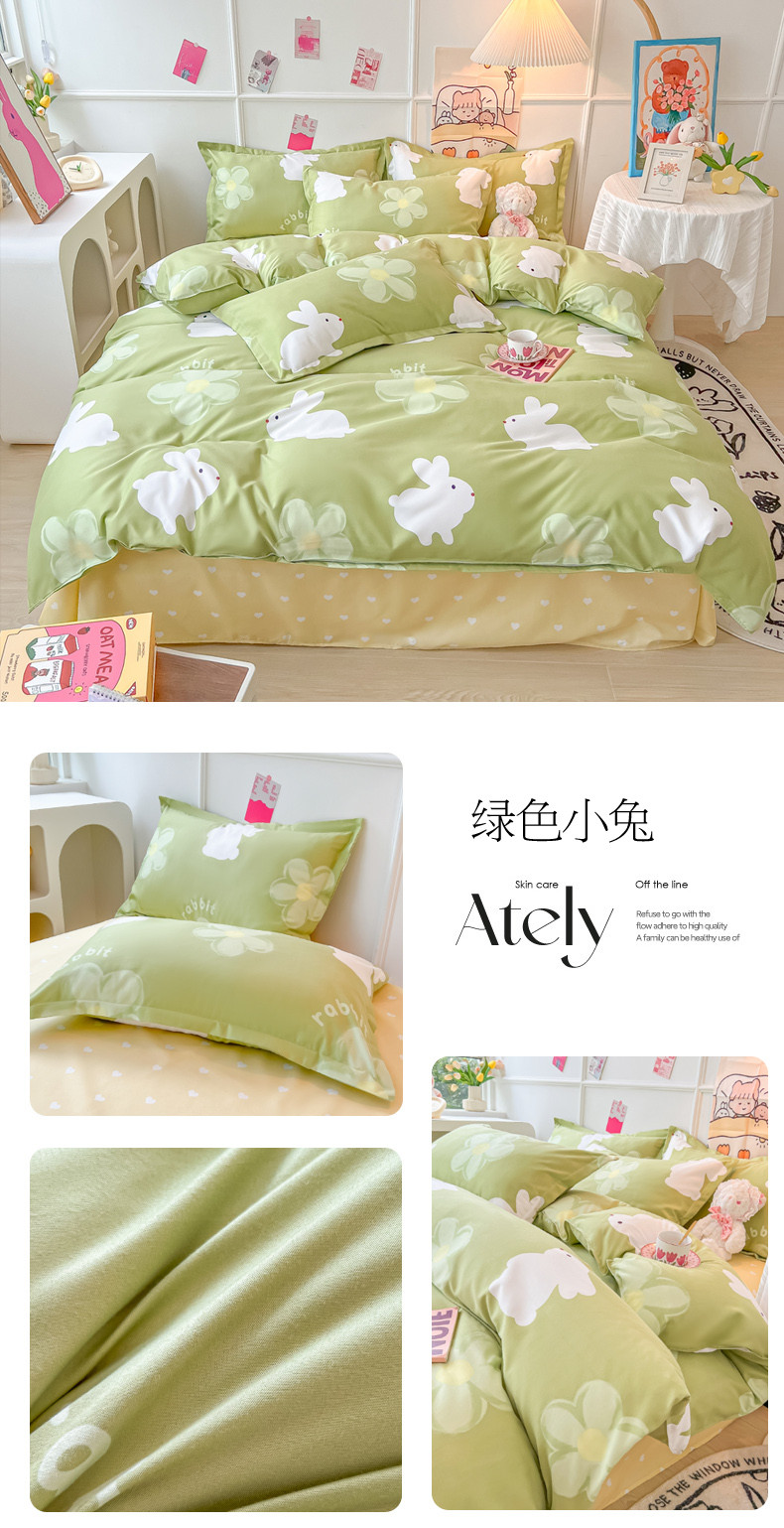 商品名称:花伞家居 2024直播网销斜纹加厚磨毛印花植物羊绒四件套 绿色小兔