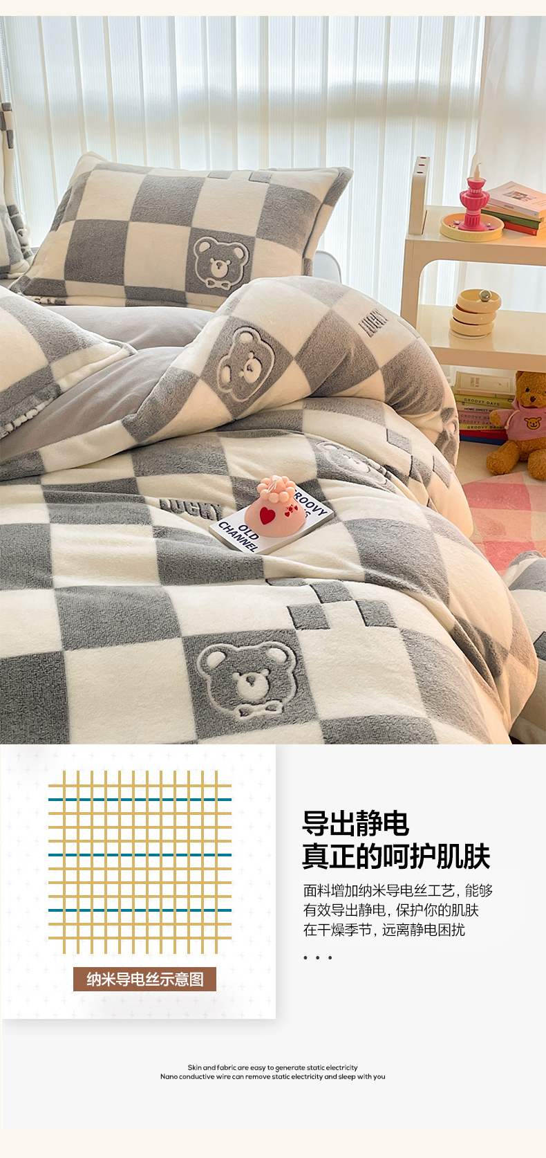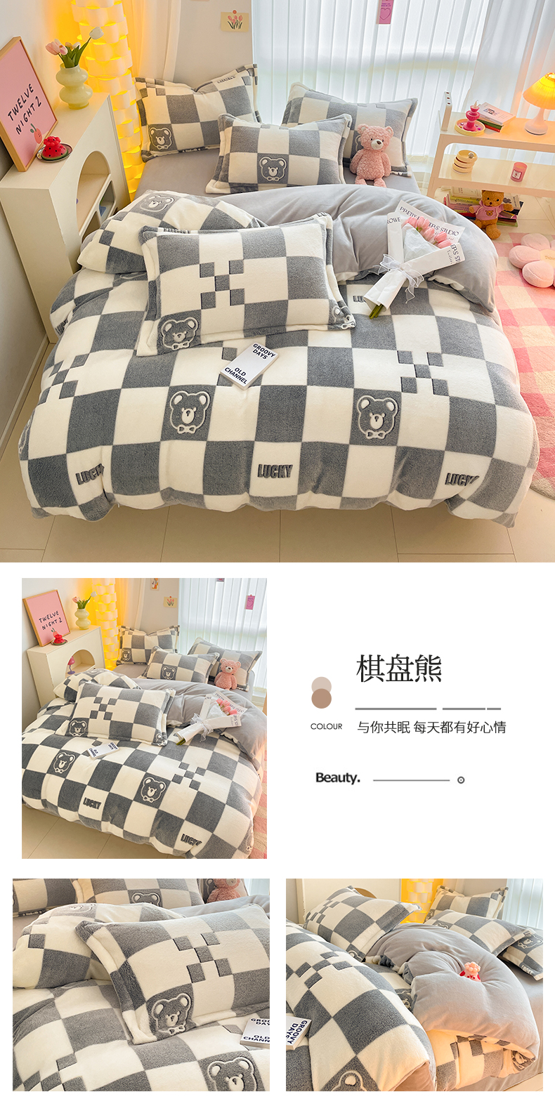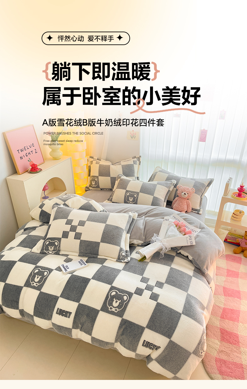 当前位置: 91家纺网 > 商品网购 > 床品套件 > 四件套 > 牛奶绒四件套 > 同田家纺 2024秋冬新品雪花绒牛奶绒印花四件套 棋盘熊