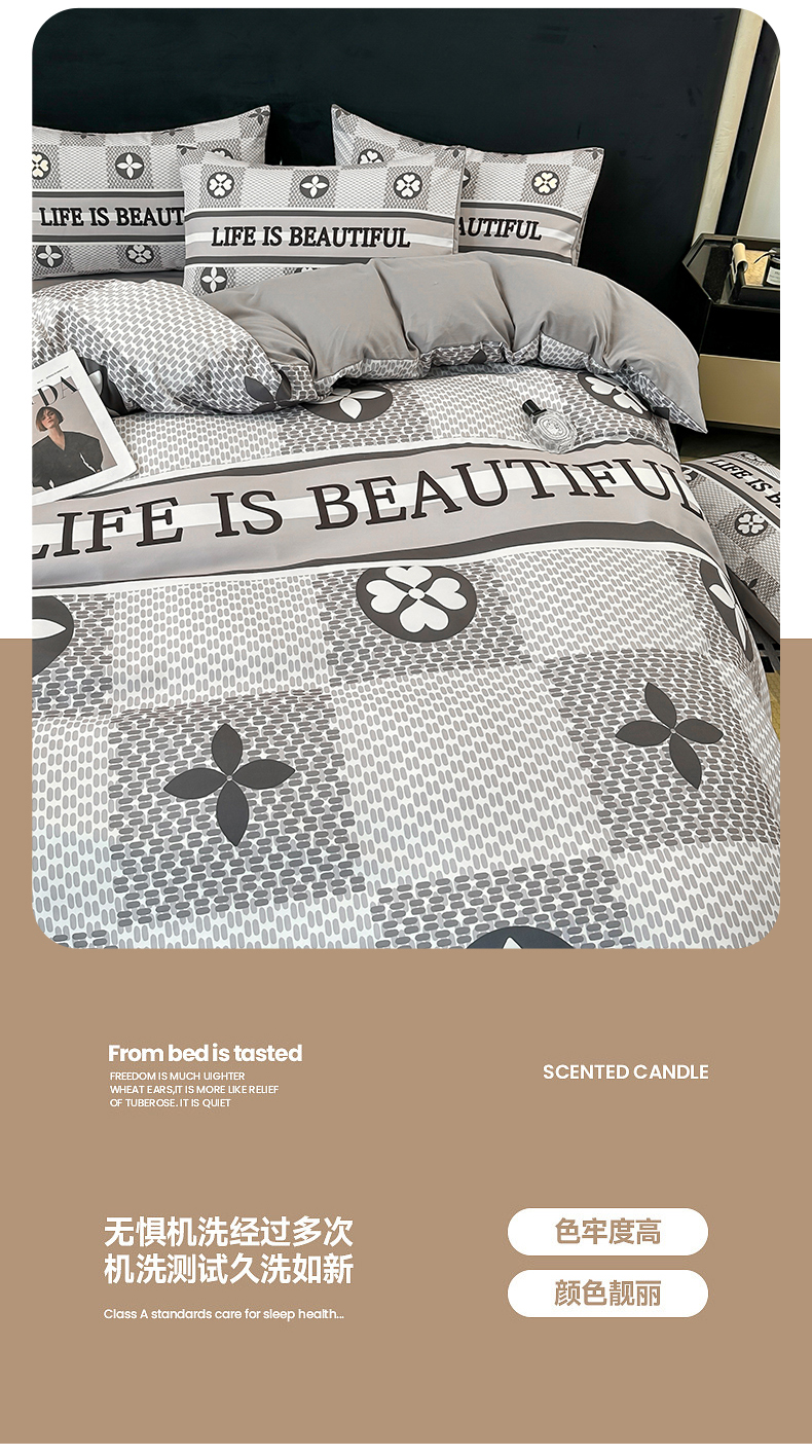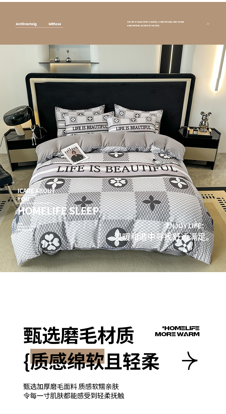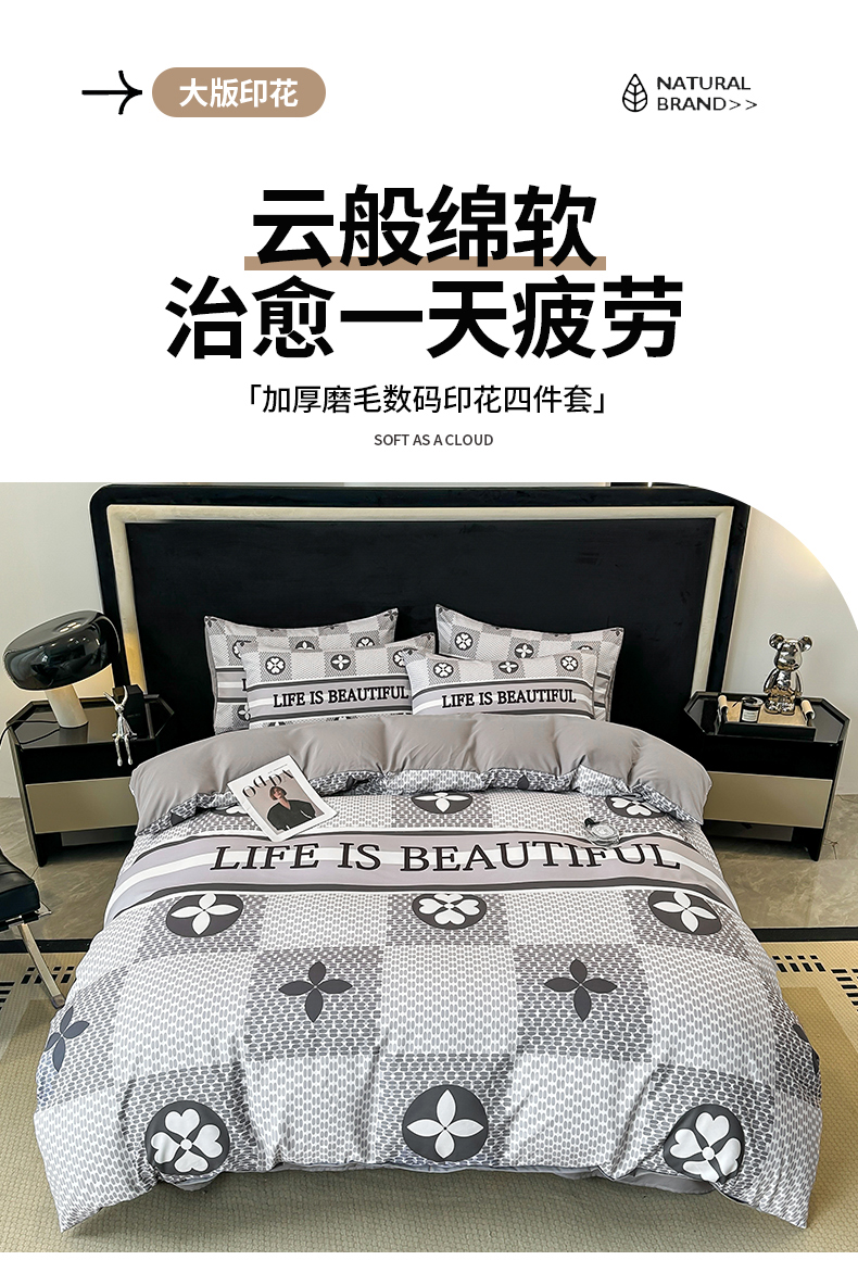 当前位置: 91家纺网 > 商品网购 > 床品套件 > 四件套 > 普通磨毛四件套 > 色鬼布艺 2023新款加厚双面磨毛数码大版印花四件套 四叶草-灰