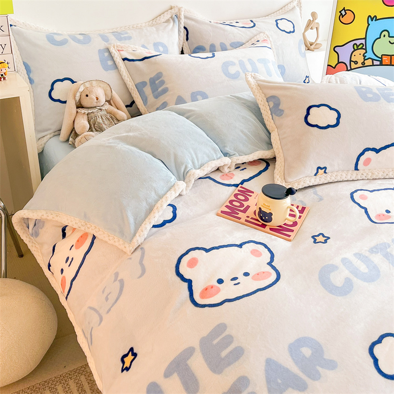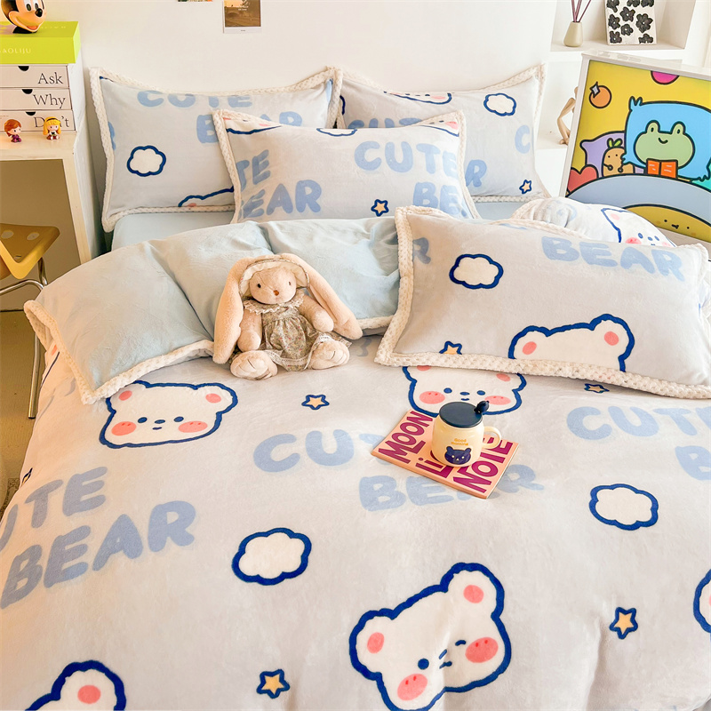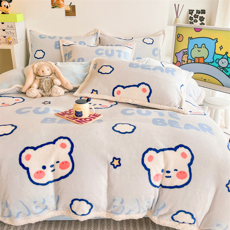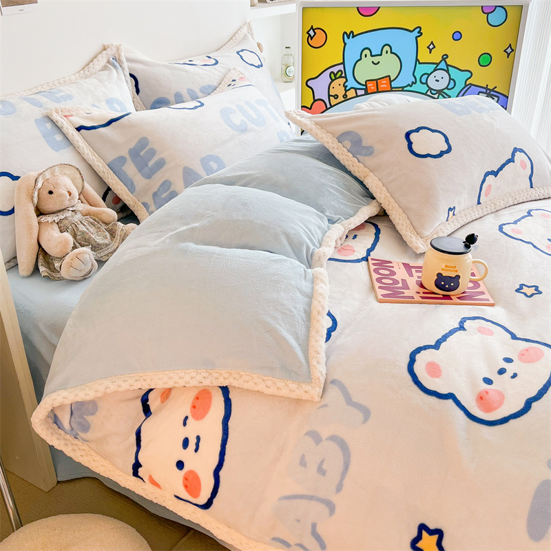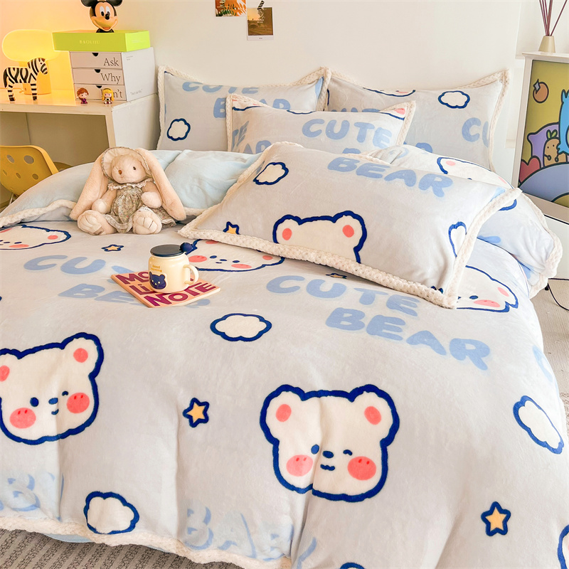 川悦生活 2023新款牛奶绒200克宽边四件套 宽边萌朵小熊