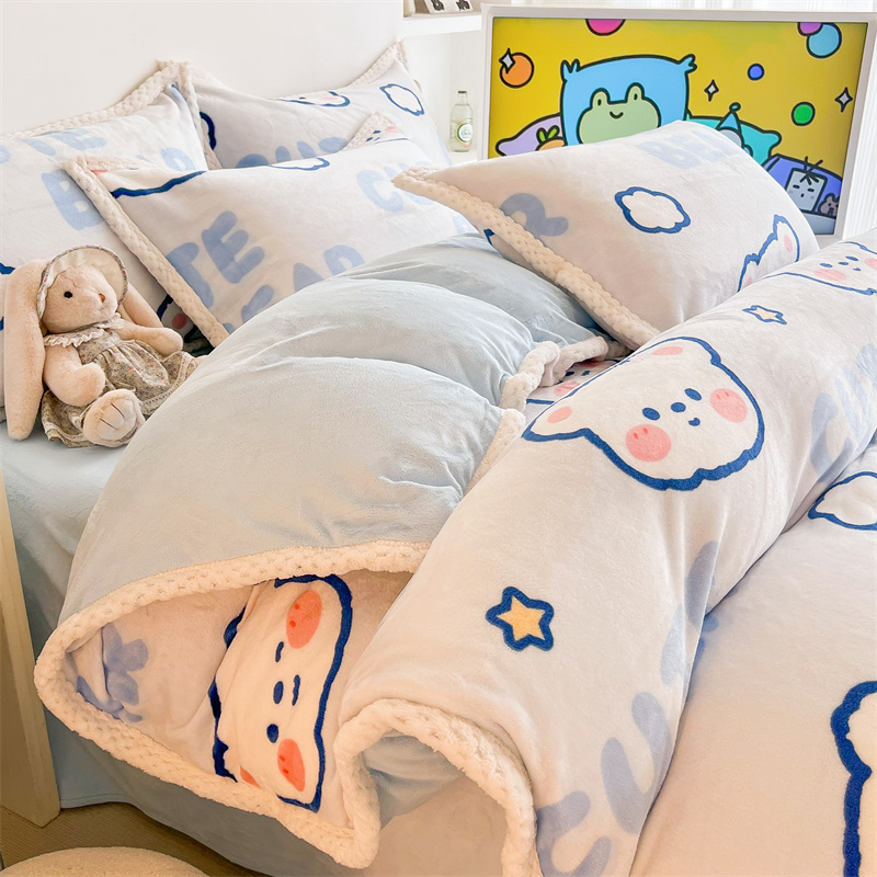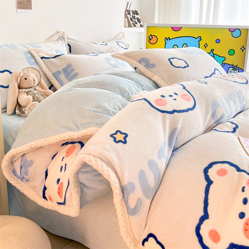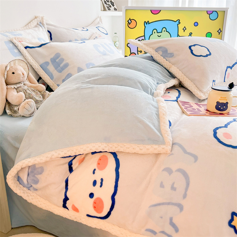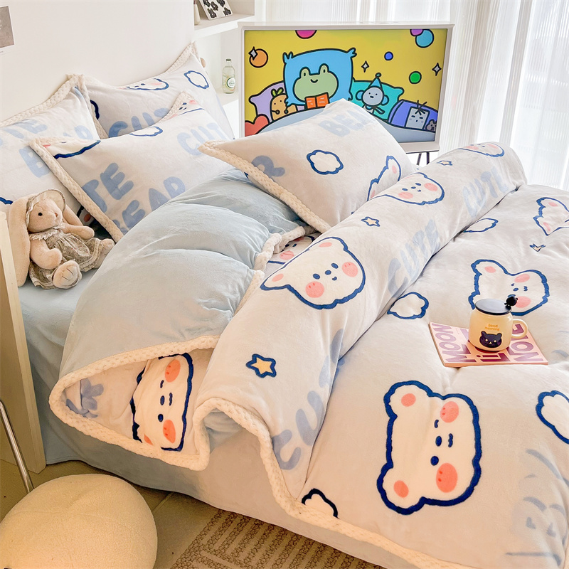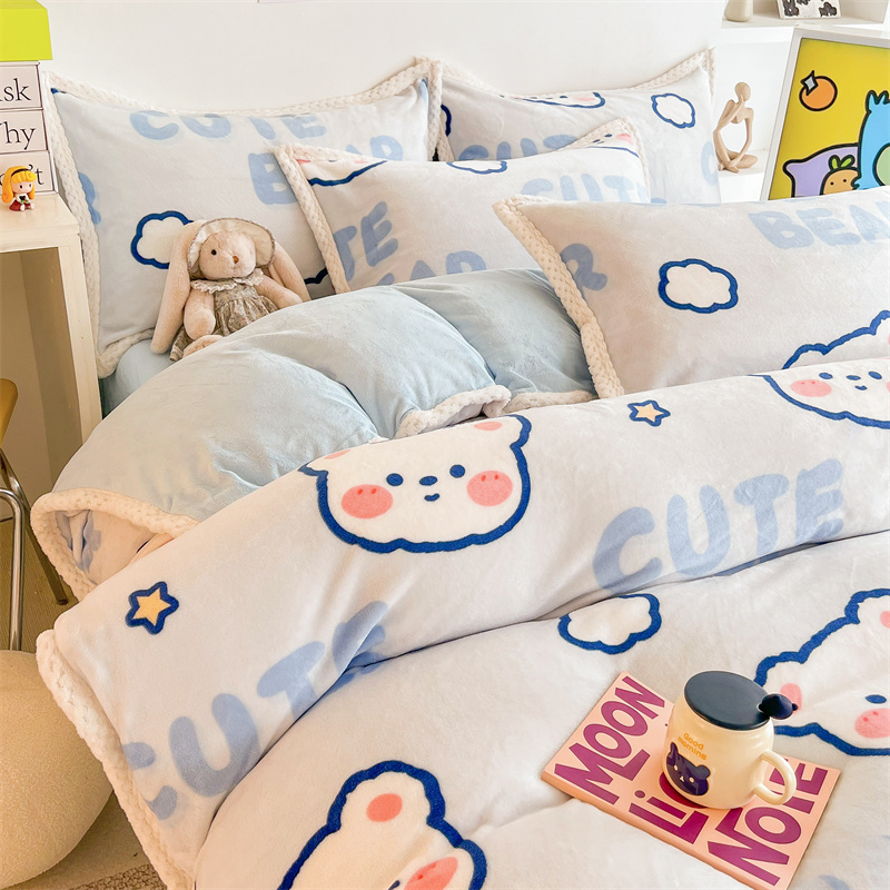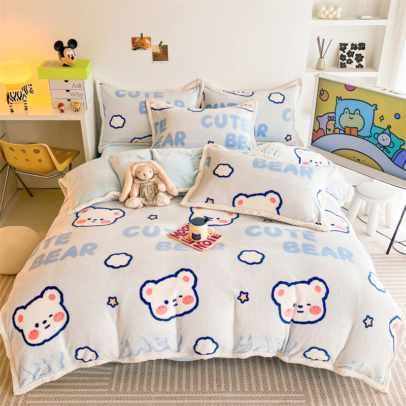 川悦生活 2023新款牛奶绒200克宽边四件套 宽边萌朵小熊