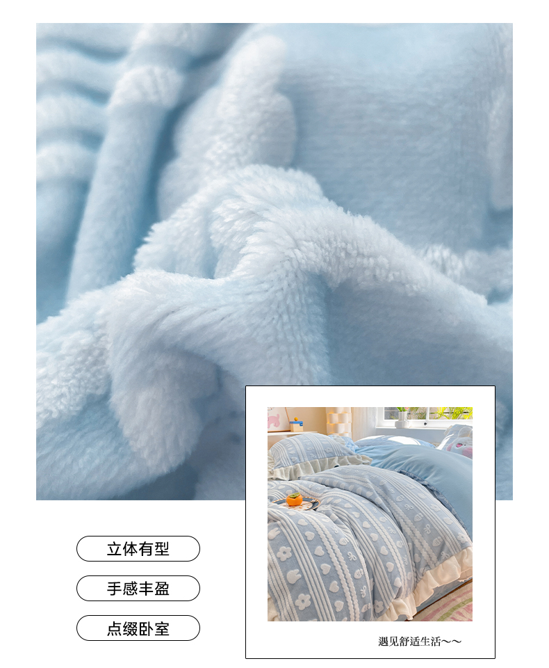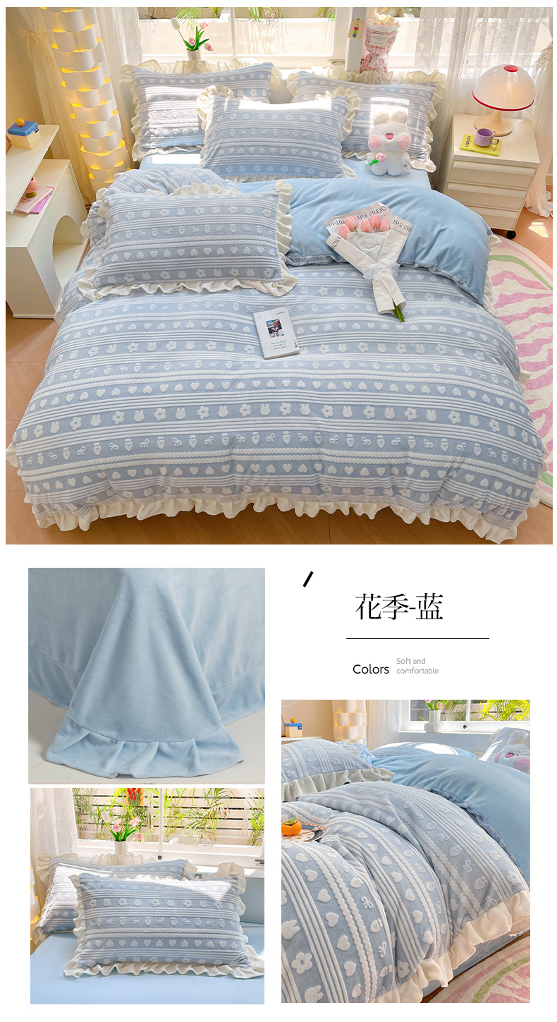 商品名称:如一 2023新款直播荷叶边雕花牛奶绒吊边床单工艺四件套 法莱绒珊瑚绒套件 花季-蓝
