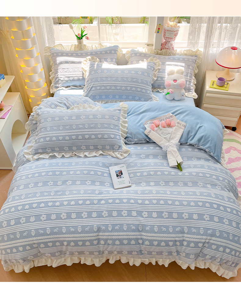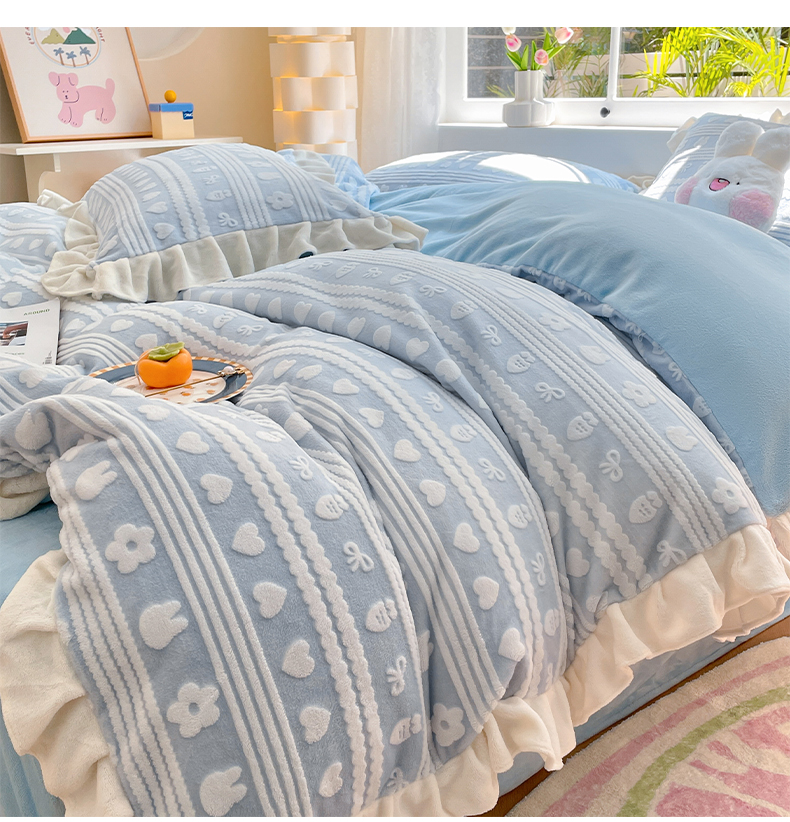 如一 2023新款直播荷叶边雕花牛奶绒吊边床单工艺四件套 法莱绒珊瑚绒套件 花季-蓝
