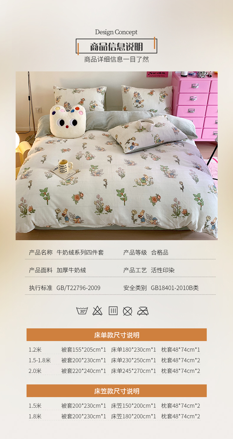 商品名称:桃子家居 2023新款ins少女甜酷多巴胺粉墨加厚牛奶绒系列四件套 绒-彼得兔花园