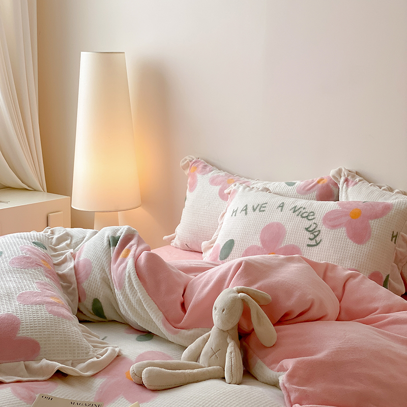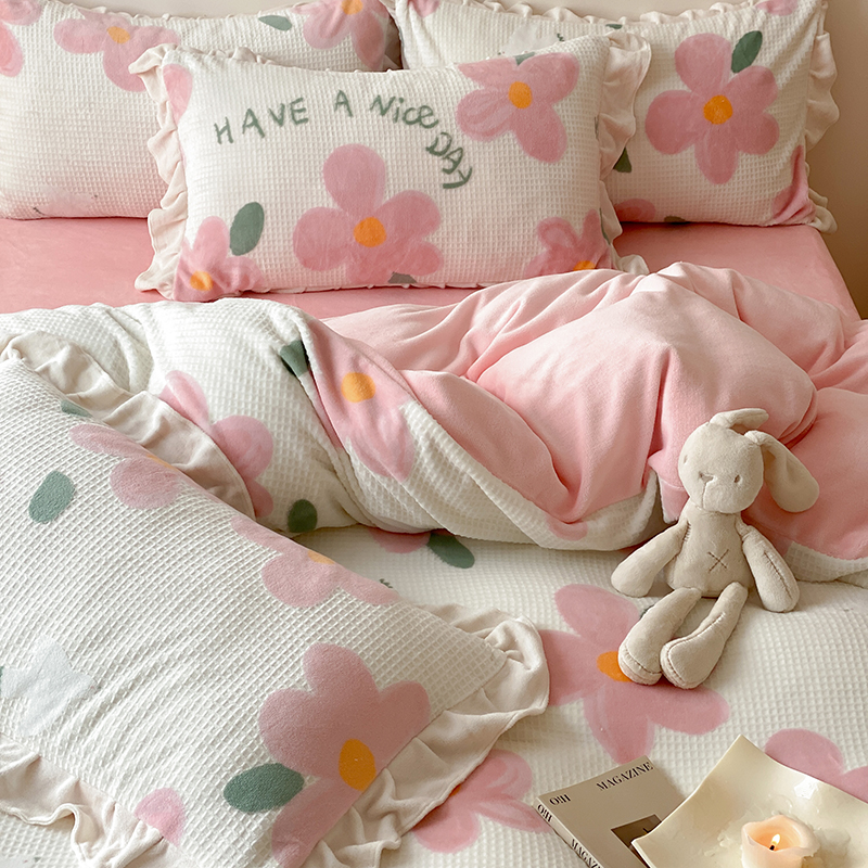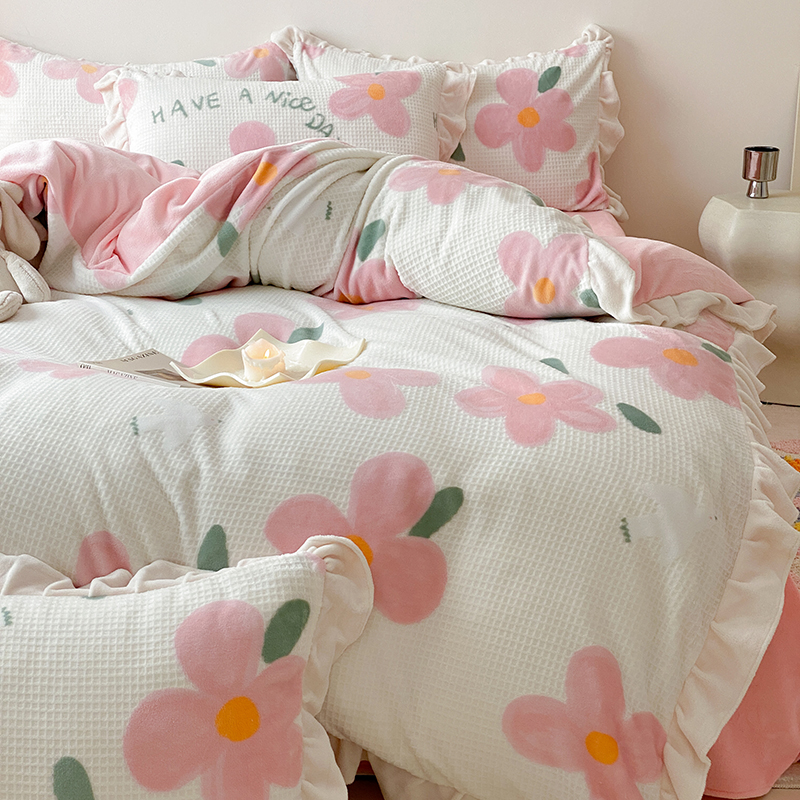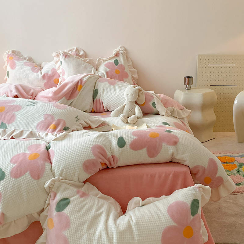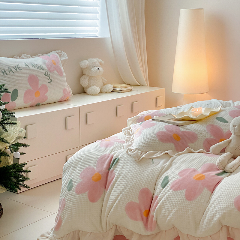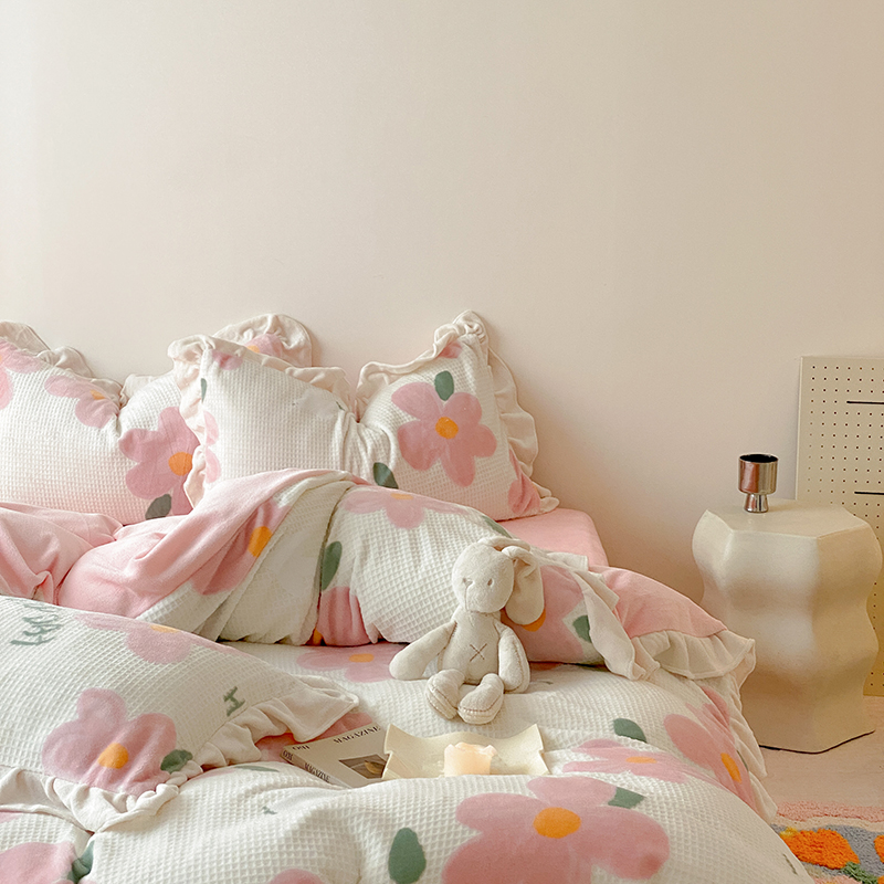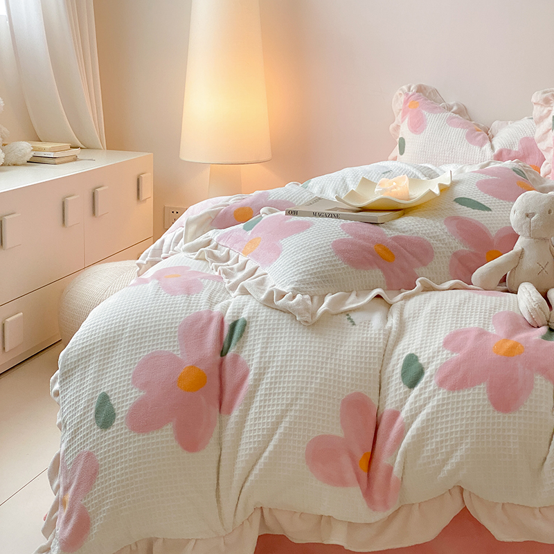 潘朵拉家纺 2023新款雕花韩式华夫格花边牛奶绒四件套 淡妆初夏