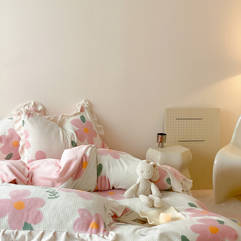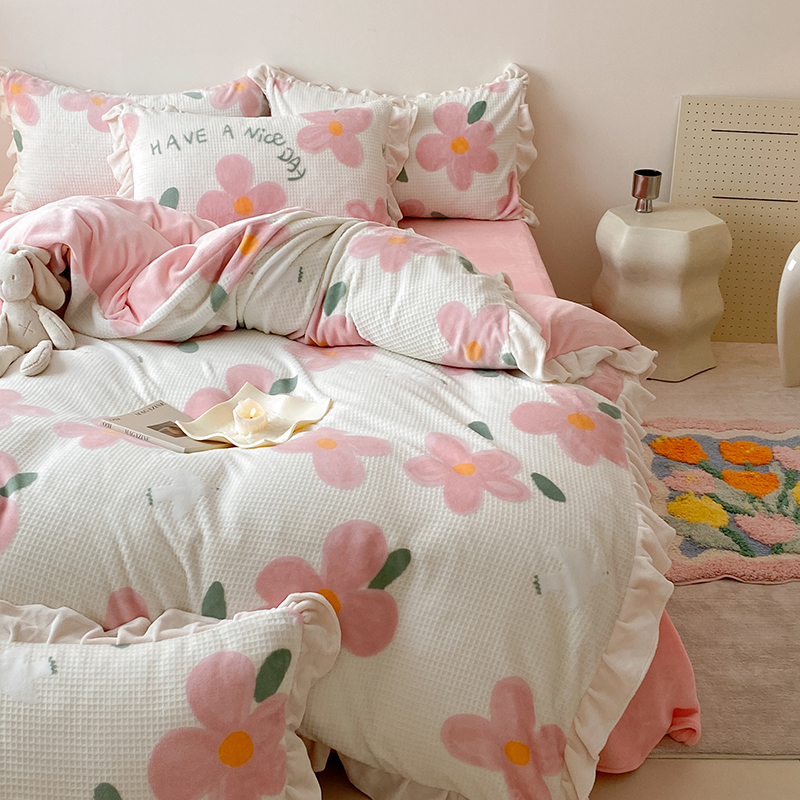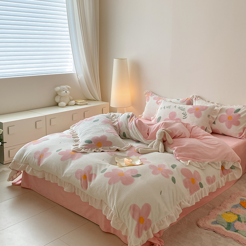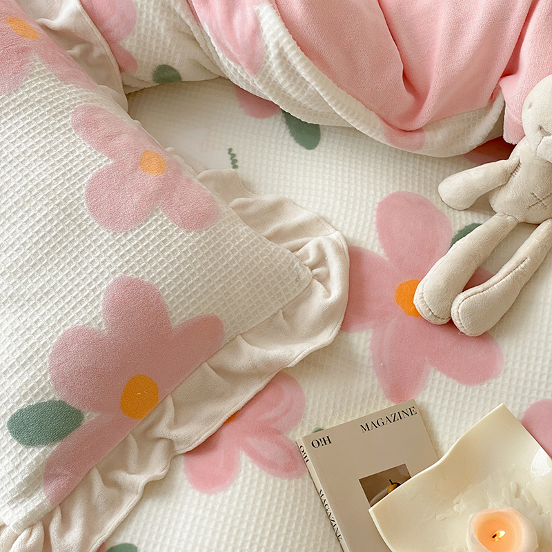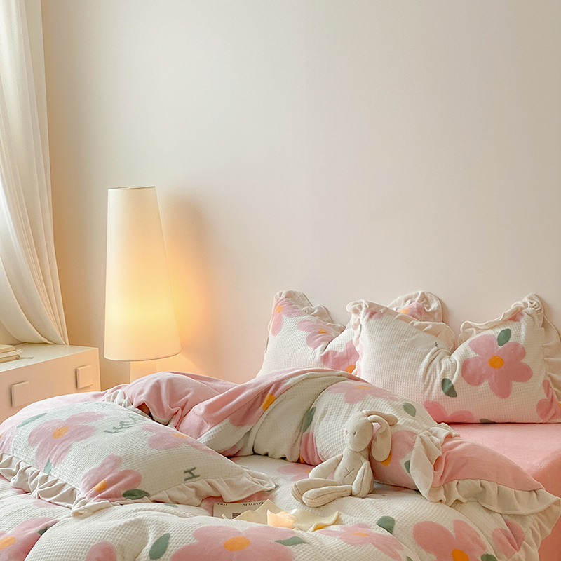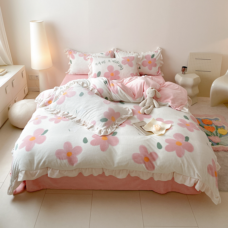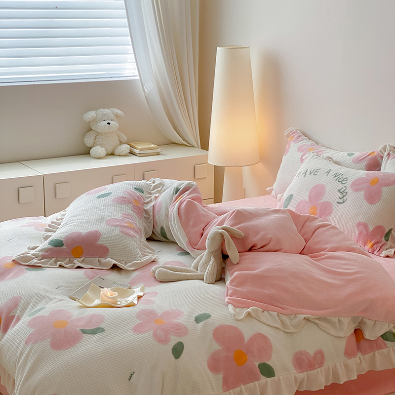 潘朵拉家纺 2023新款雕花韩式华夫格花边牛奶绒四件套 淡妆初夏