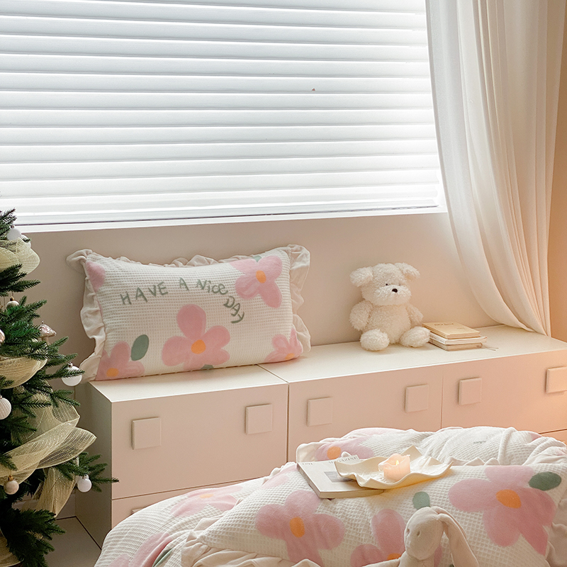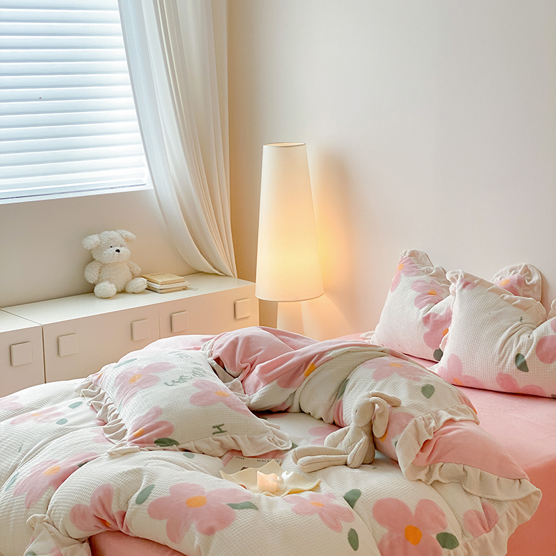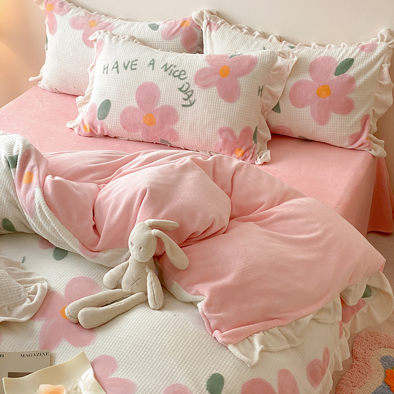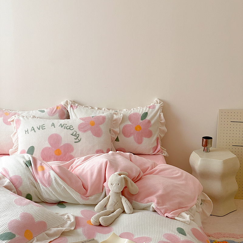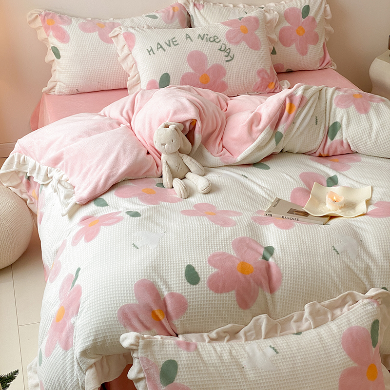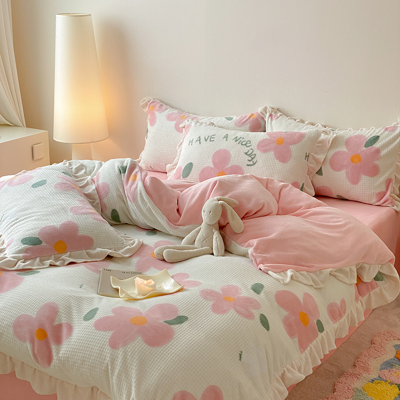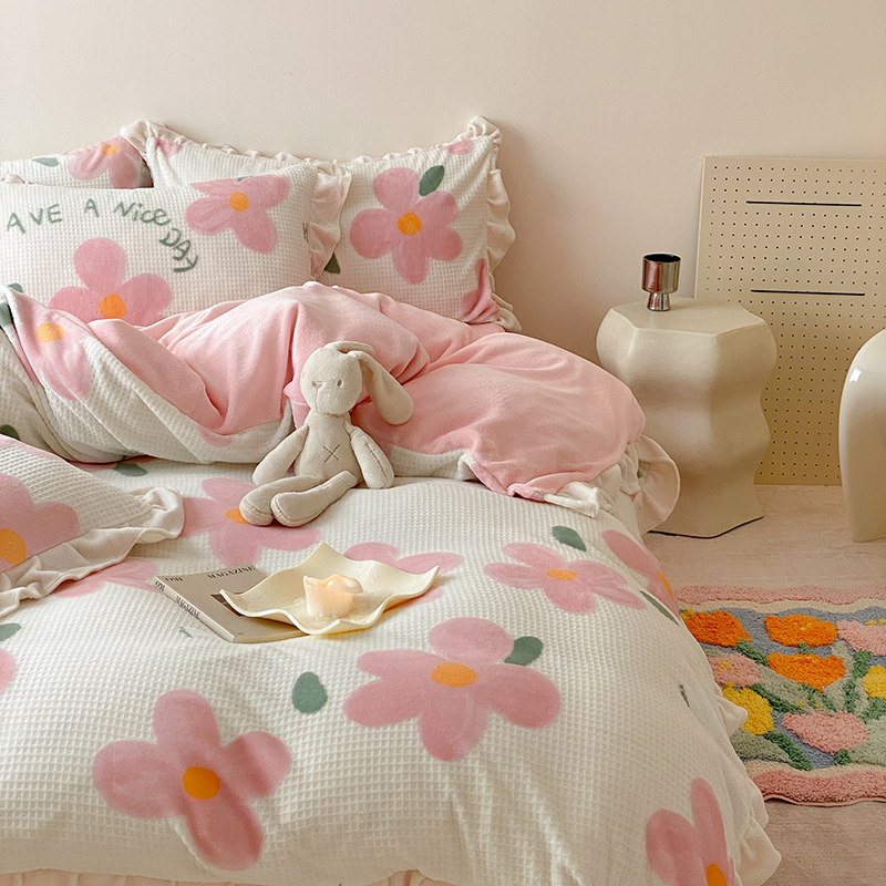 潘朵拉家纺 2023新款雕花韩式华夫格花边牛奶绒四件套 淡妆初夏