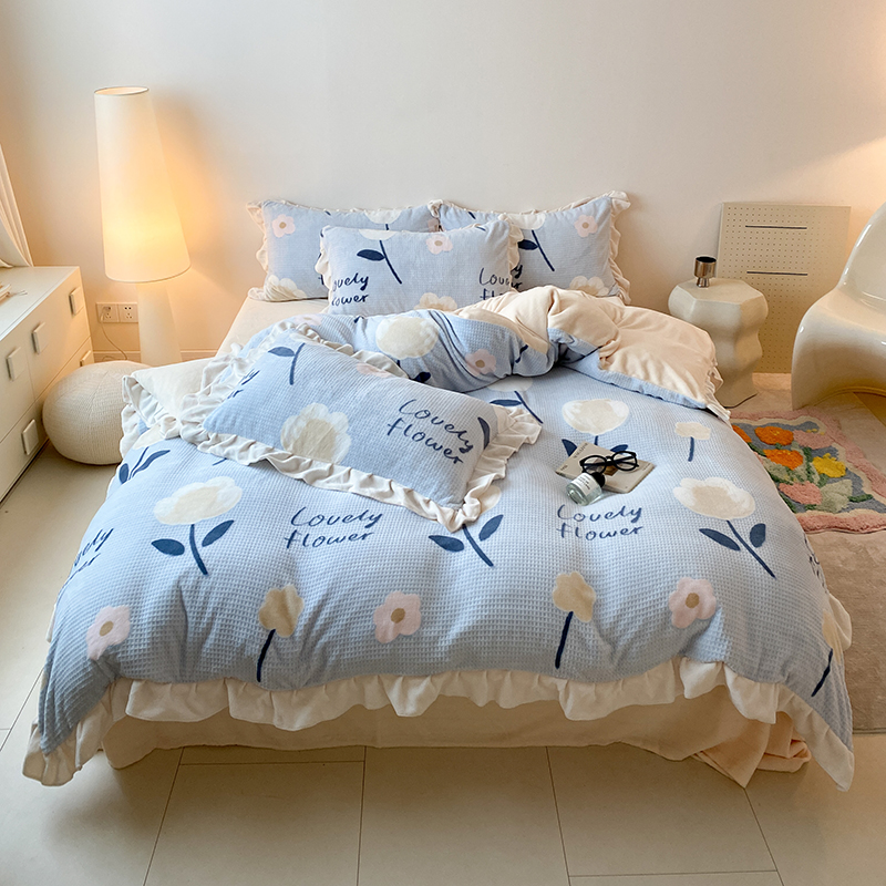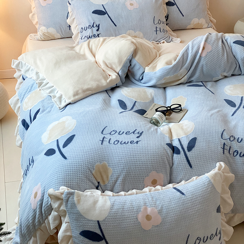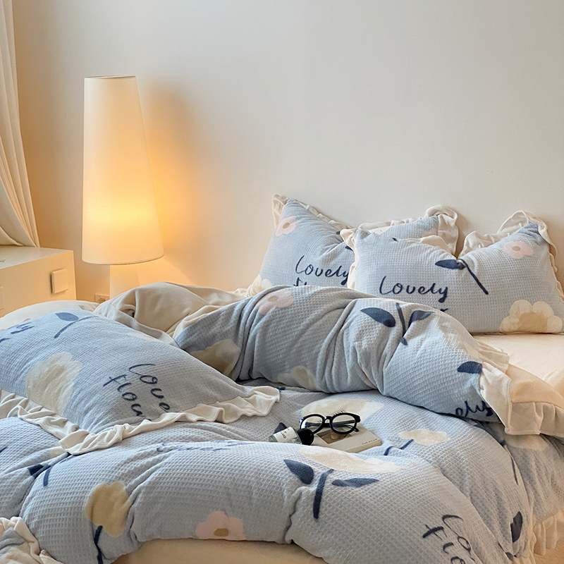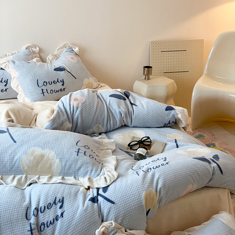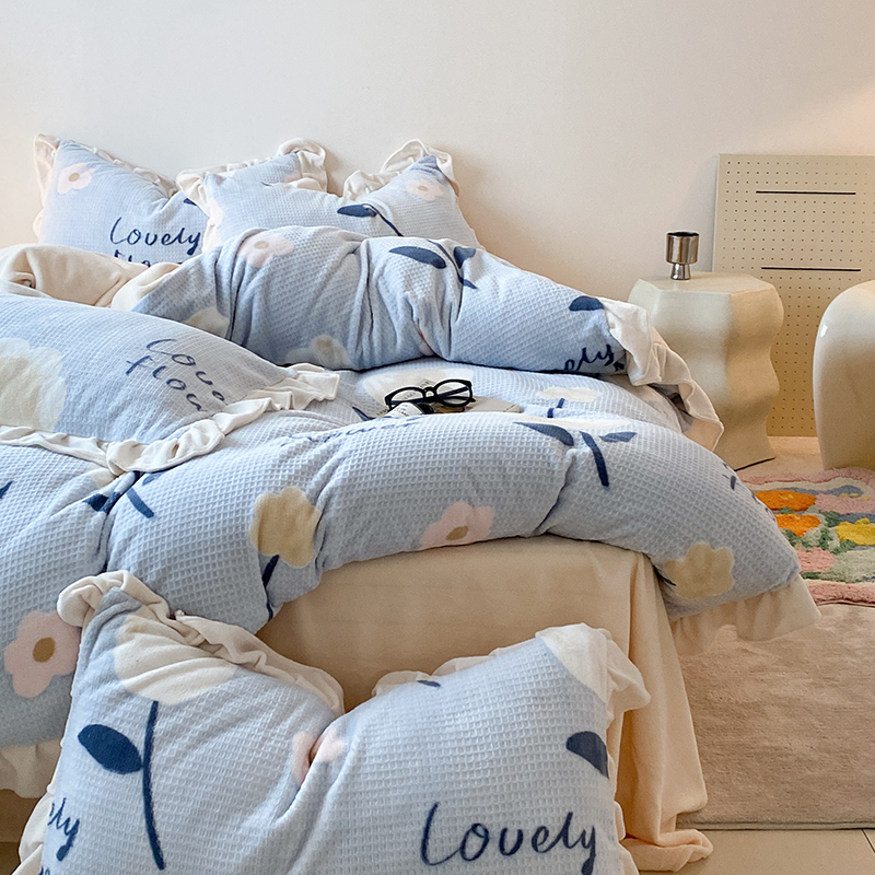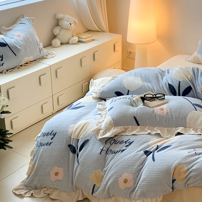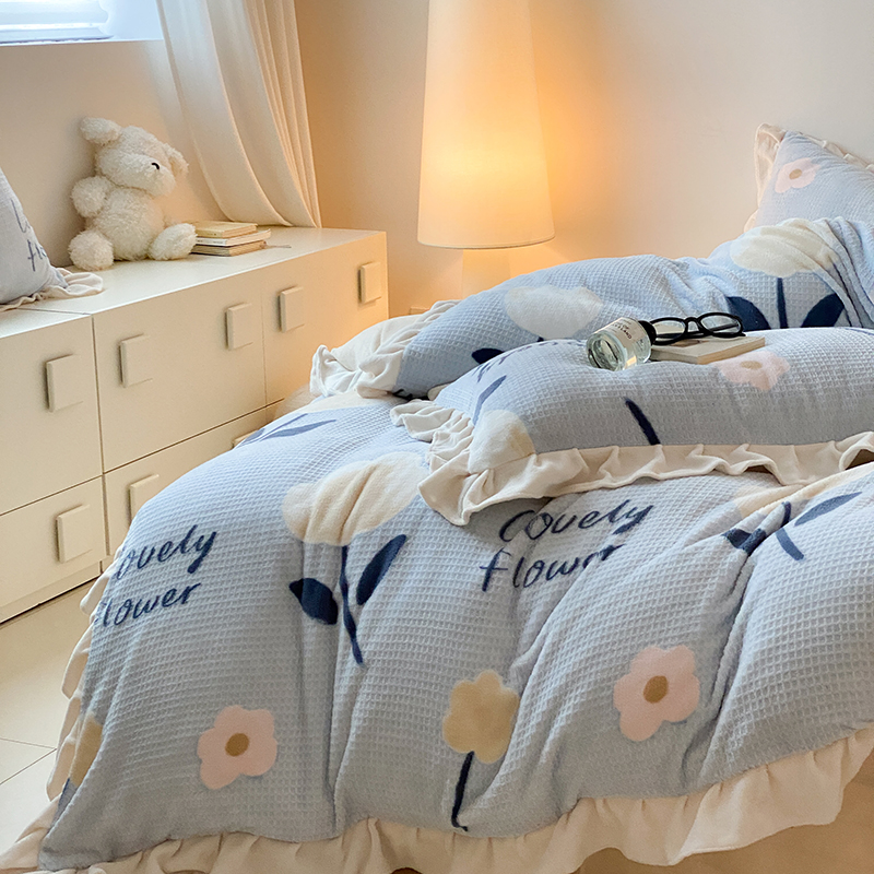 潘朵拉家纺 2023新款雕花韩式华夫格花边牛奶绒四件套 小情调(蓝)