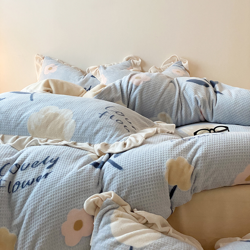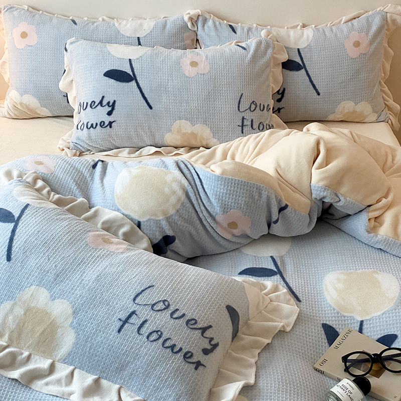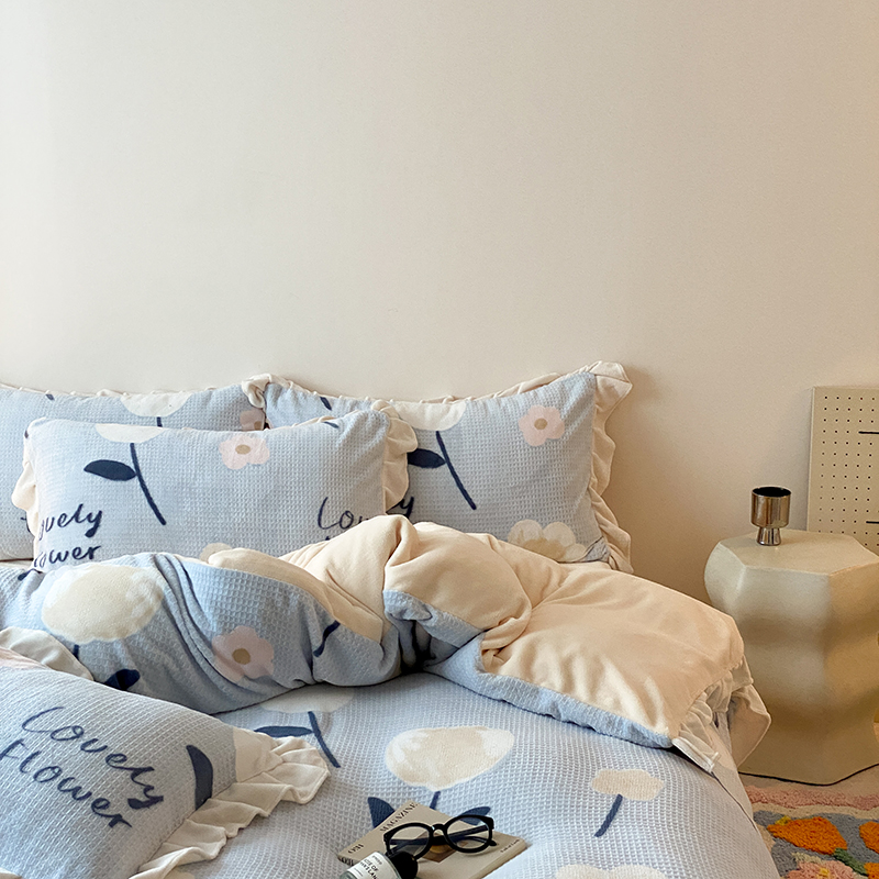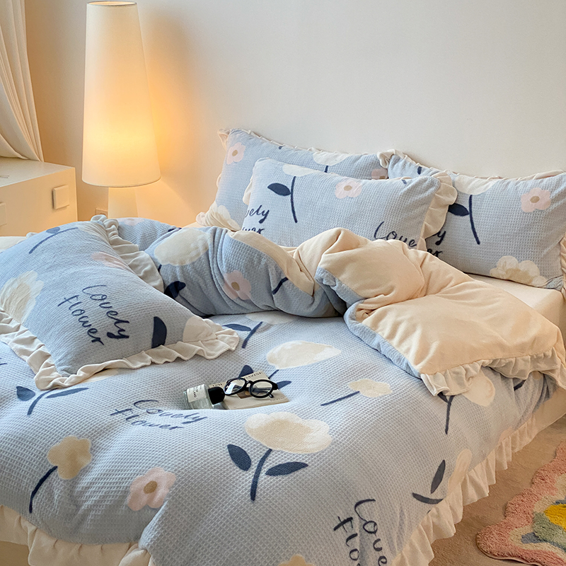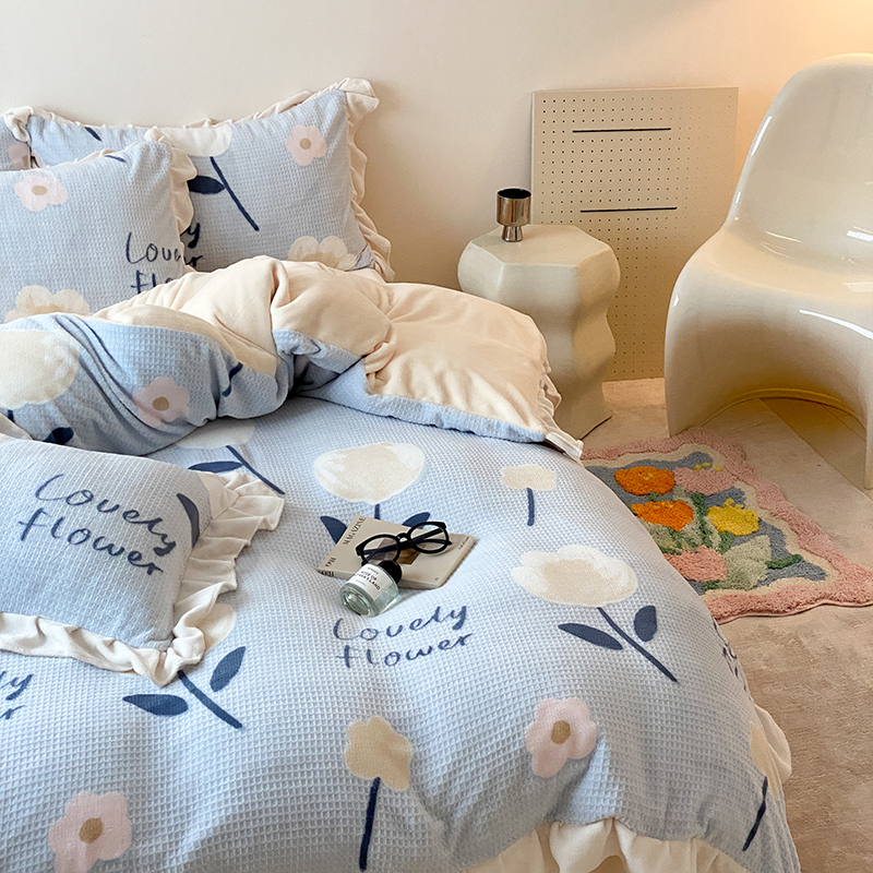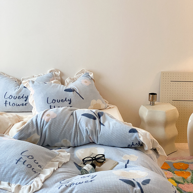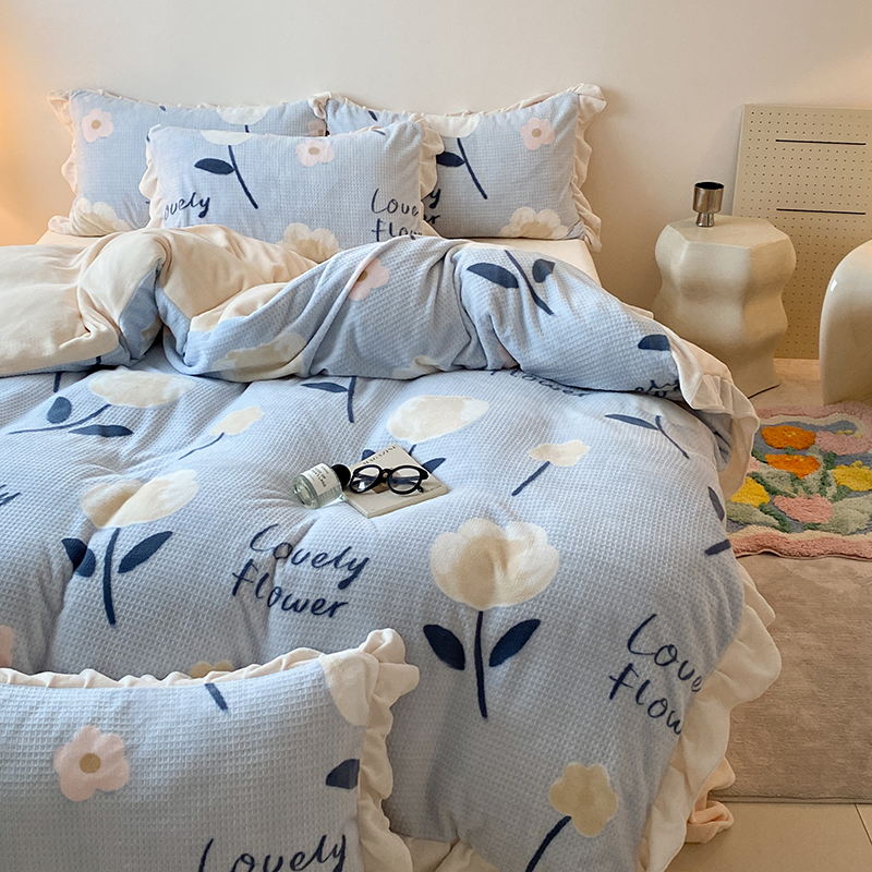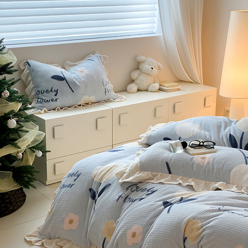 潘朵拉家纺 2023新款雕花韩式华夫格花边牛奶绒四件套 小情调(蓝)
