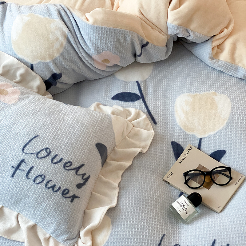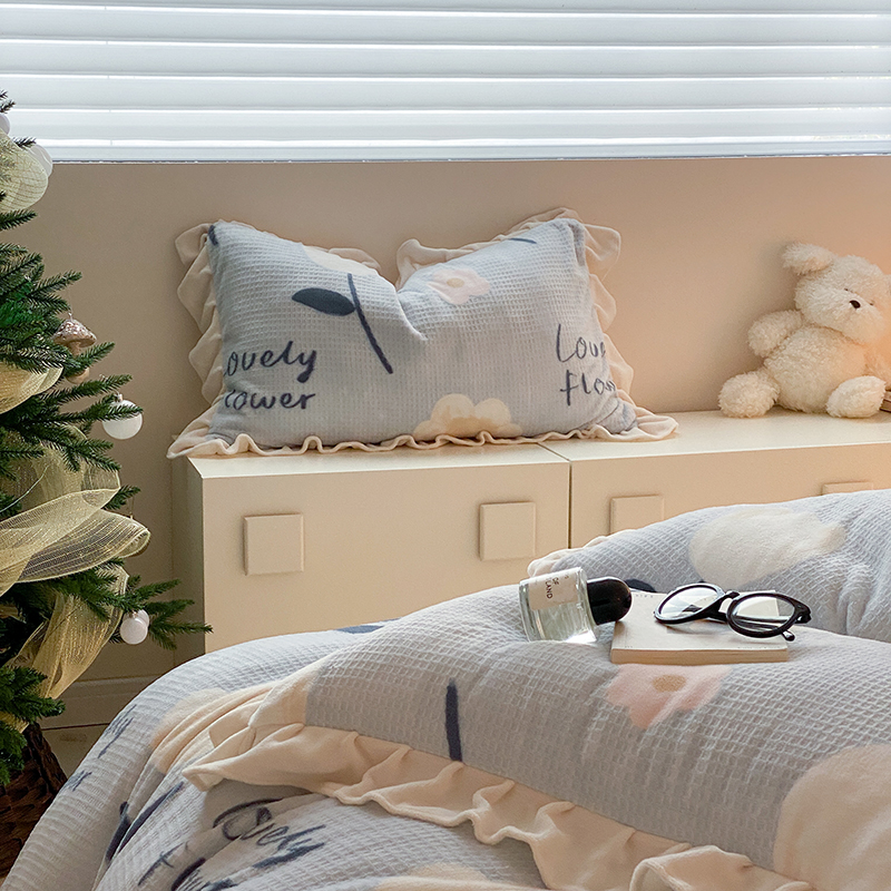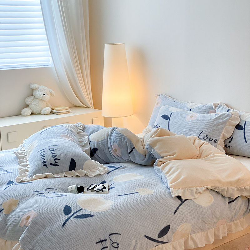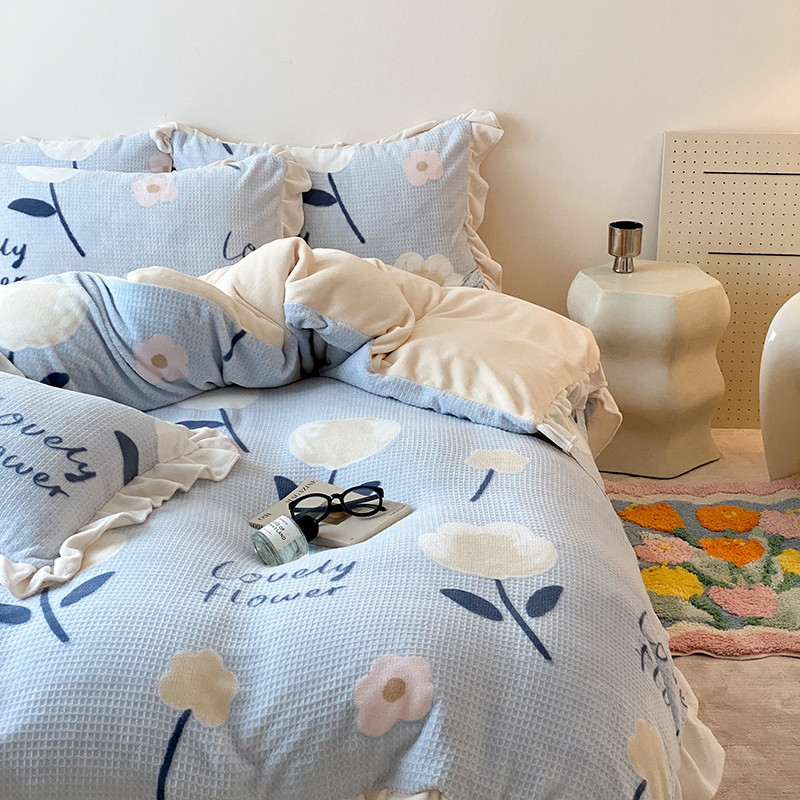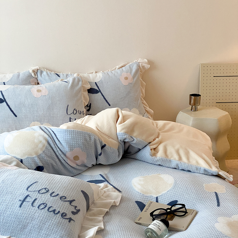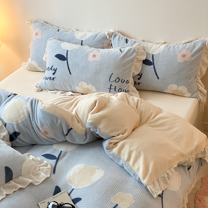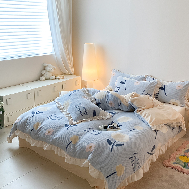 潘朵拉家纺 2023新款雕花韩式华夫格花边牛奶绒四件套 小情调(蓝)