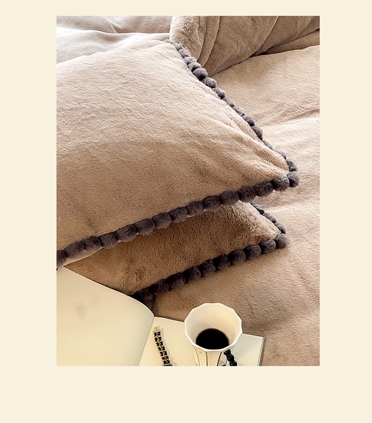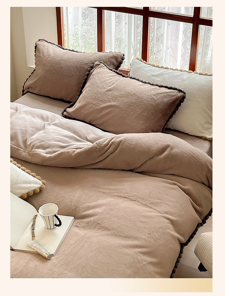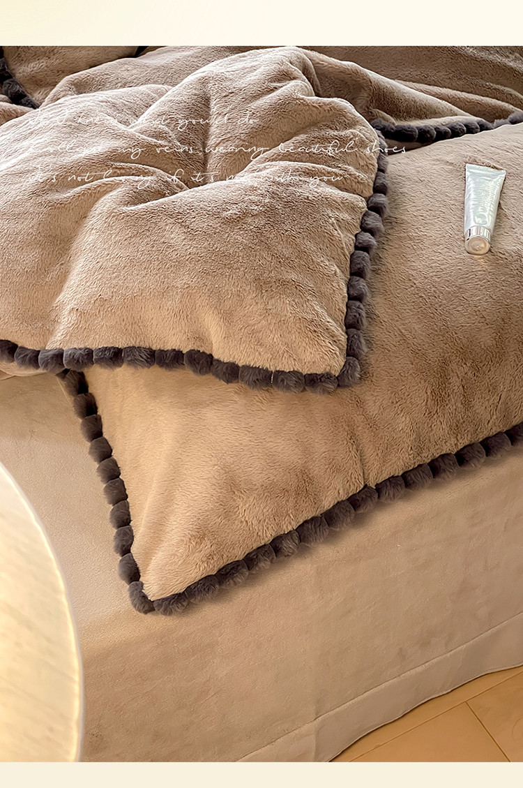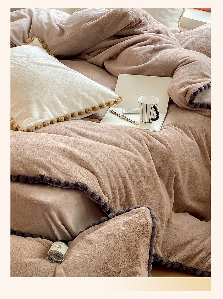 商品名称:名品优仓 2023新款兔绒边带球球款纯色系列四件套-兔绒球球 兔绒球球-摩卡咖