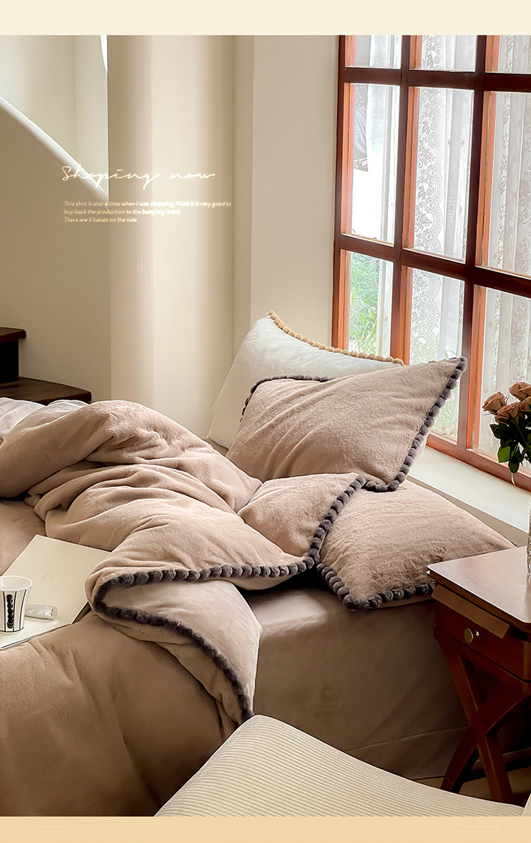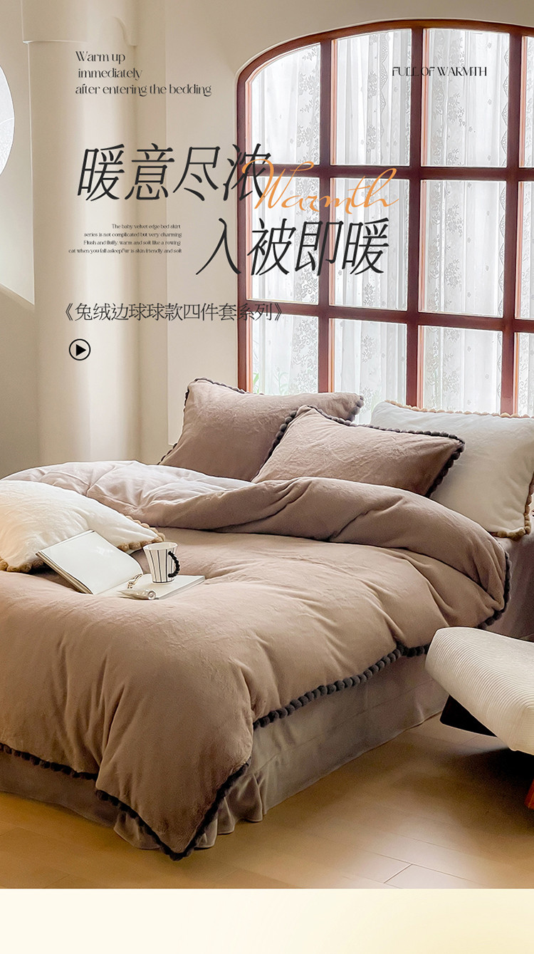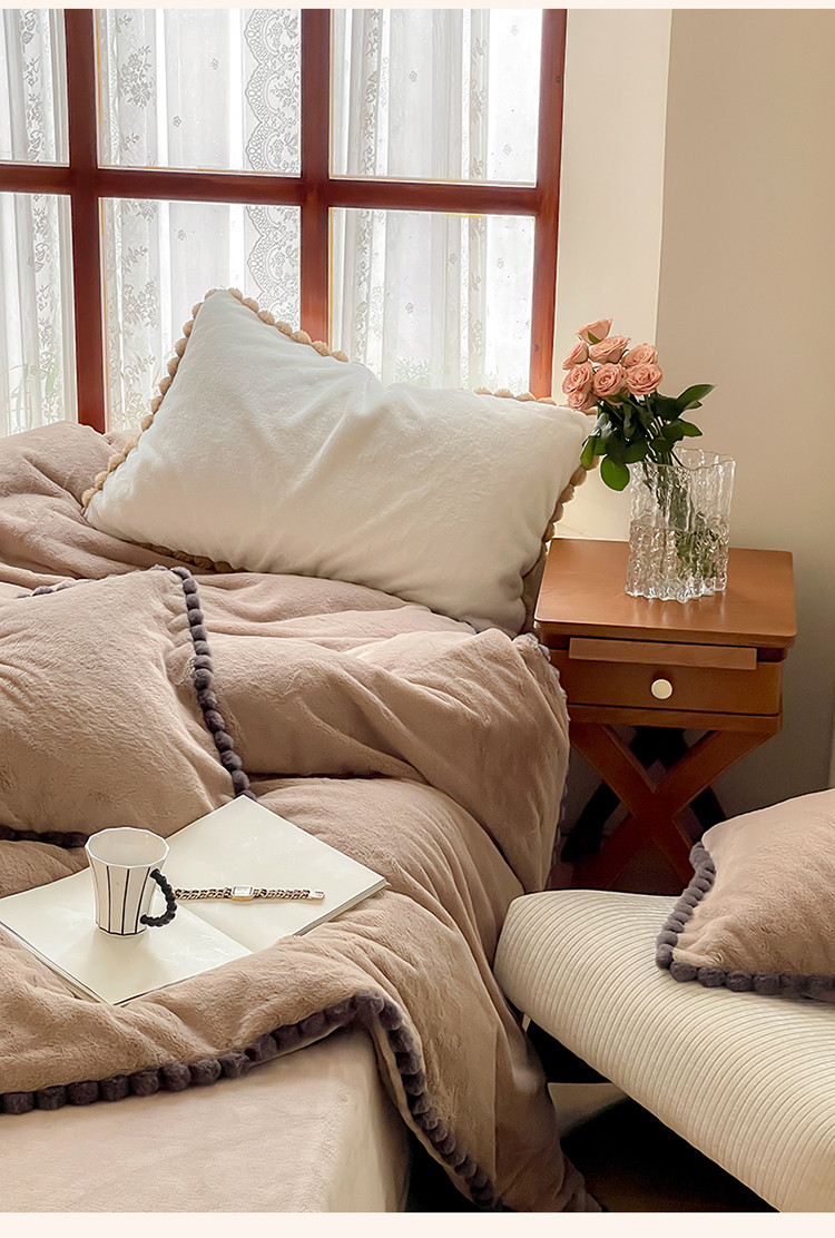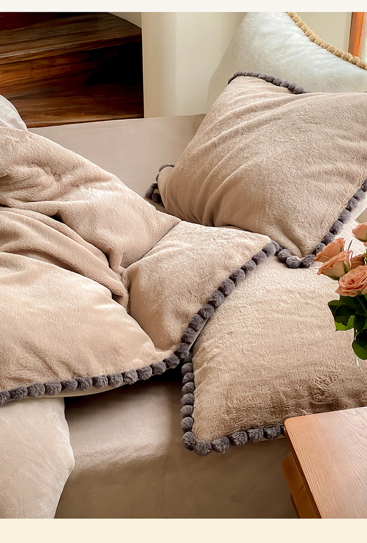 商品名称:名品优仓 2023新款兔绒边带球球款纯色系列四件套-兔绒球球 兔绒球球-摩卡咖