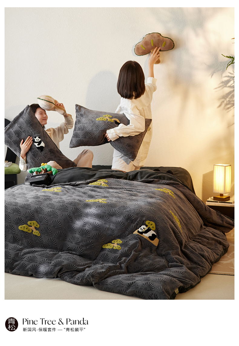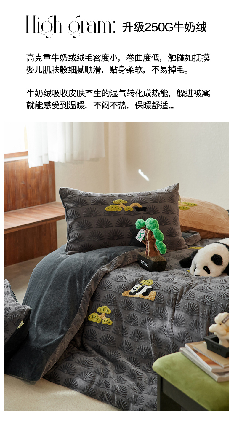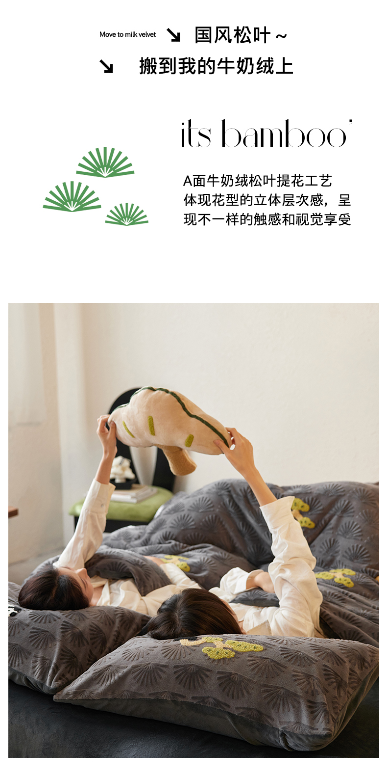 当前位置: 91家纺网 > 商品网购 > 床品套件 > 四件套 > 牛奶绒四件套 > 安莱生活 2023新款雕花绒牛奶绒毛巾绣“青松躺平”四件套放青松-黑松